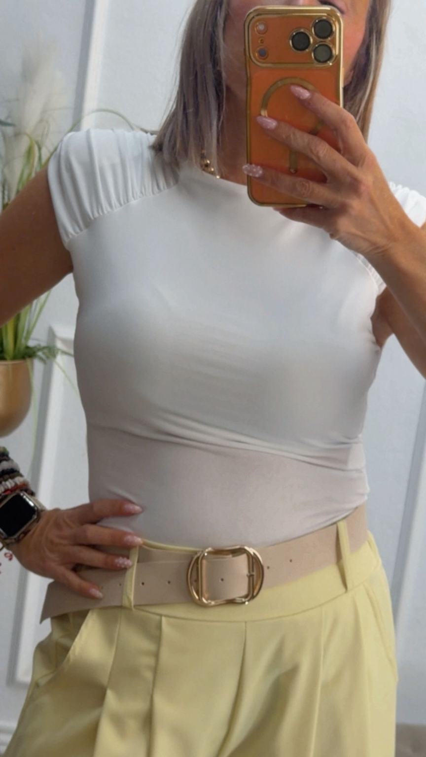 Body sin mangas, color blanco, con pliegues en los hombros. Tiene hombreras.