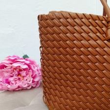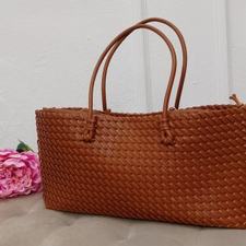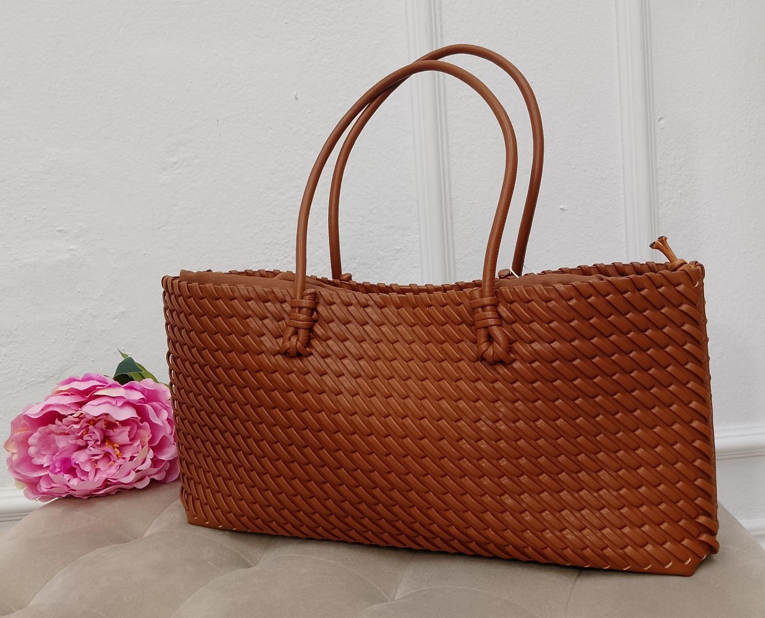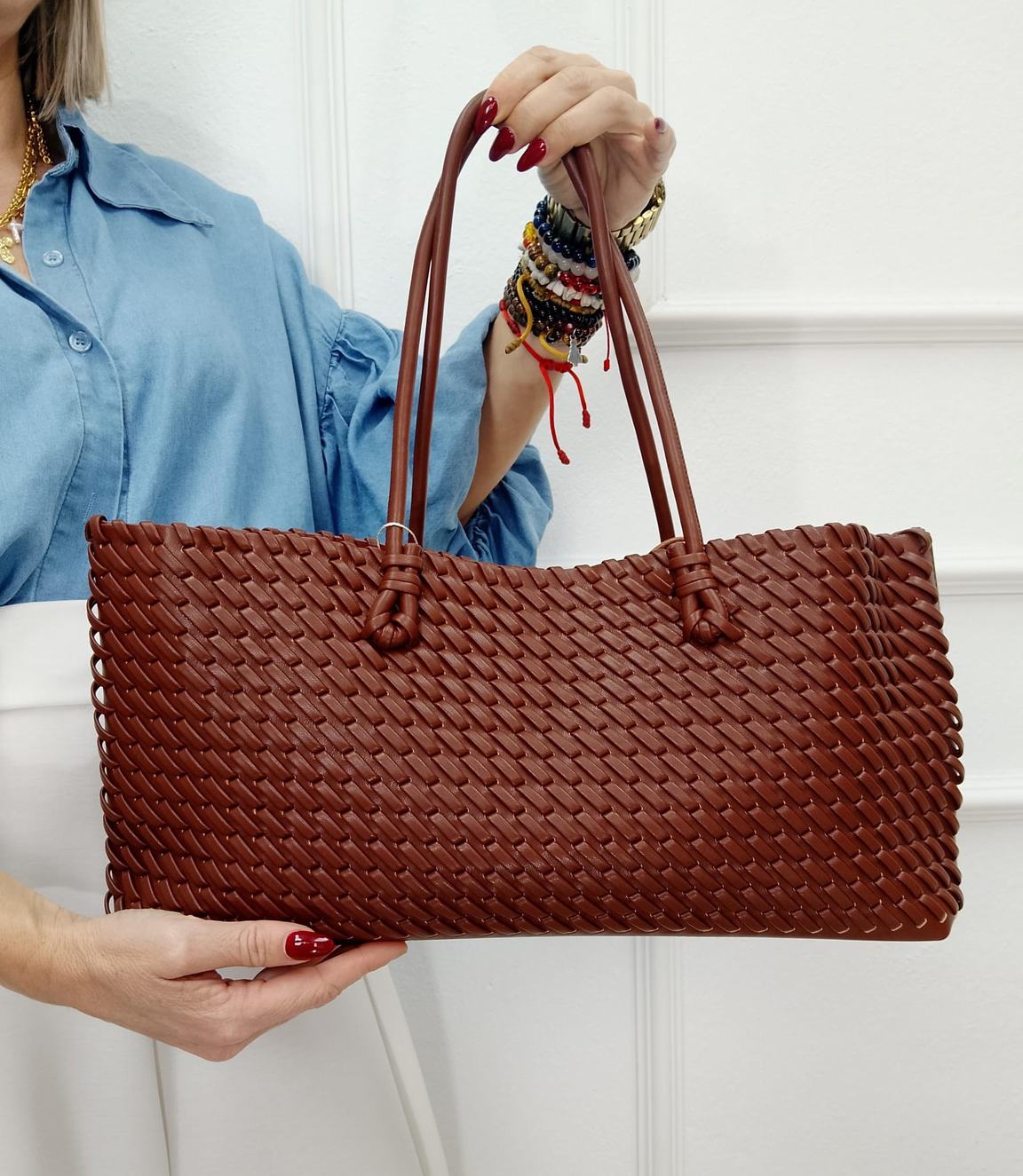 Bolso trenzado, tiene en el interior bolso de tela con cierre con cordones que se ajustan en los laterales.