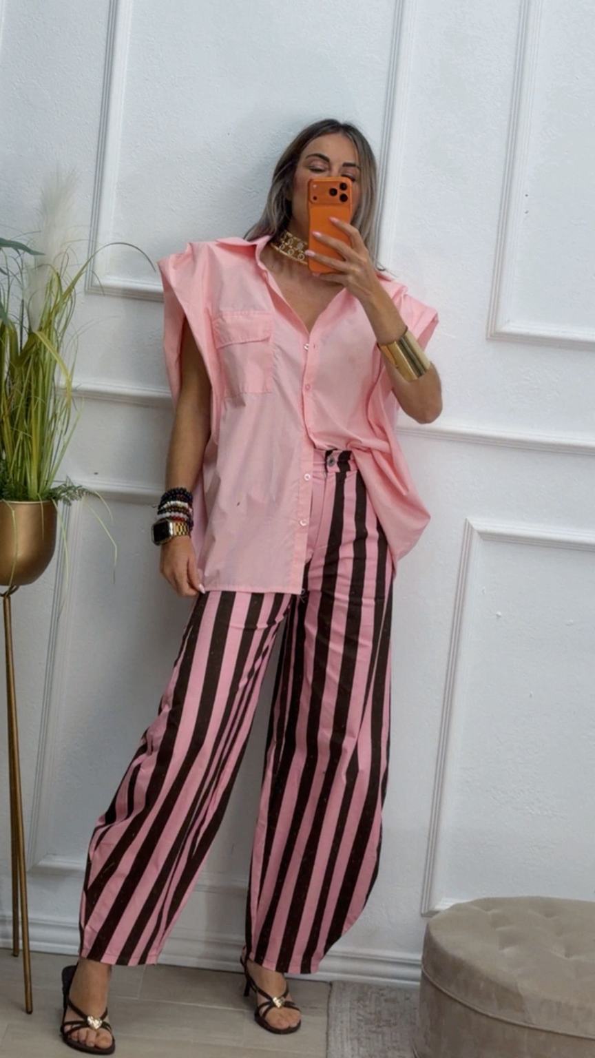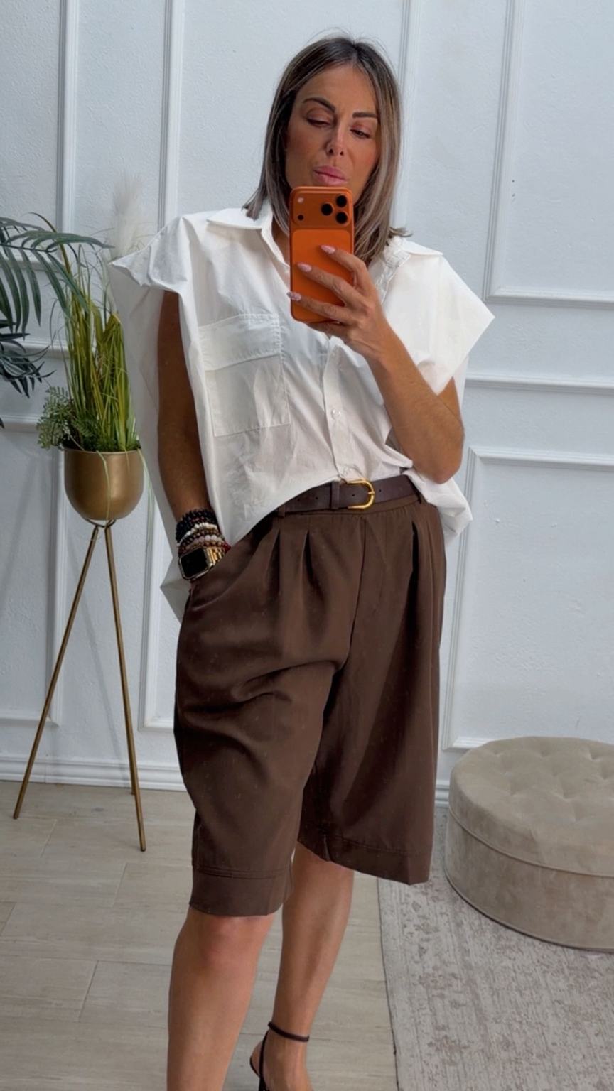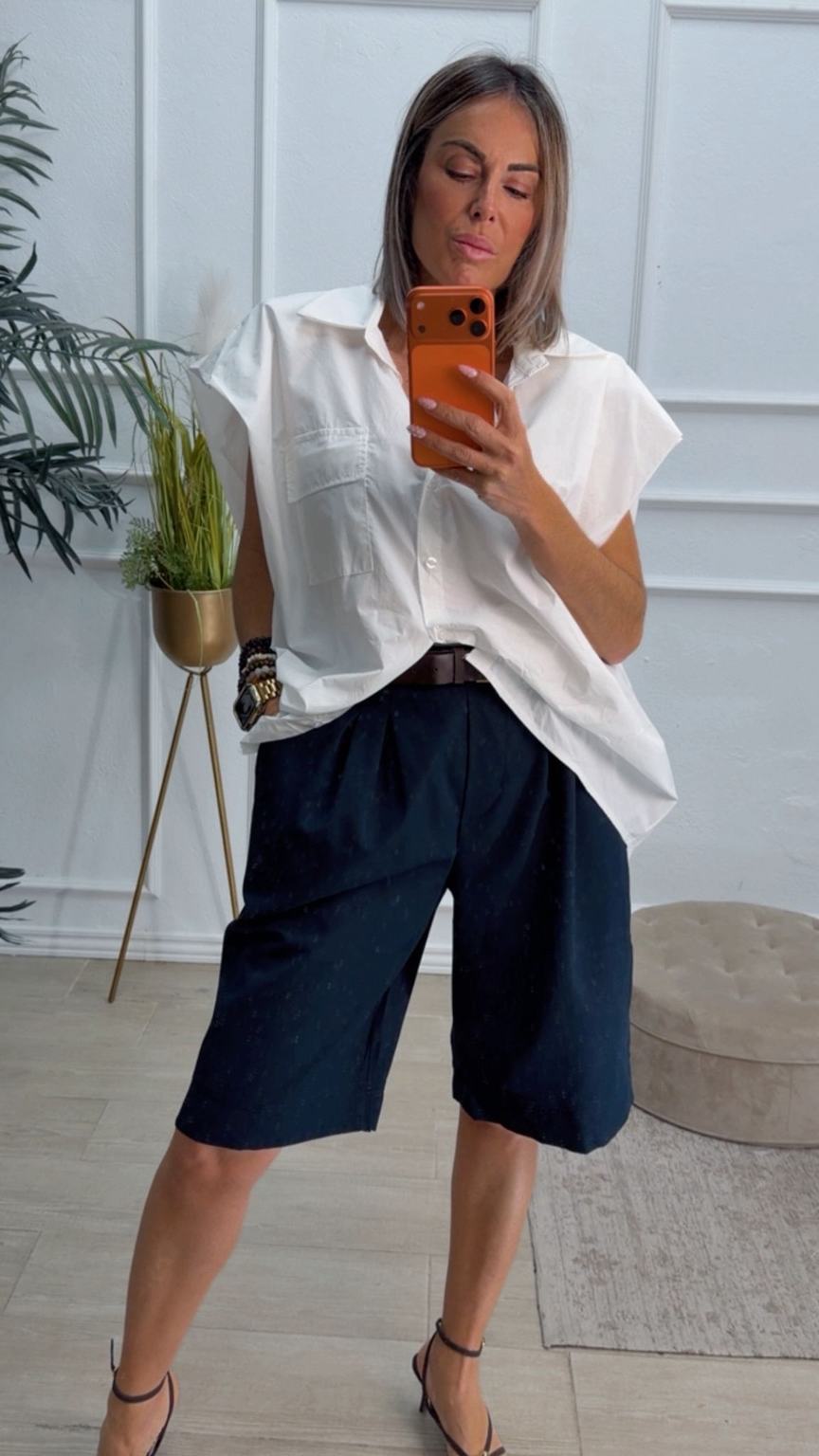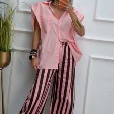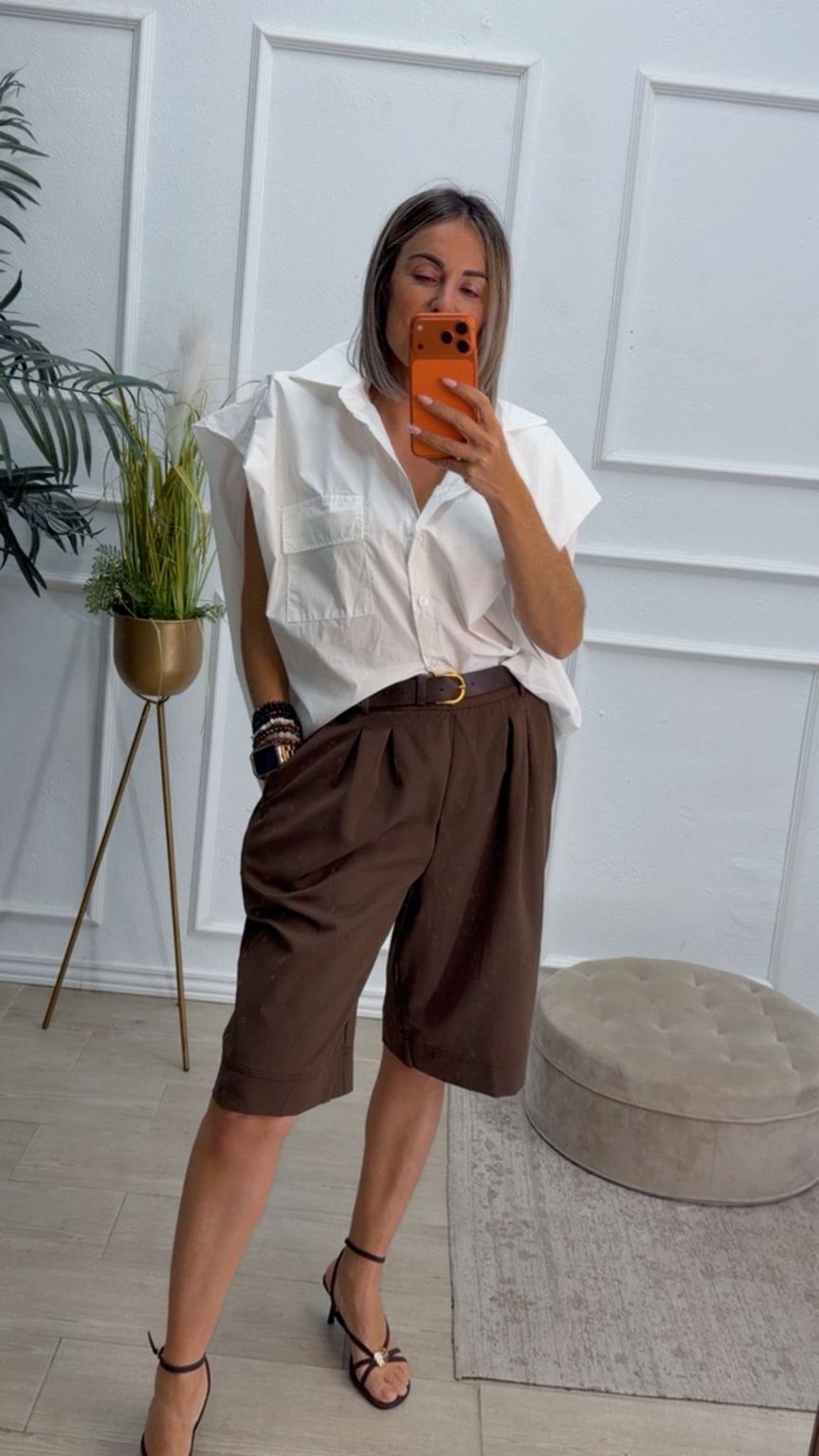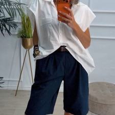 Camisa sin mangas con hombreras y pliegues delante. Cierre de botones y bolsillo delante.
