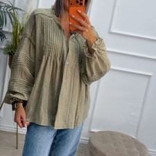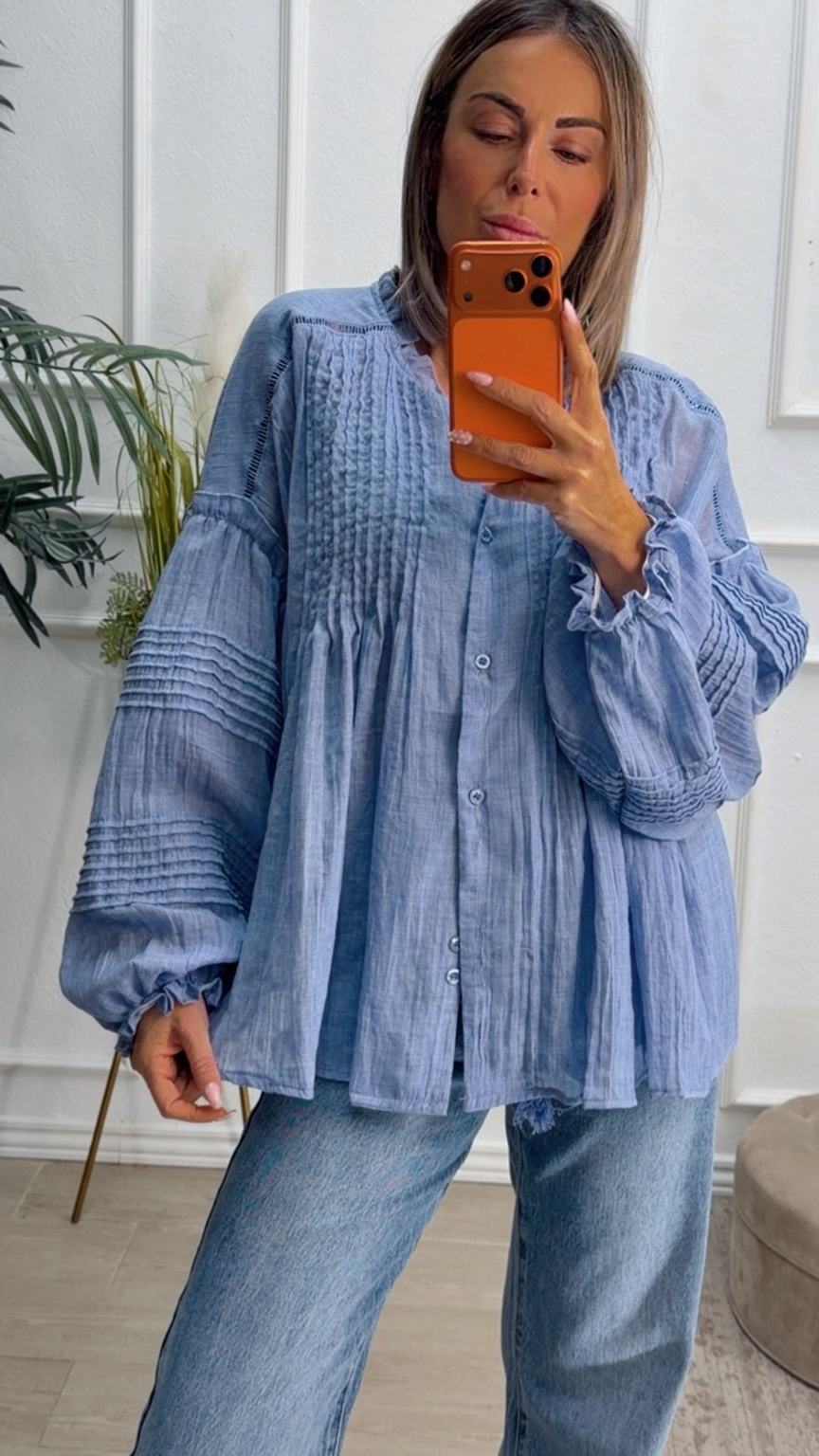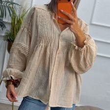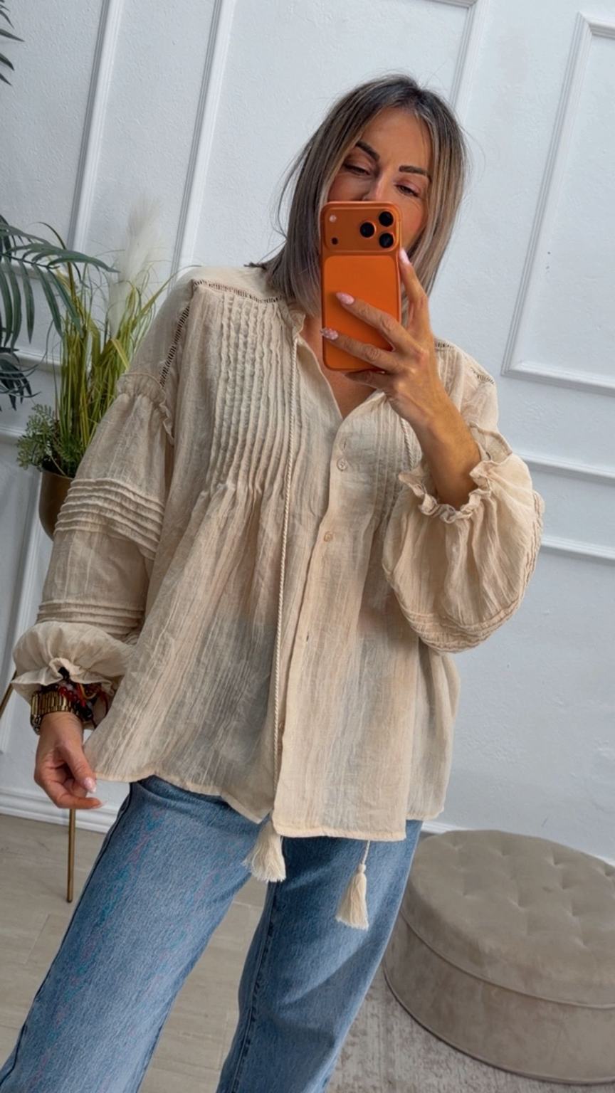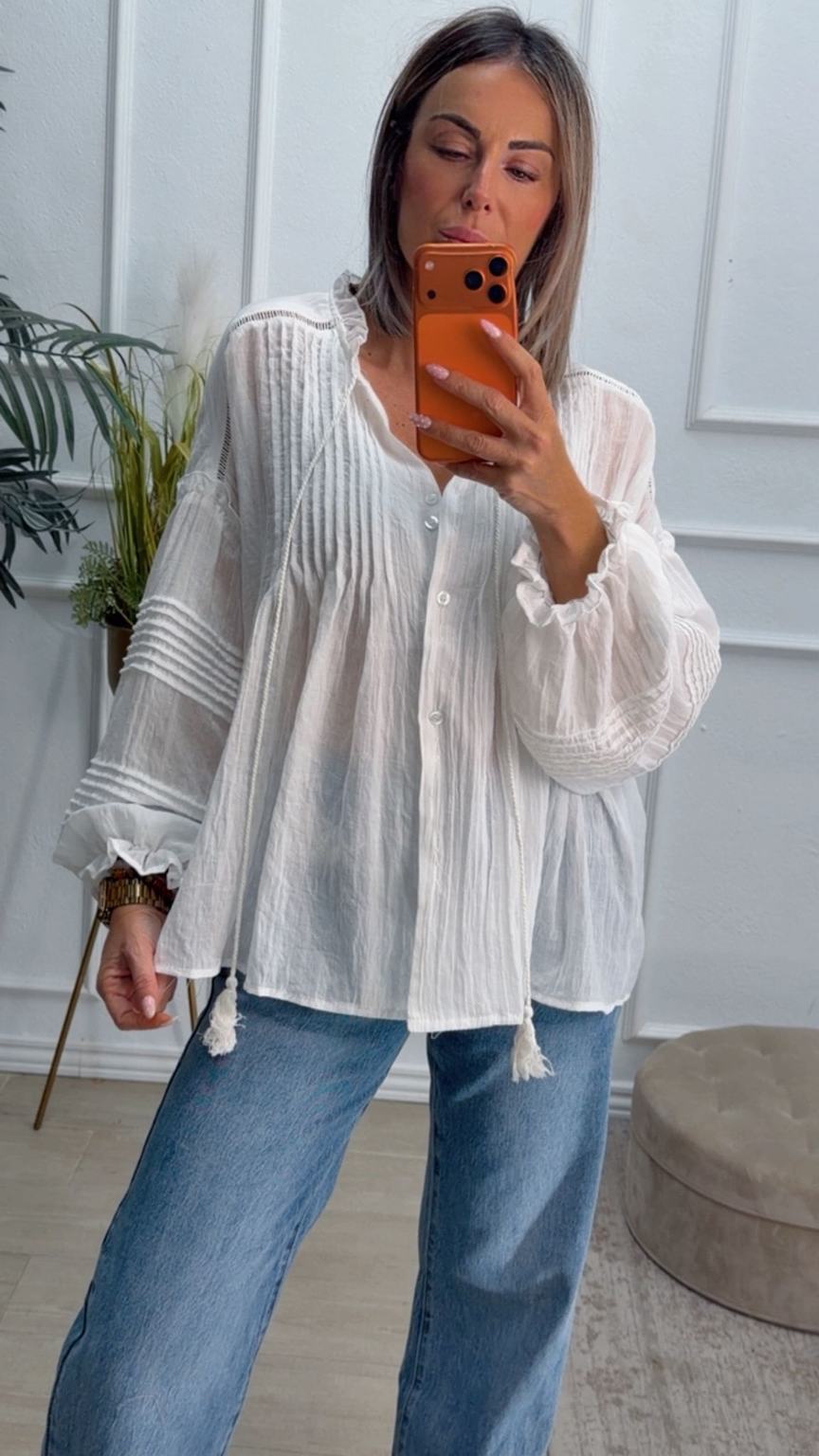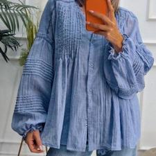 Camisa de mangas largas con tablillas, tiene cierre delante de botones. Las mangas son abullonadas.