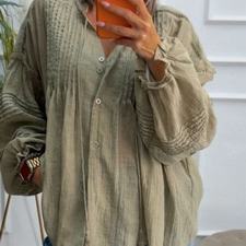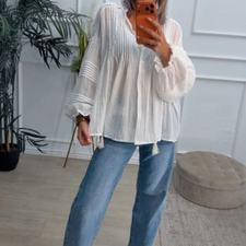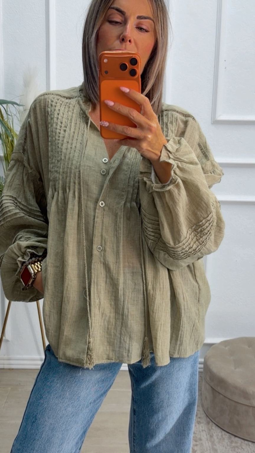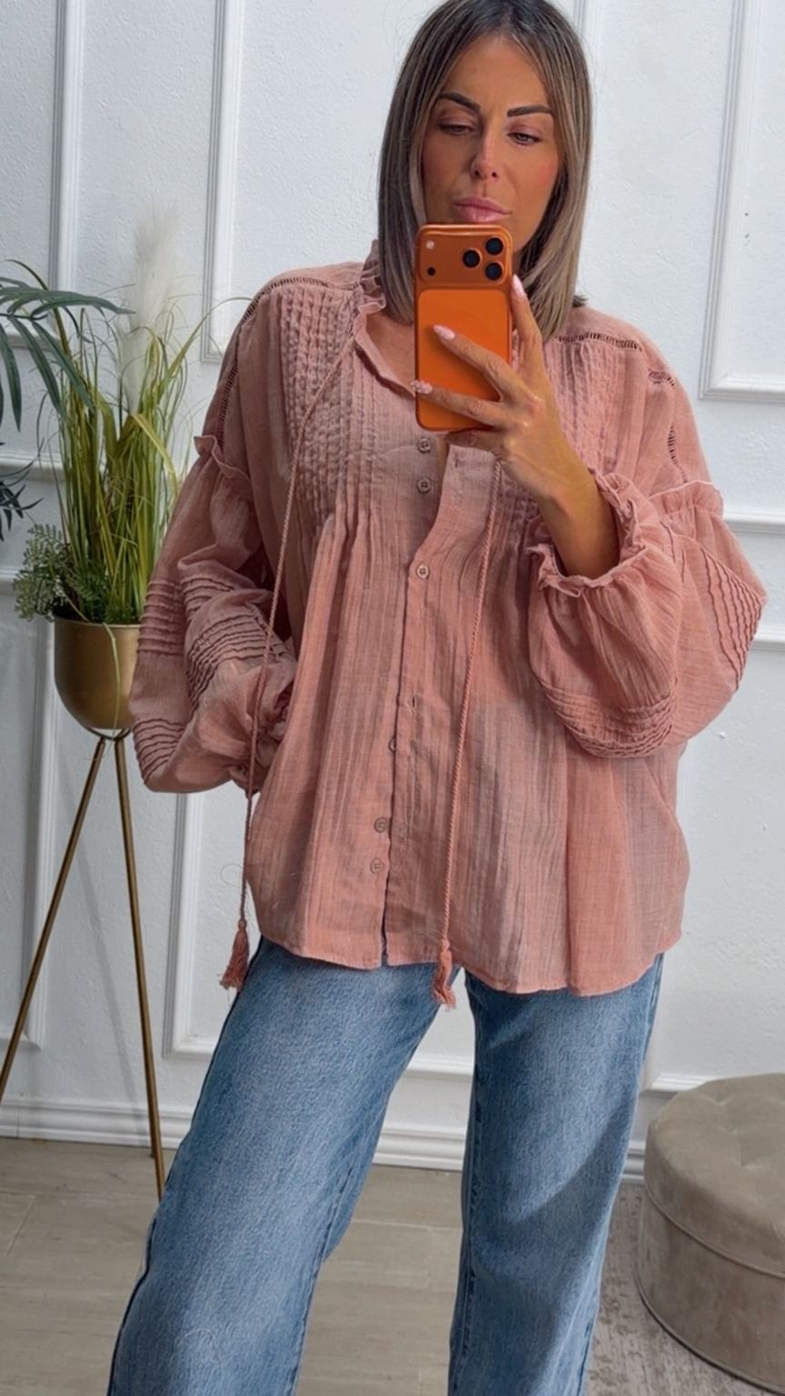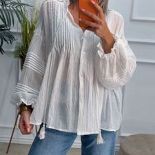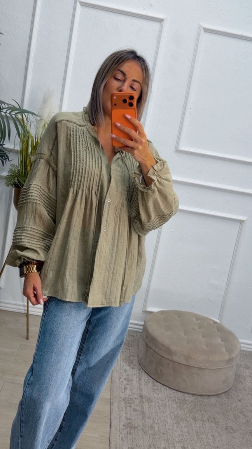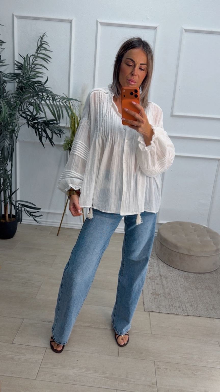 Camisa de mangas largas con tablillas, tiene cierre delante de botones. Las mangas son abullonadas.