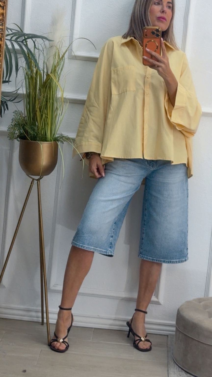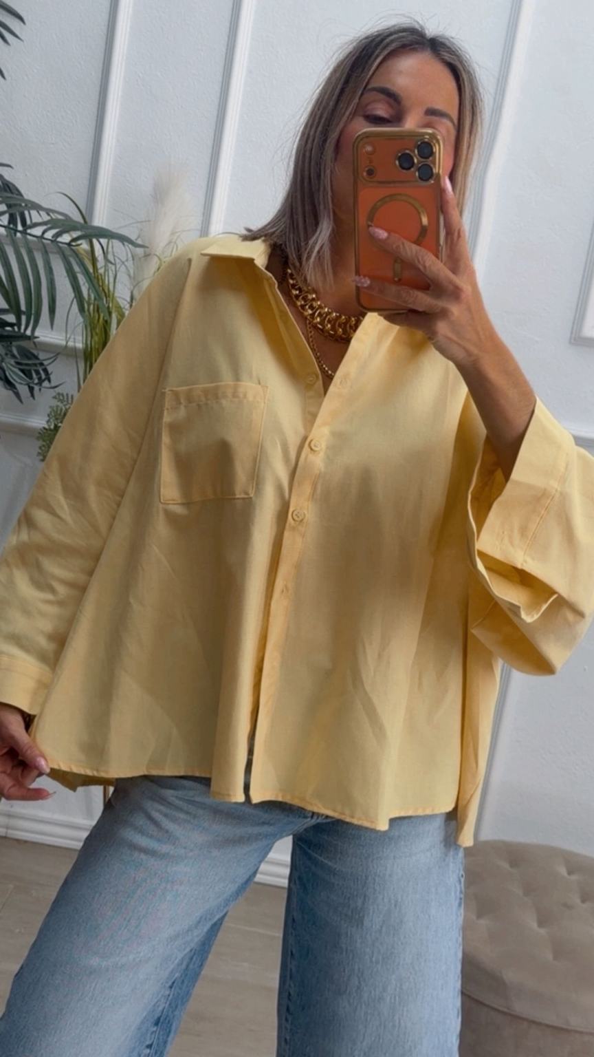 Camisa amarilla pastel oversize, con bolsillo delante.