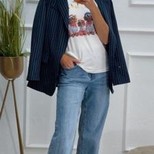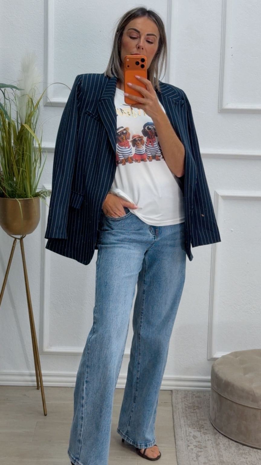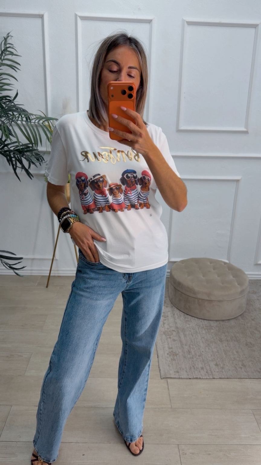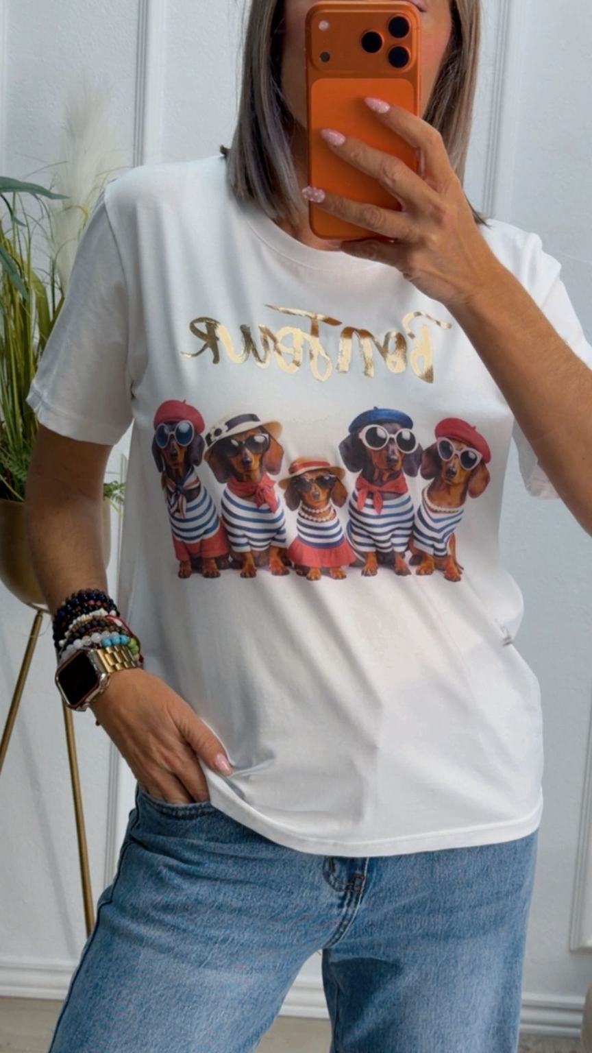 Camiseta blanca de mangas cortas con dibujo delante de perros y letras.