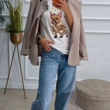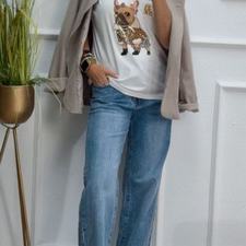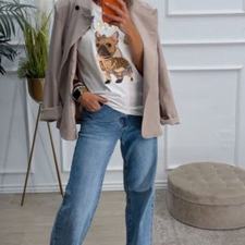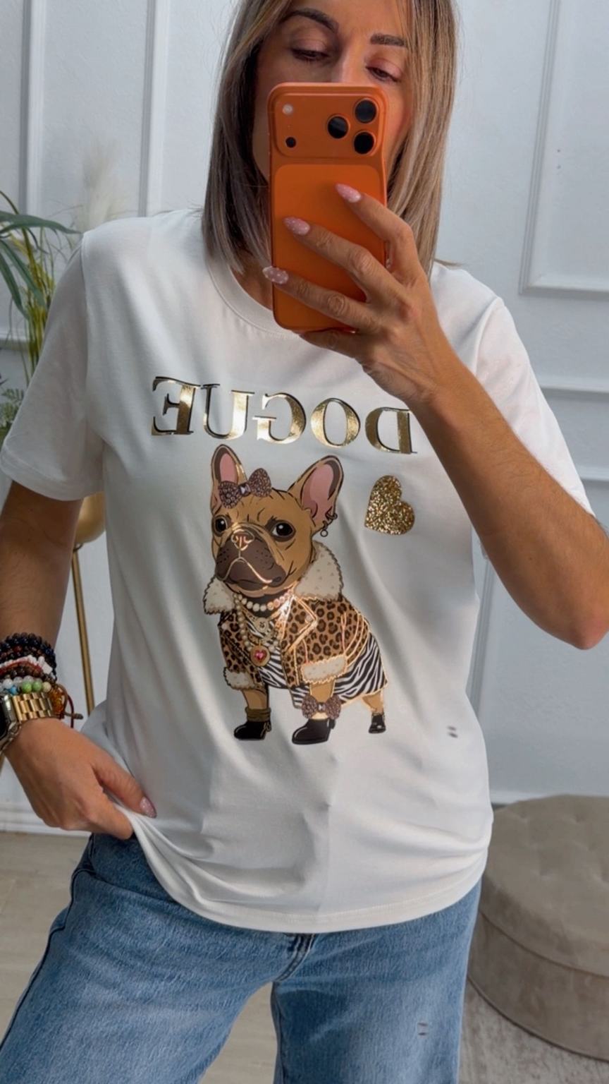 Camiseta blanca de mangas cortas con un dibujo de un perro y letras delante.