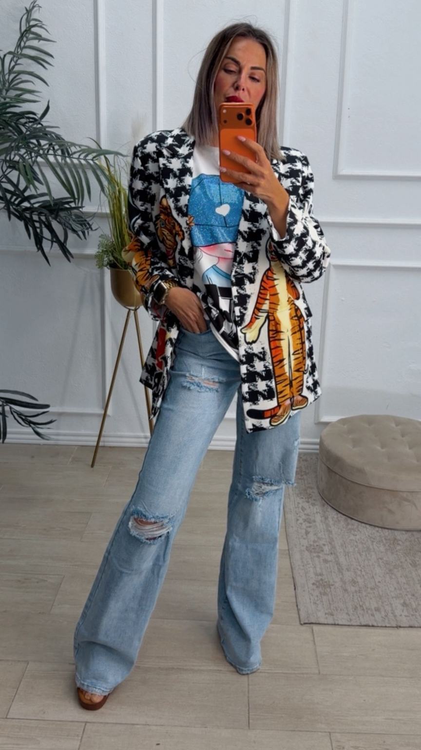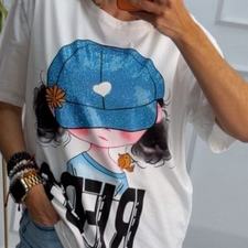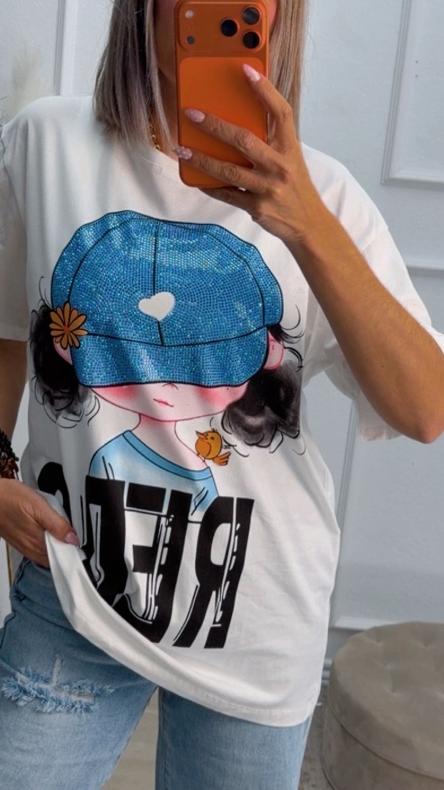 Camiseta de mangas cortas con dibujo delante y letras, tiene brillos pequeños.