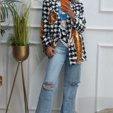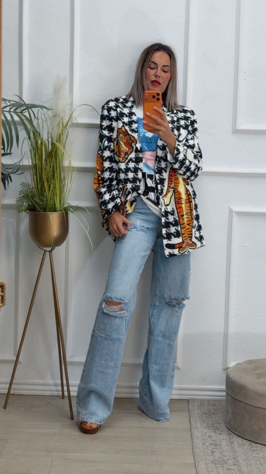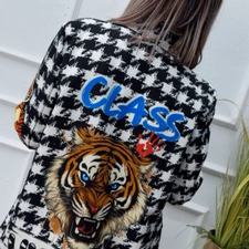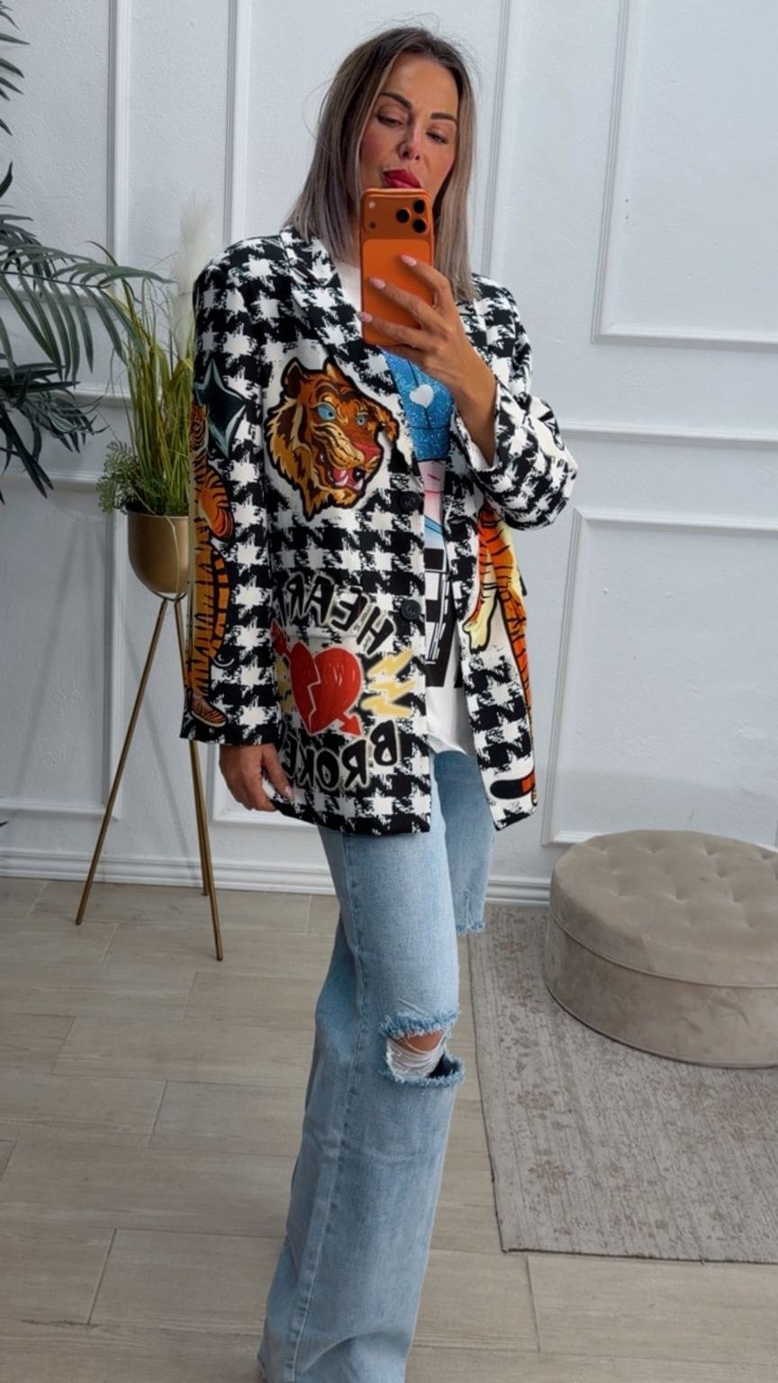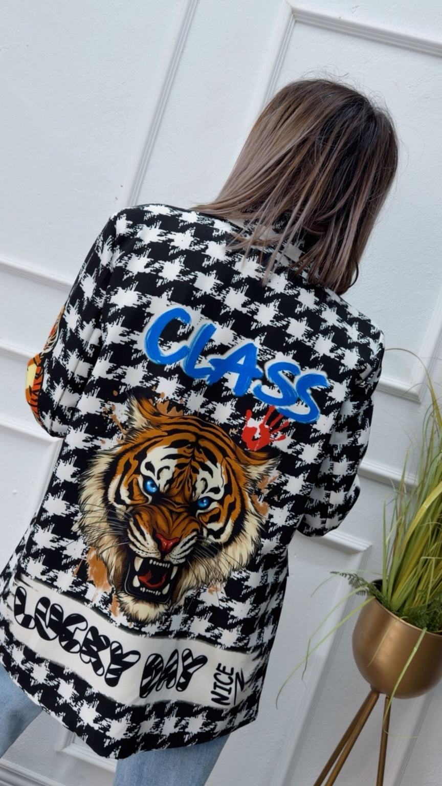 Chaqueta americana estampada, con dibujos de tigres y letras.