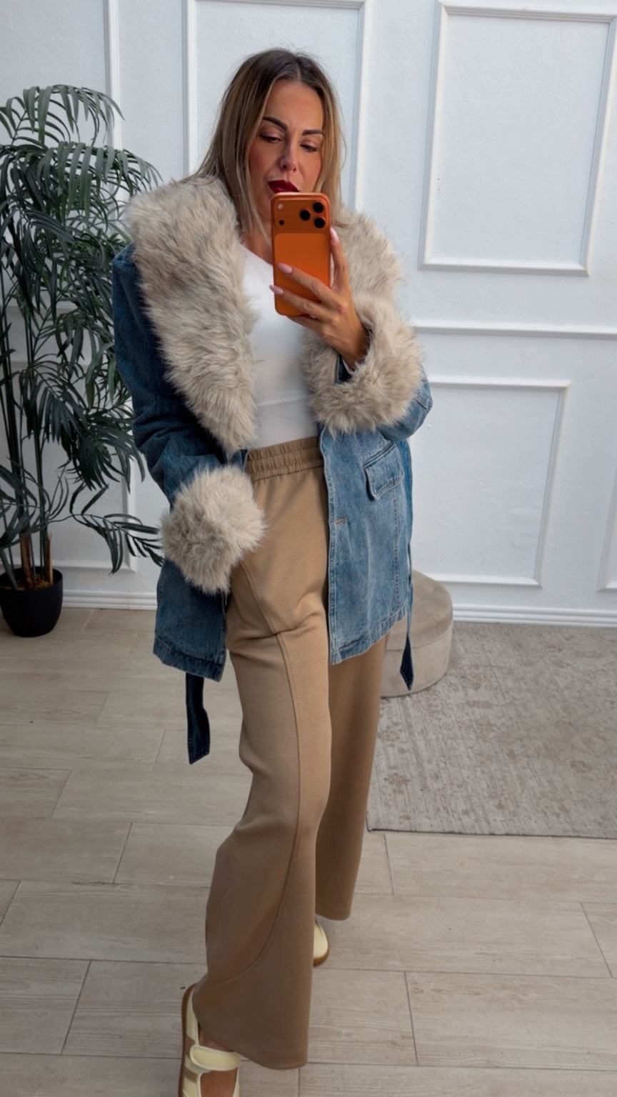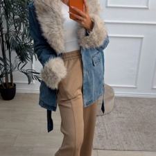 Chaqueta vaquera con cierre de botones delante, bolsillos y cinturón para ajustar. Tiene pelos en los puños y el cuello, se puede quitar.