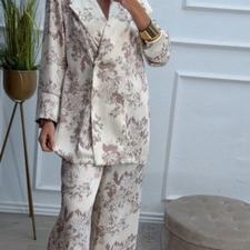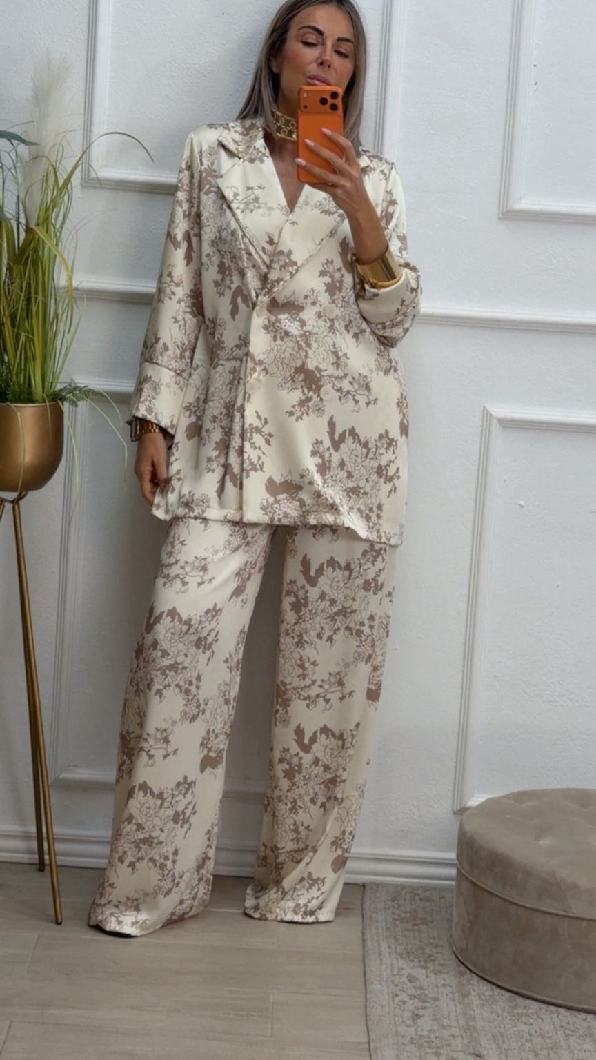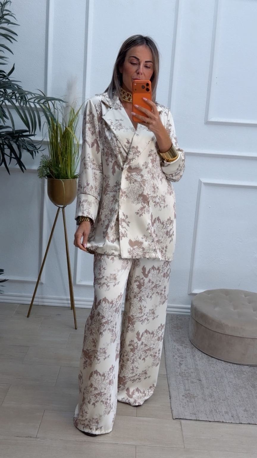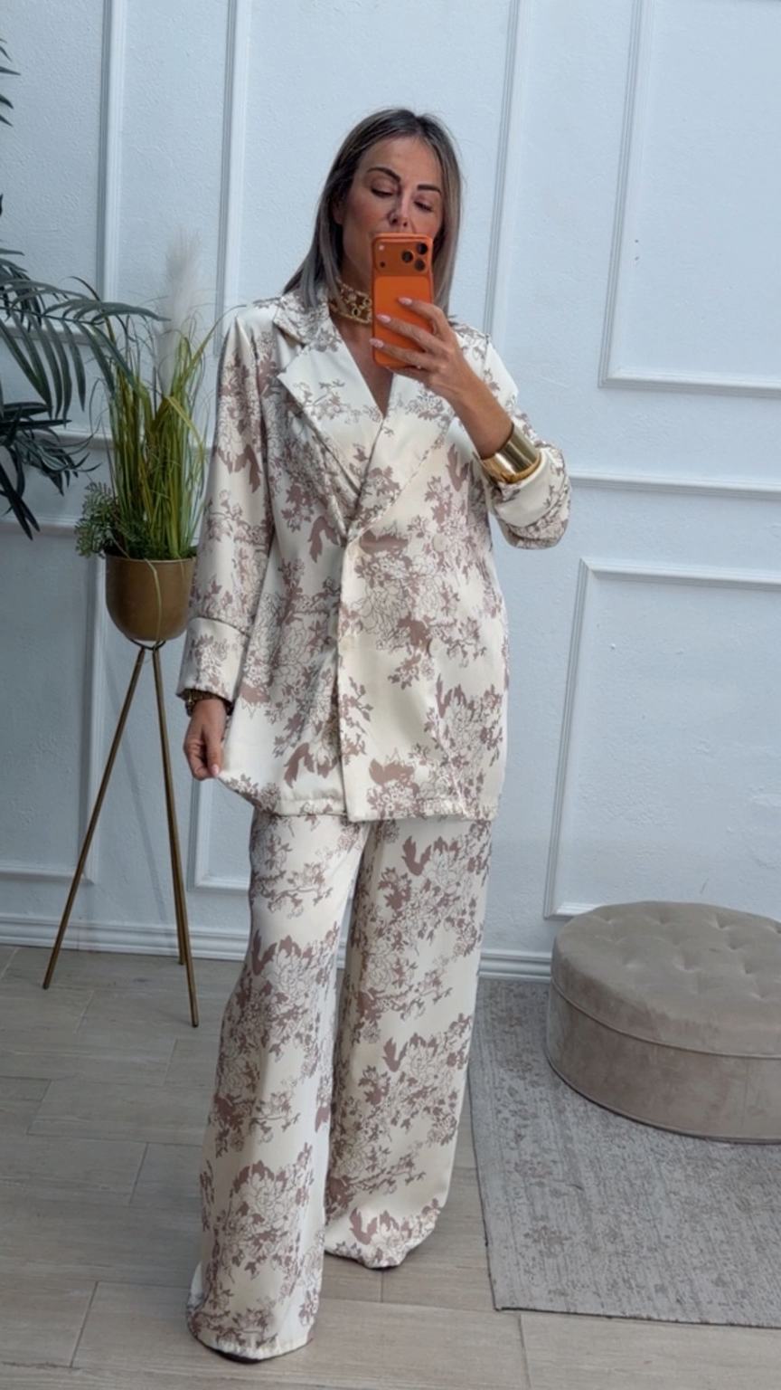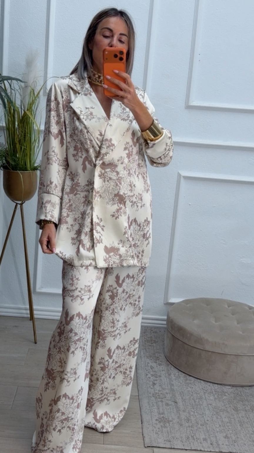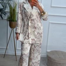 Conjunto estampado formado por chaqueta y pantalón recto. La chaqueta tiene cierre delante con cuatro botones. El pantalón tiene cinturilla elástica con lacito delante del mismo tejido.