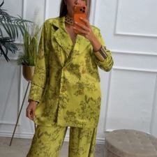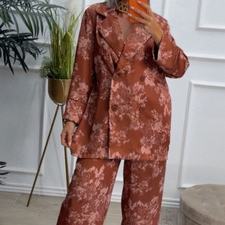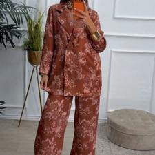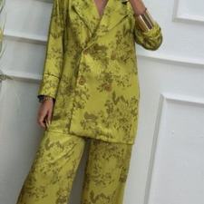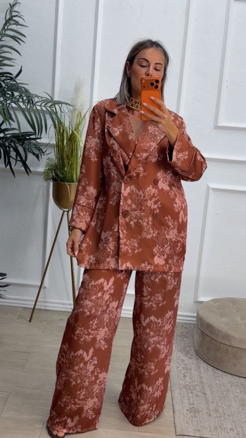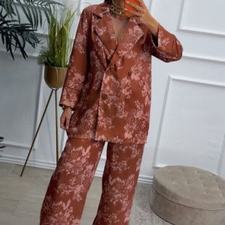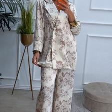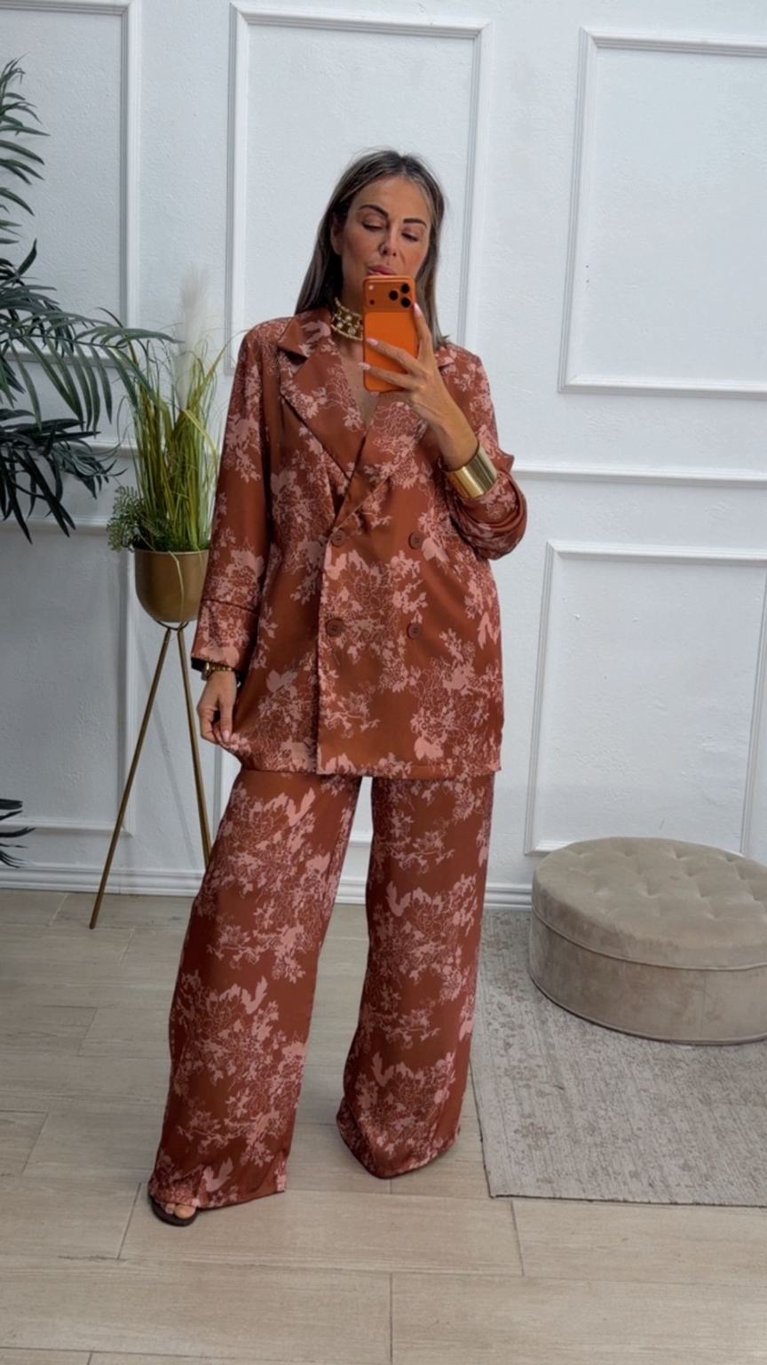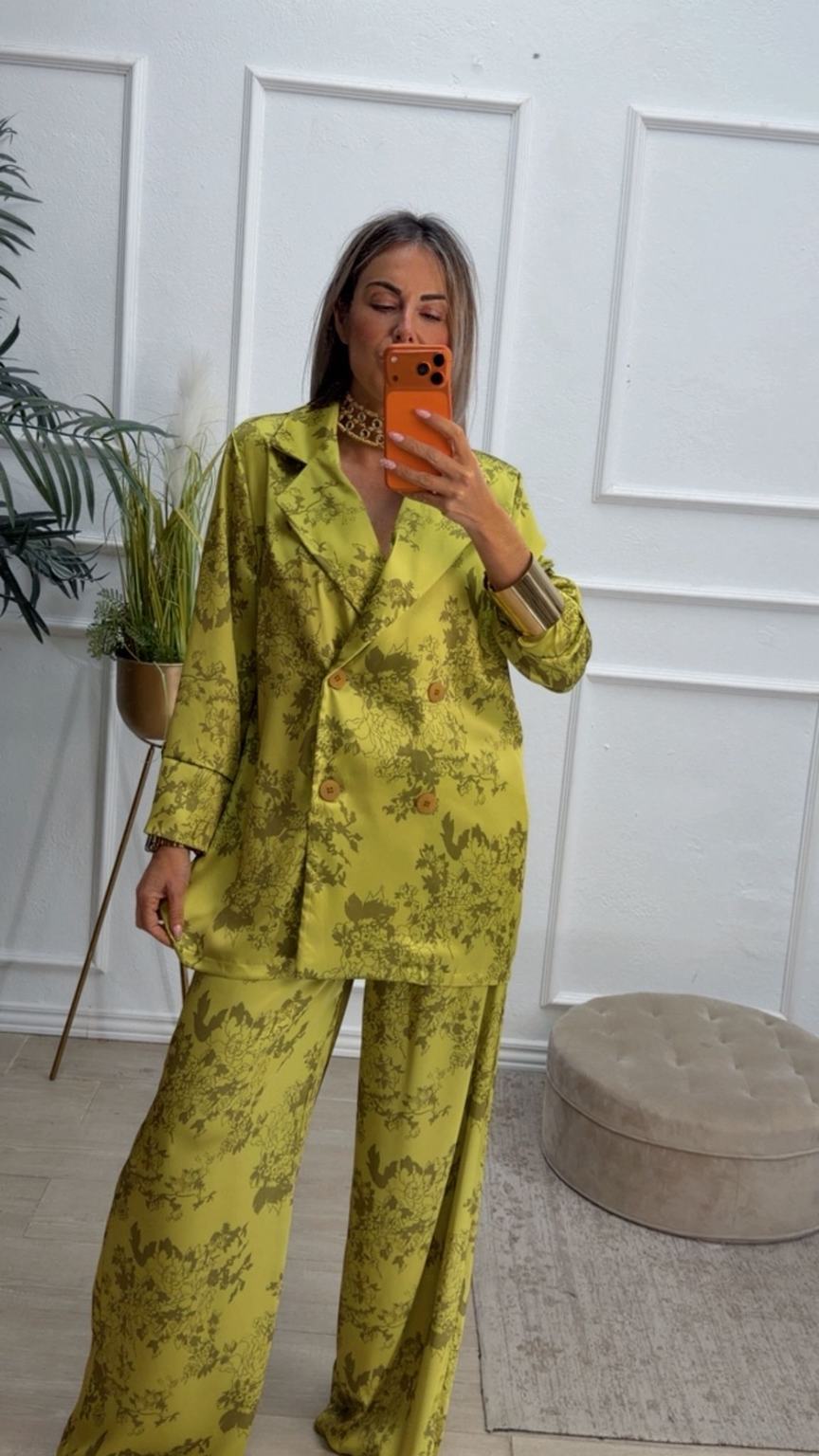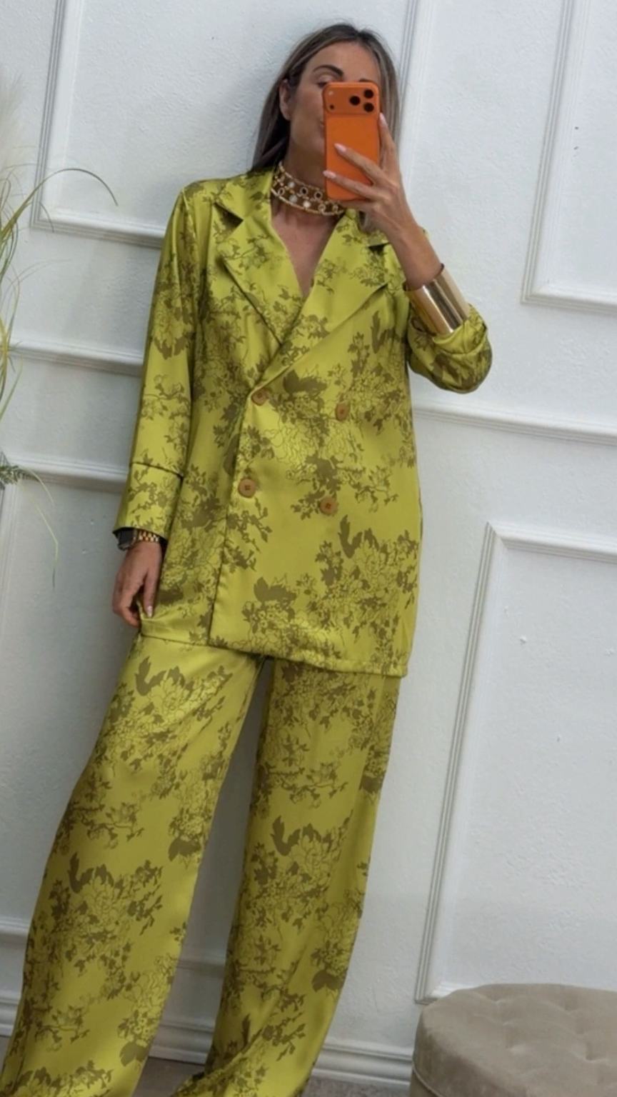 Conjunto estampado formado por chaqueta y pantalón recto. La chaqueta tiene cierre delante con cuatro botones. El pantalón tiene cinturilla elástica con lacito delante del mismo tejido.