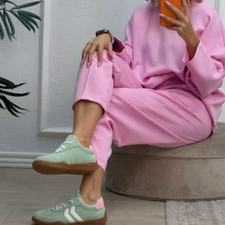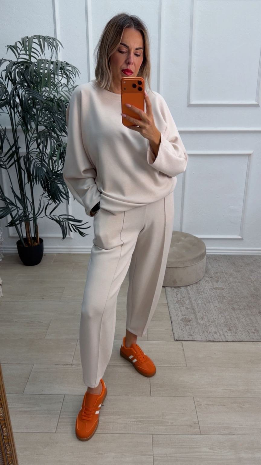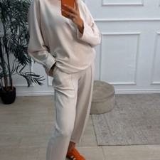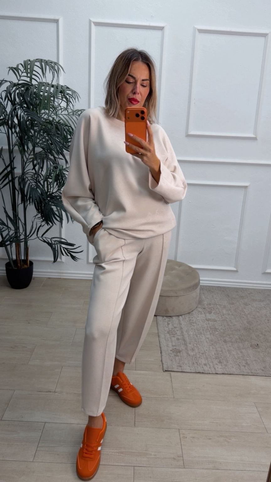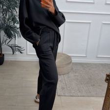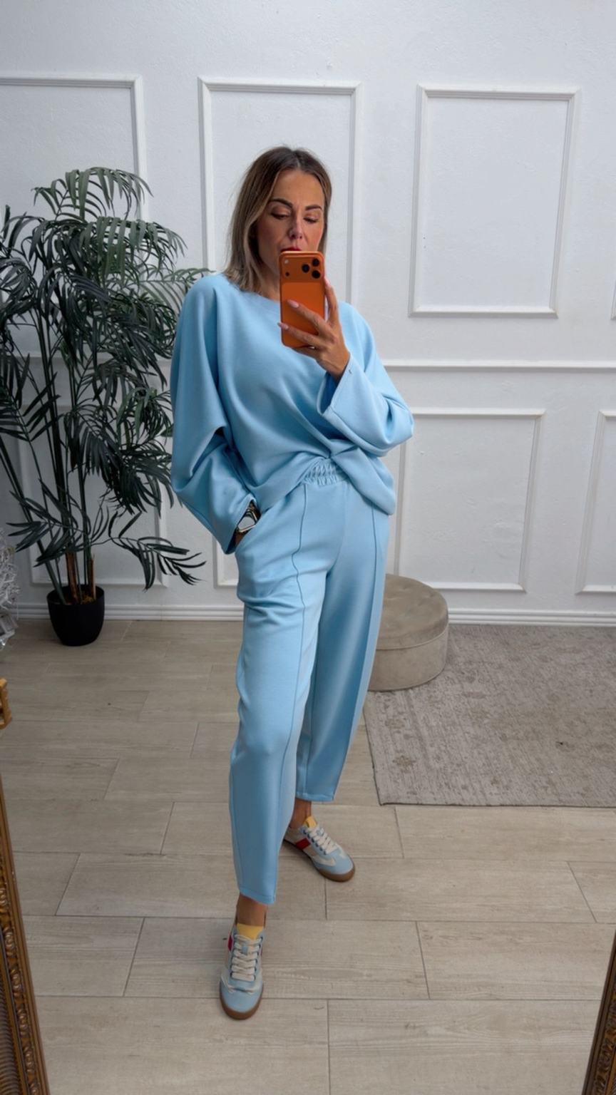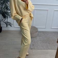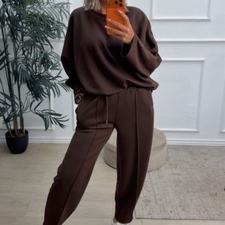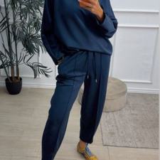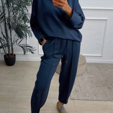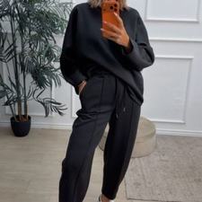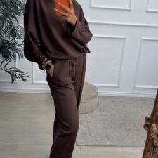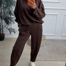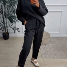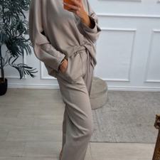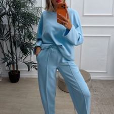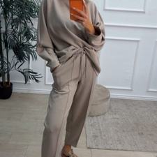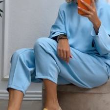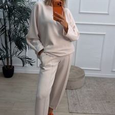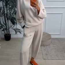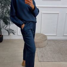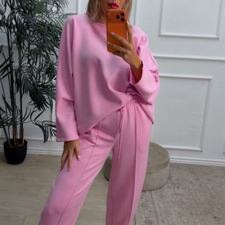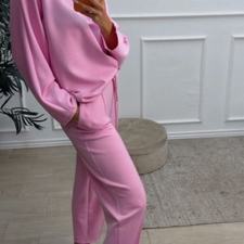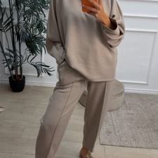 Conjunto deportivo de capa de aire, formado por sudadera oversize y pantalón tipo bomber. La sudadera tiene el escote redondo. El pantalón tiene cinturilla elástica con cordón para ajustar, bolsillos y una costura de adorno delante.