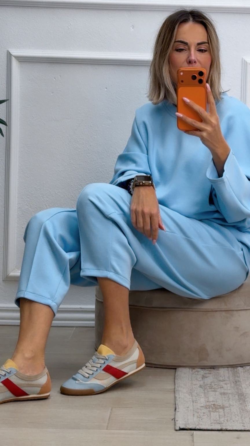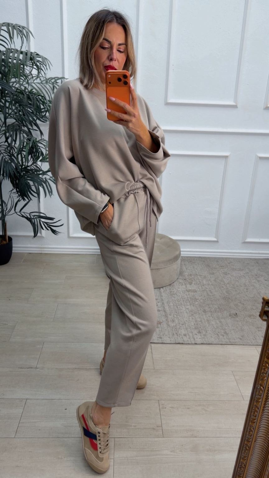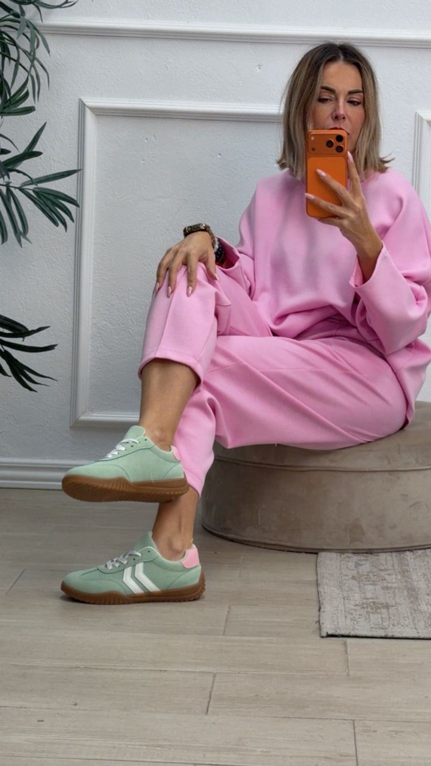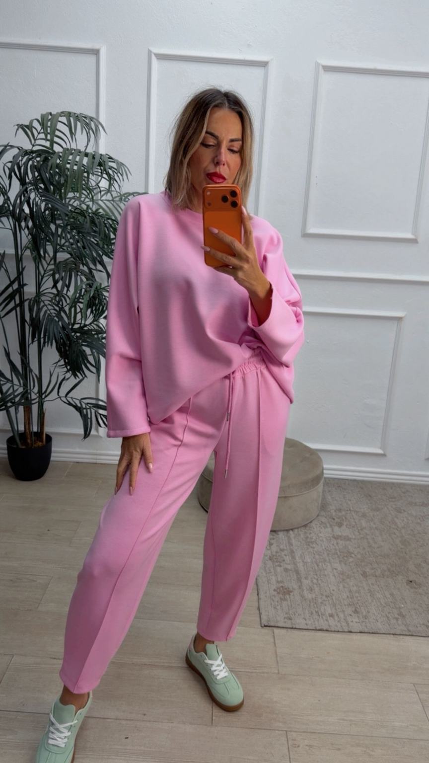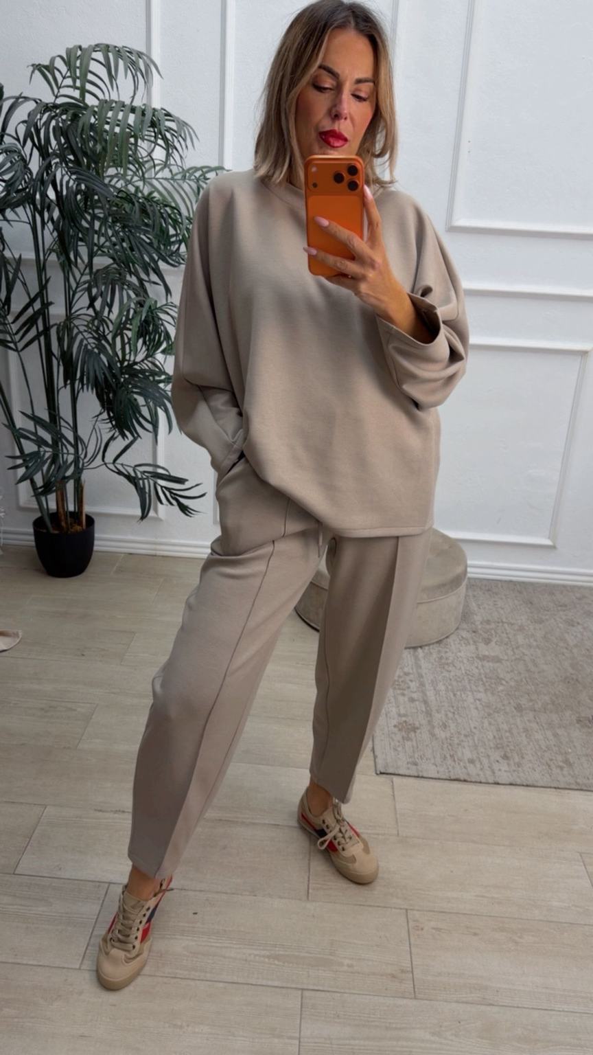 Conjunto deportivo de capa de aire, formado por sudadera oversize y pantalón tipo bomber. La sudadera tiene el escote redondo. El pantalón tiene cinturilla elástica con cordón para ajustar, bolsillos y una costura de adorno delante.