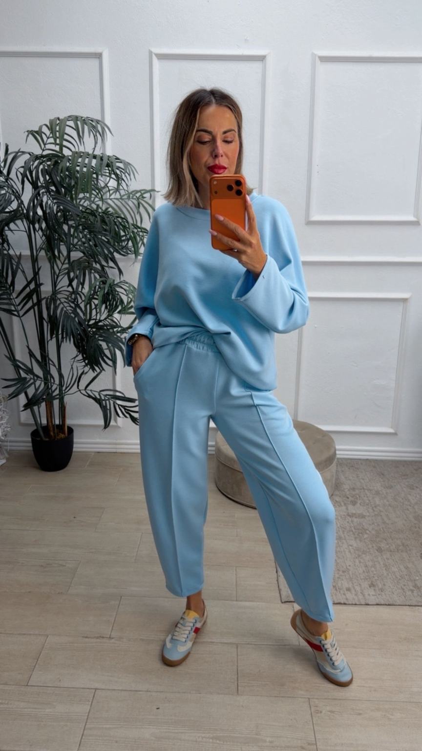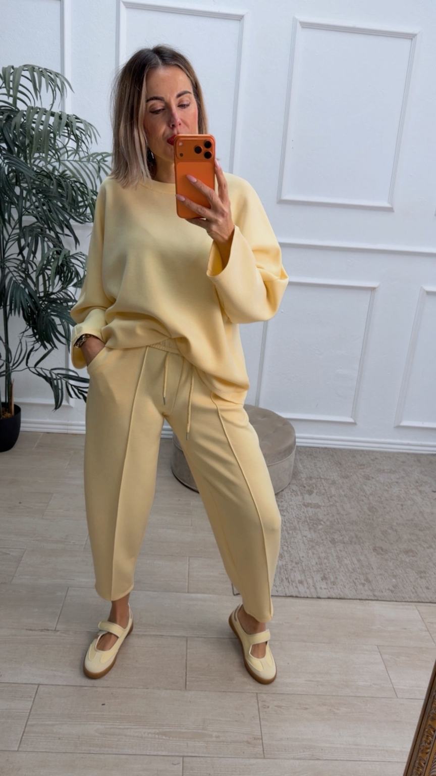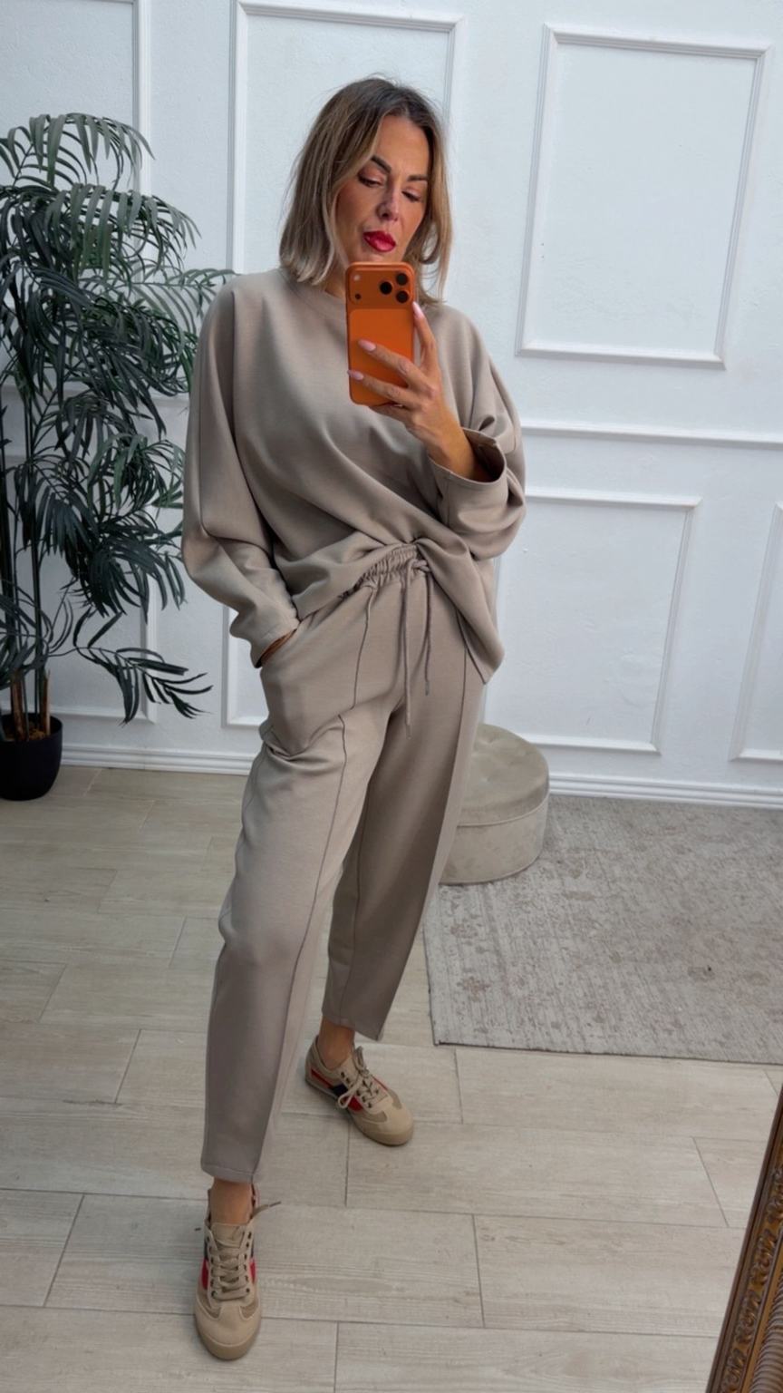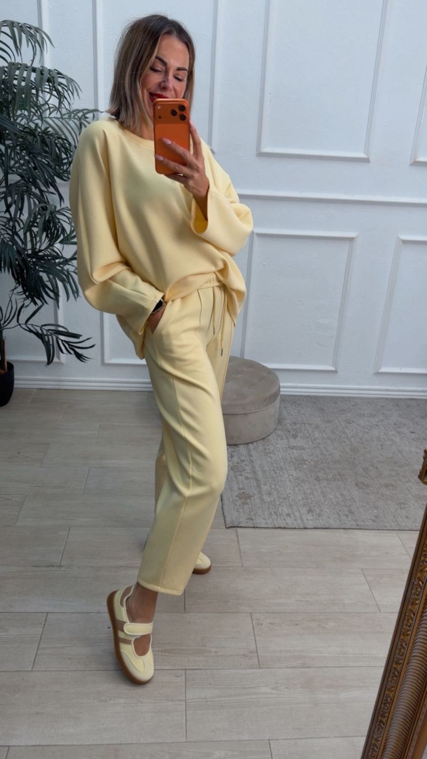Conjunto deportivo de capa de aire, formado por sudadera oversize y pantalón tipo bomber. La sudadera tiene el escote redondo. El pantalón tiene cinturilla elástica con cordón para ajustar, bolsillos y una costura de adorno delante.