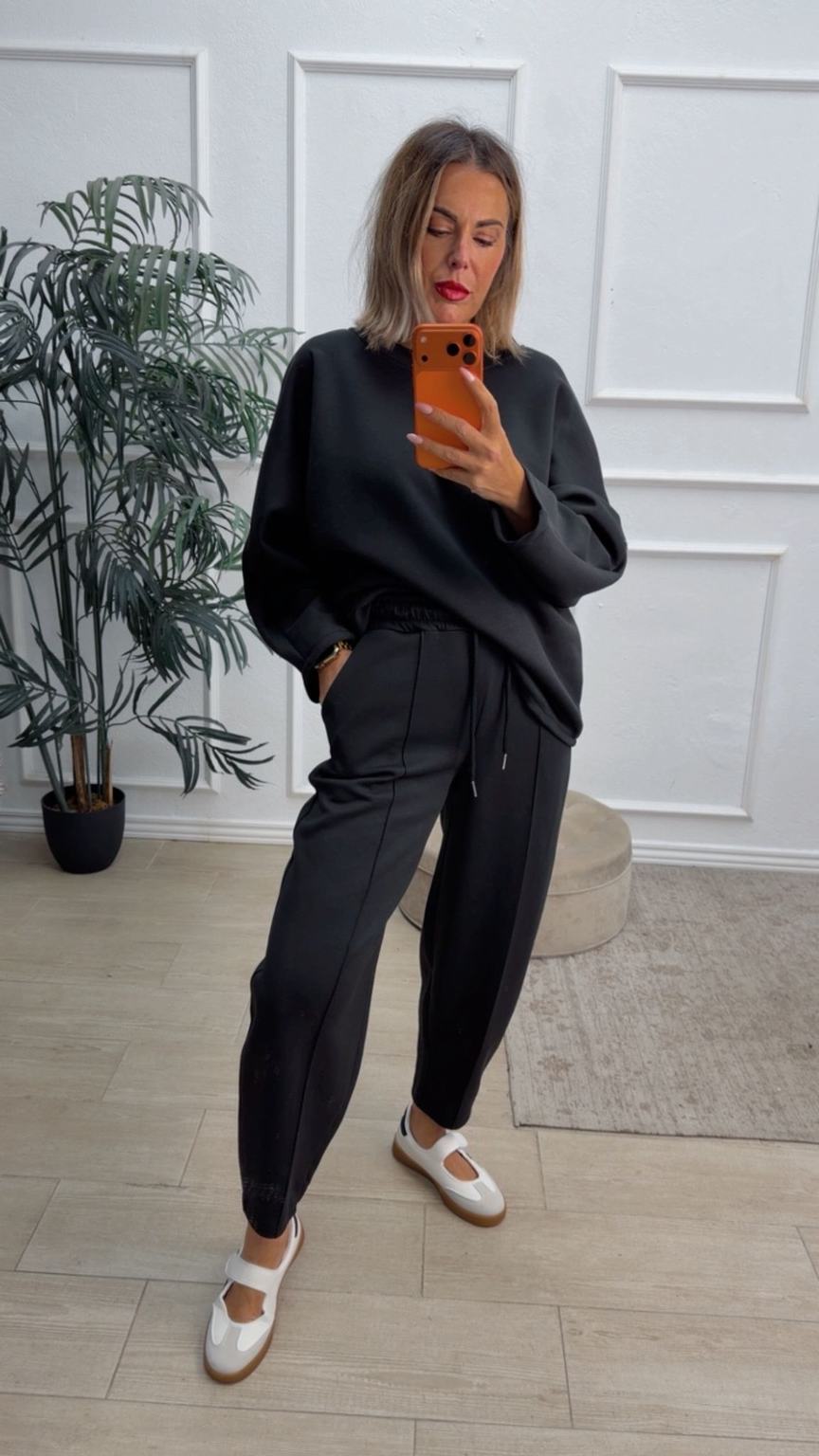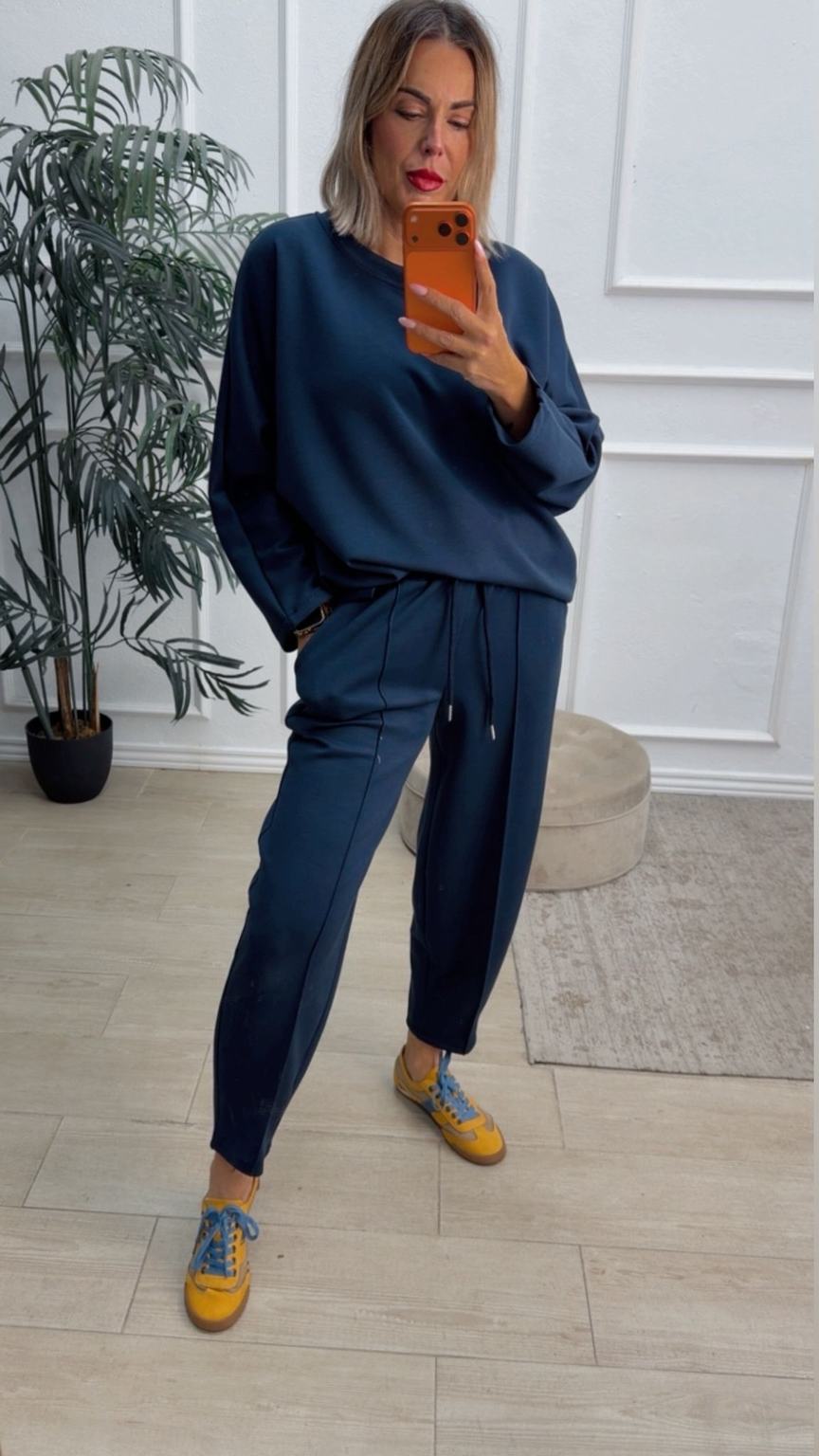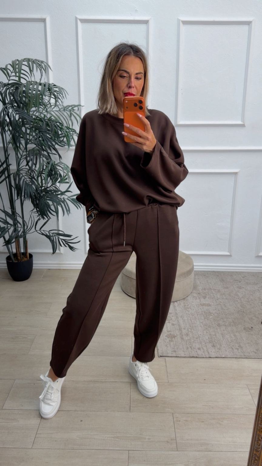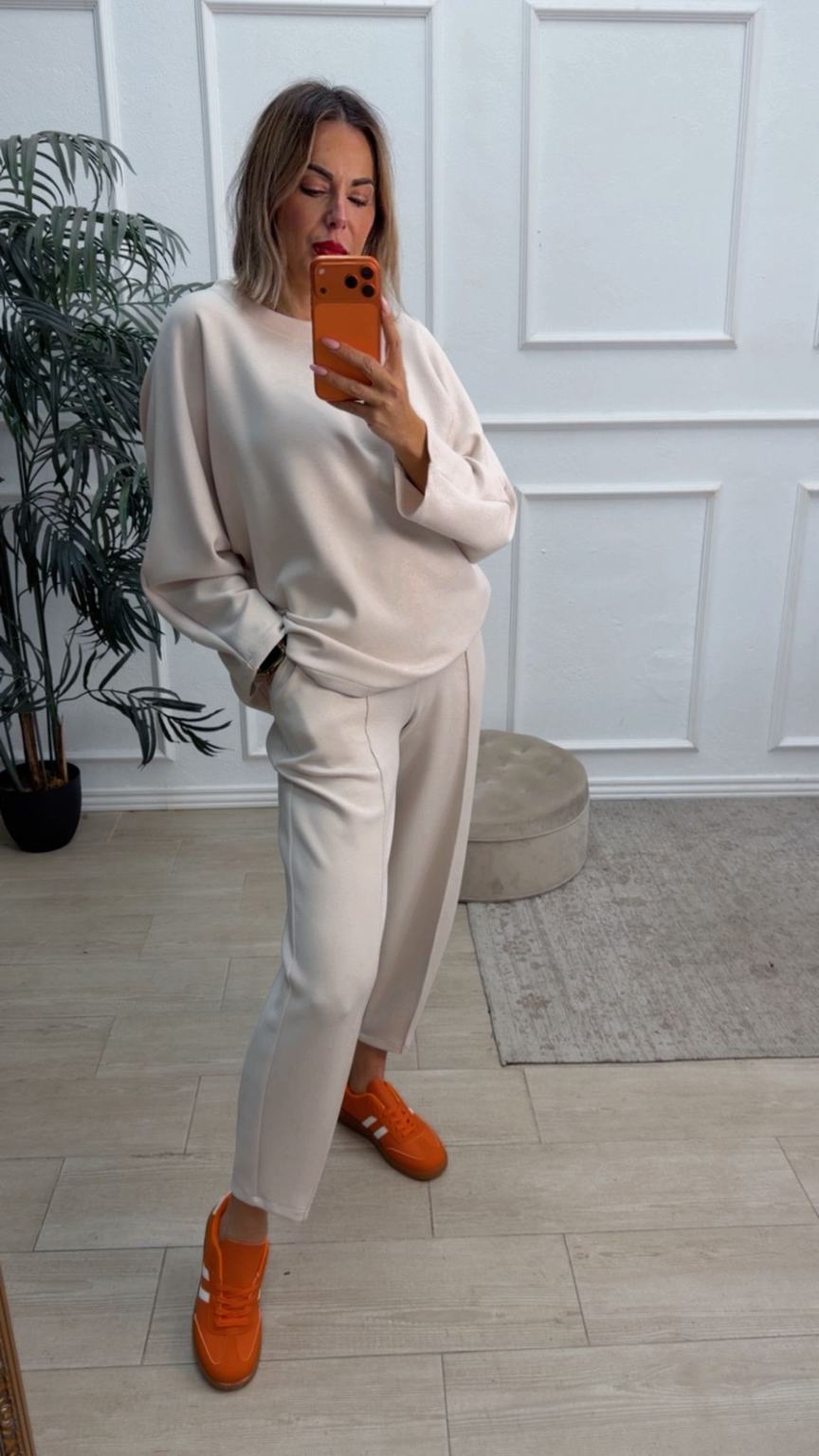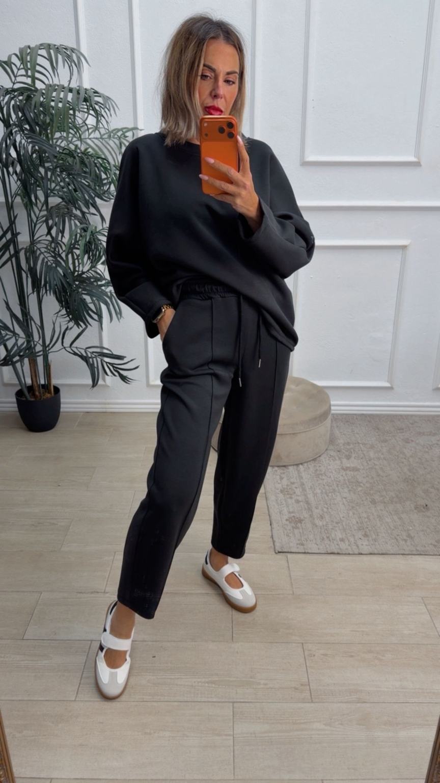 Conjunto deportivo de capa de aire, formado por sudadera oversize y pantalón tipo bomber. La sudadera tiene el escote redondo. El pantalón tiene cinturilla elástica con cordón para ajustar, bolsillos y una costura de adorno delante.