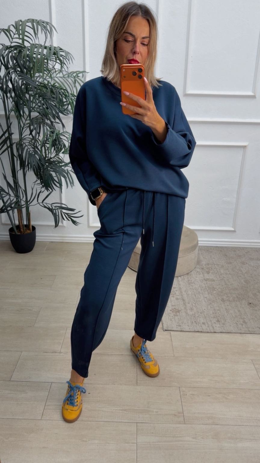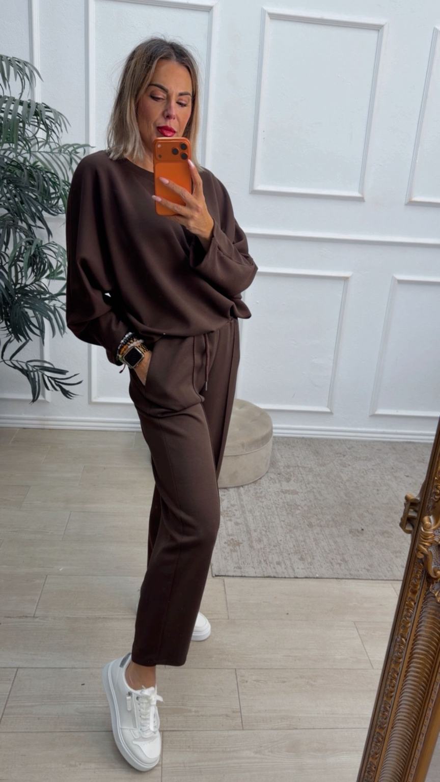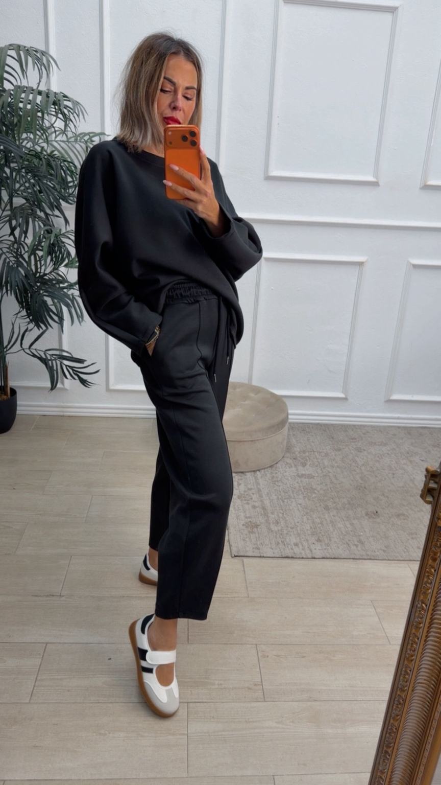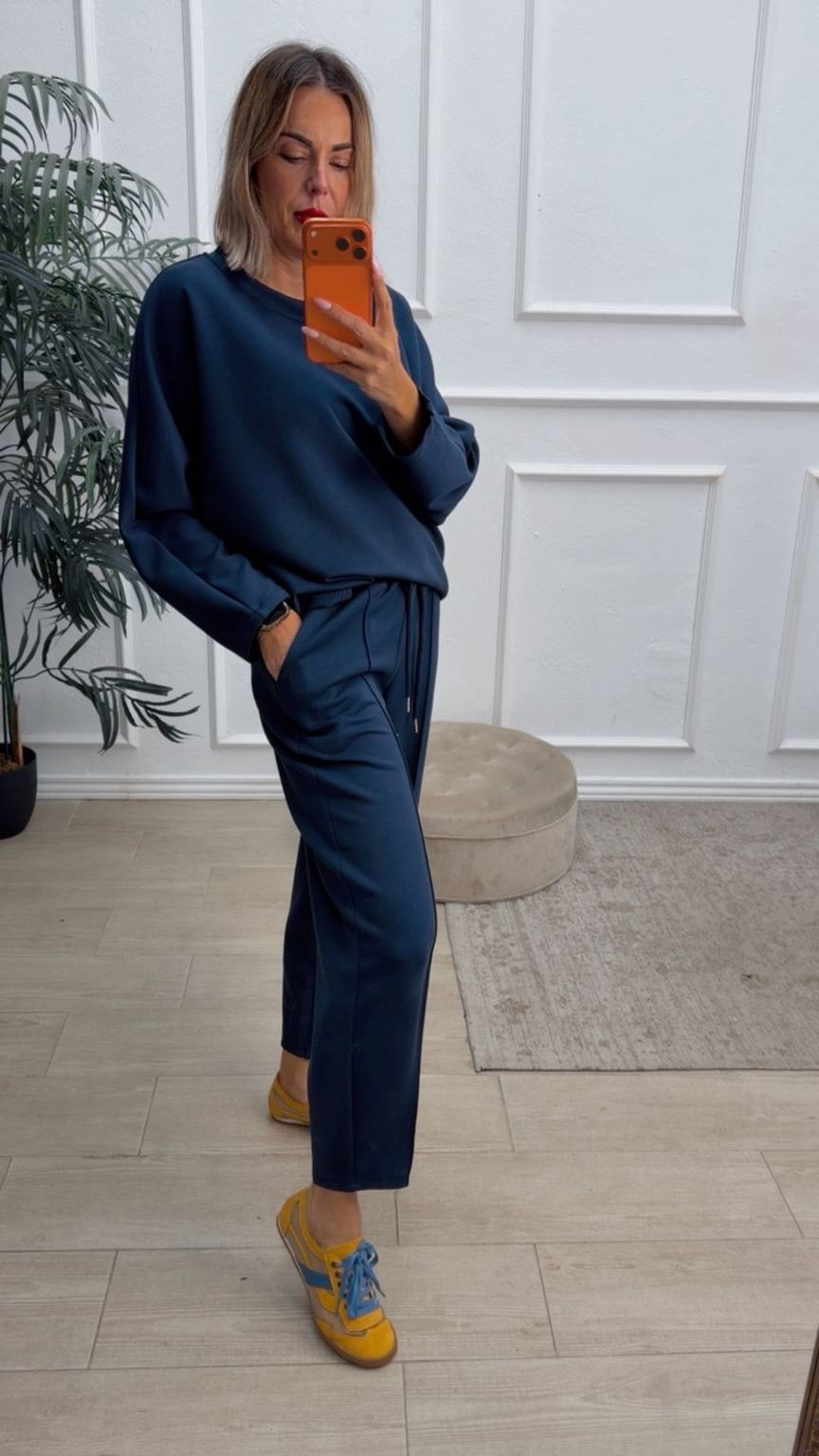 Conjunto deportivo de capa de aire, formado por sudadera oversize y pantalón tipo bomber. La sudadera tiene el escote redondo. El pantalón tiene cinturilla elástica con cordón para ajustar, bolsillos y una costura de adorno delante.