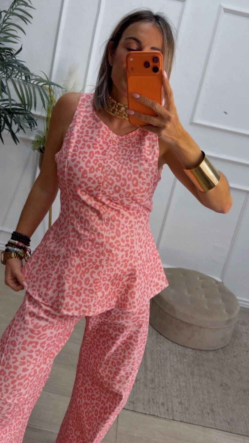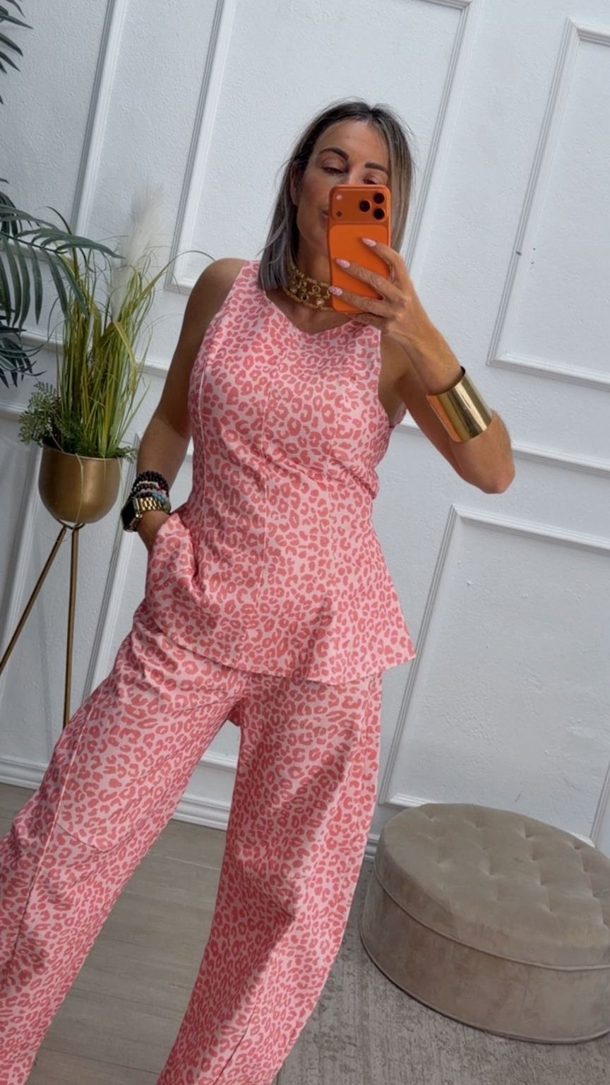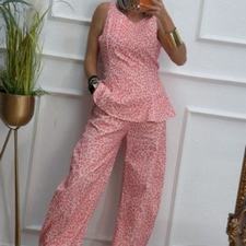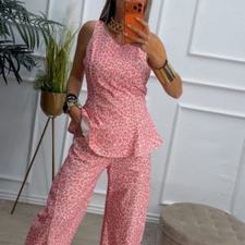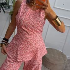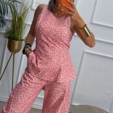 Conjunto estampado de animal print en color rosa, de top sin mangas y pantalón balloum. El top tiene escote redondo, costuras delante y lazo del mismo tejido para anudar detrás, cierre con cremallera en el lado. El pantalón tiene cinturilla elástica en la parte de atrás, cierre de botón y cremallera y bolsillos.