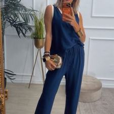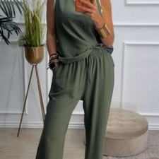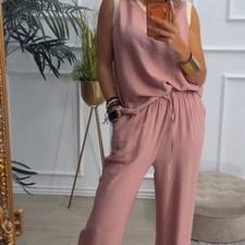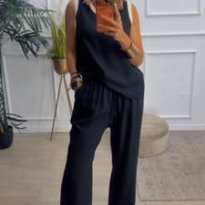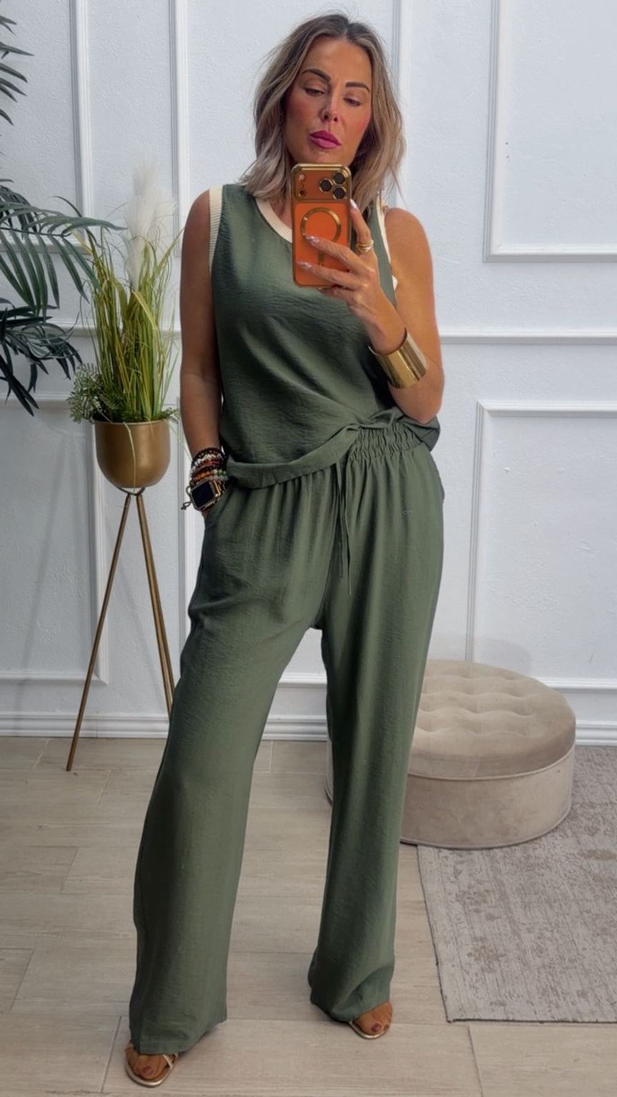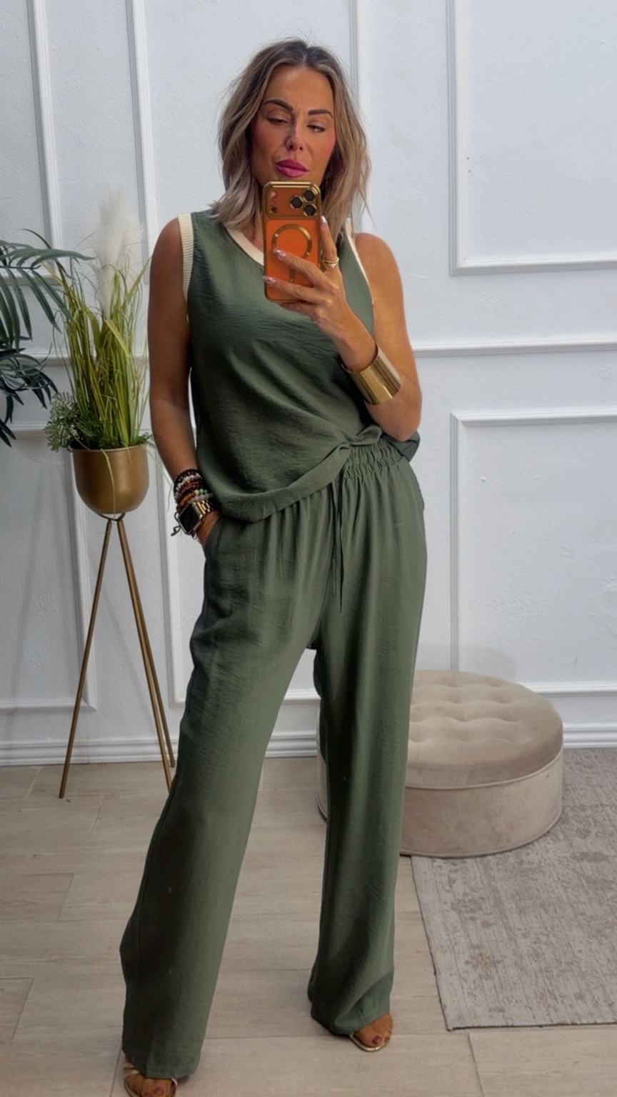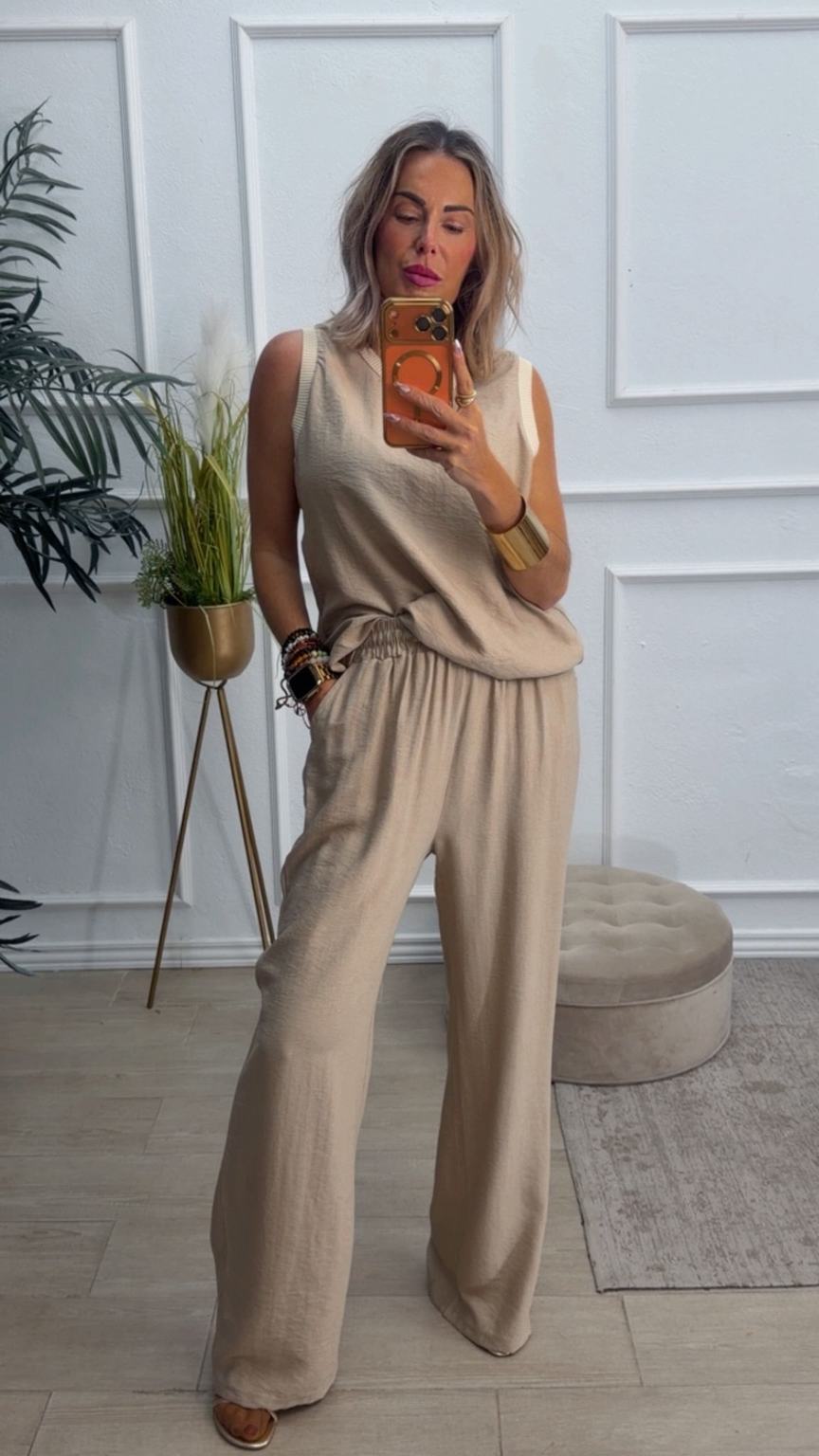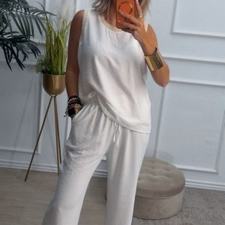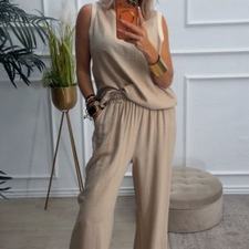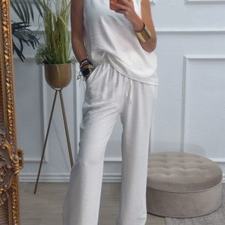 Conjunto formado por blusa y pantalón recto. La blusa tiene el escote redondo con filo en color beige en el cuello y el hueco axilar. El pantalón tiene cinturilla elástica, cordón y bolsillos.
