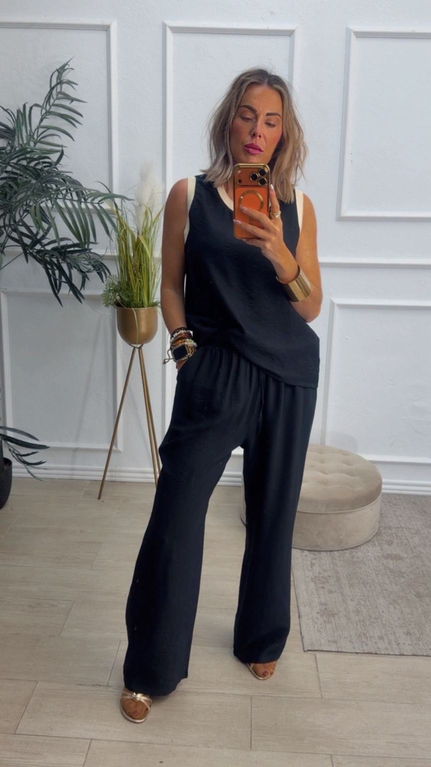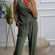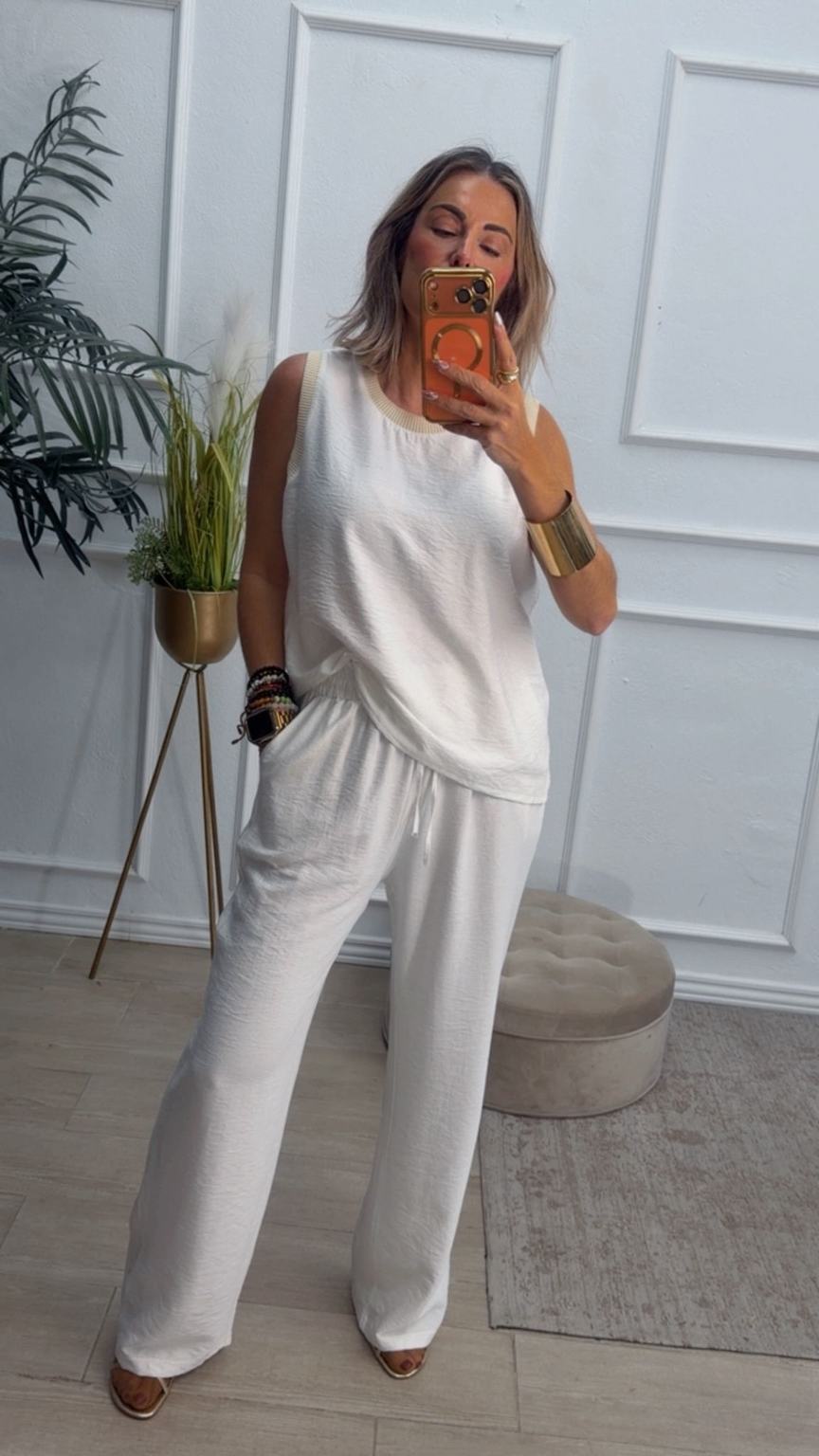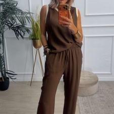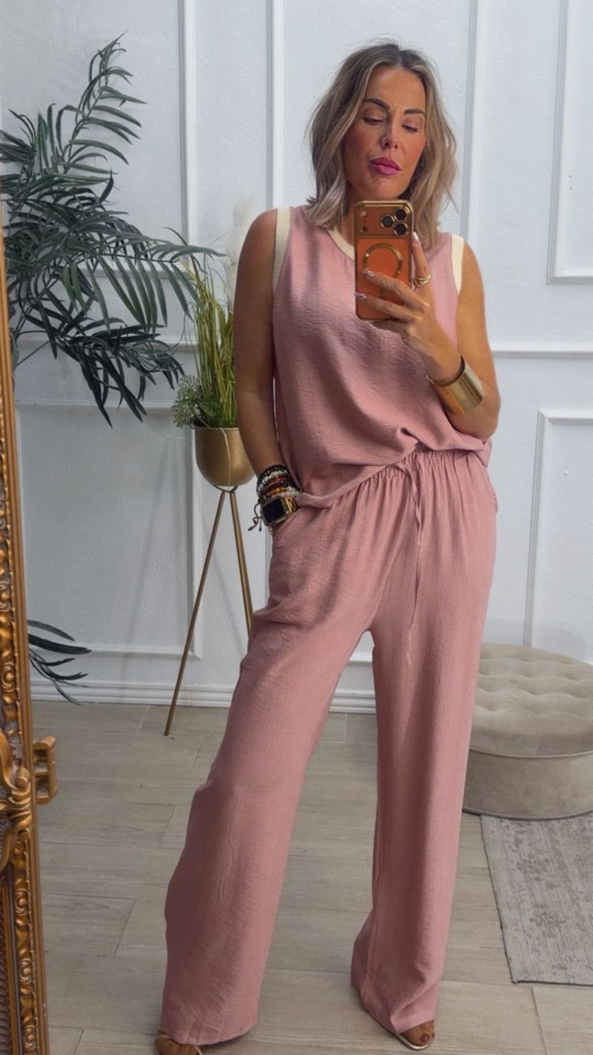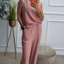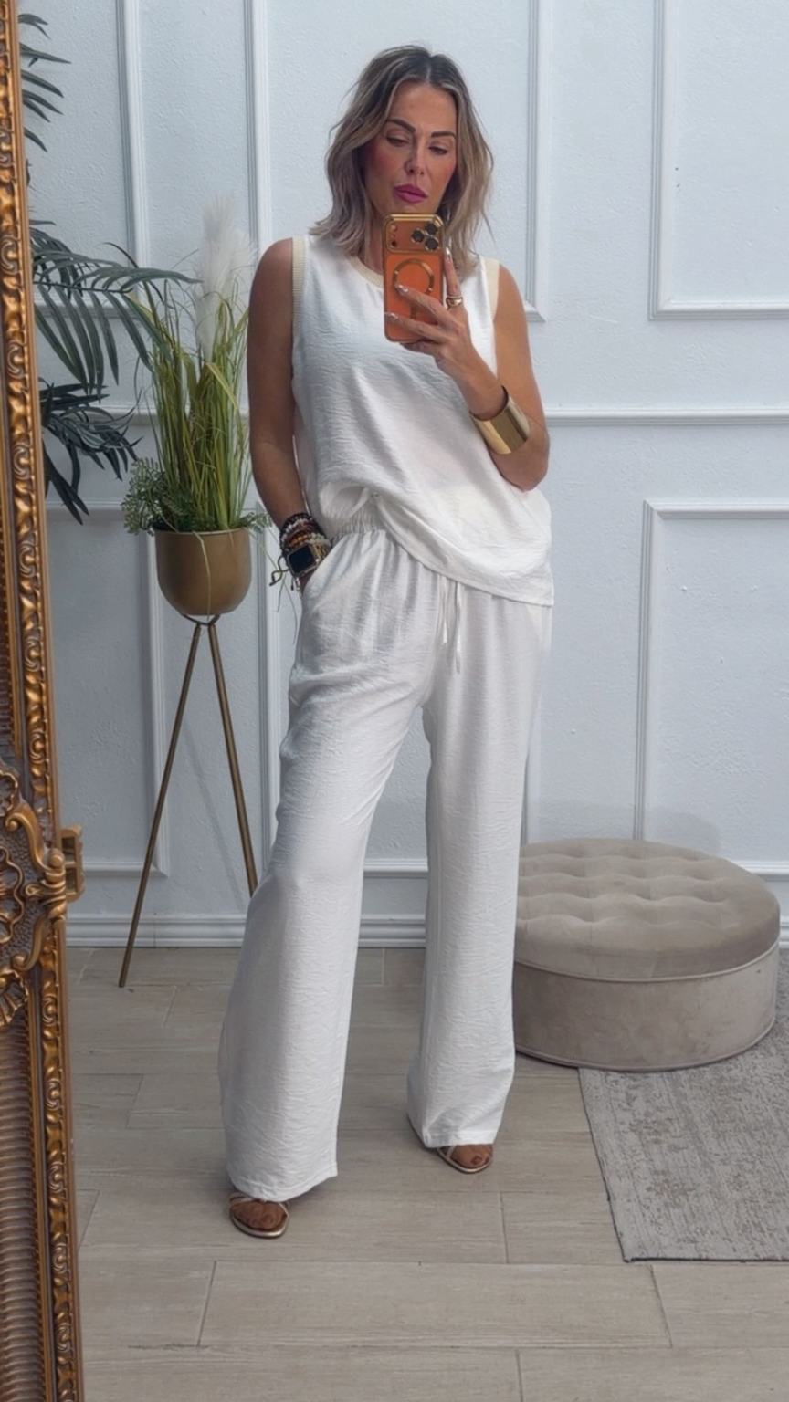 Conjunto formado por blusa y pantalón recto. La blusa tiene el escote redondo con filo en color beige en el cuello y el hueco axilar. El pantalón tiene cinturilla elástica, cordón y bolsillos.