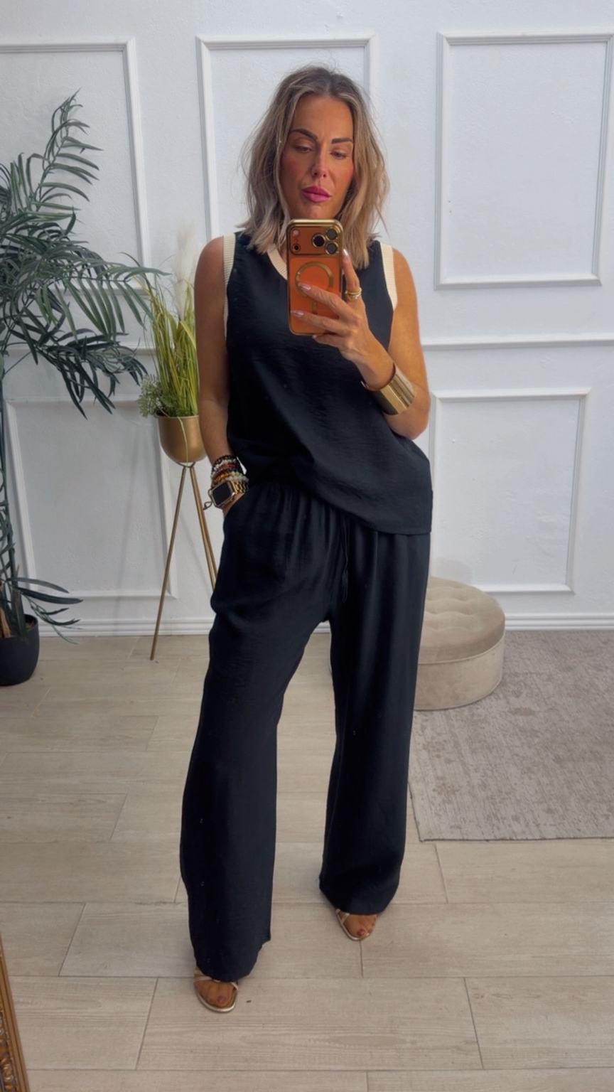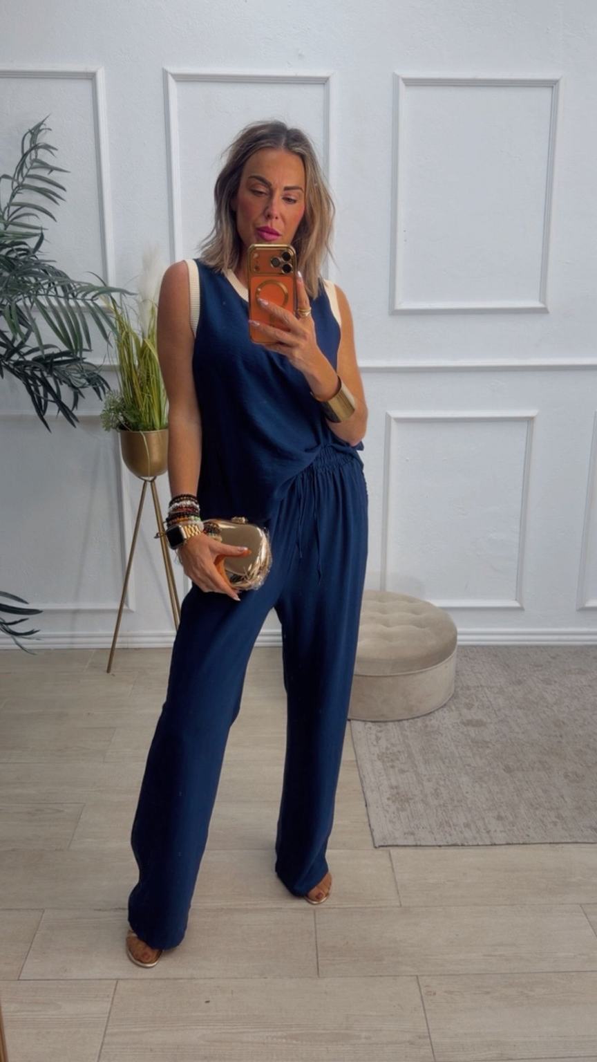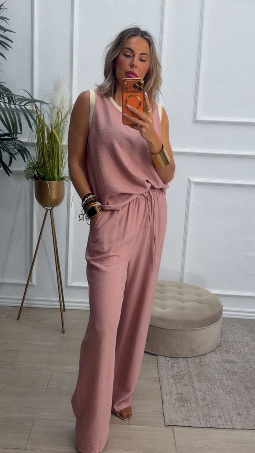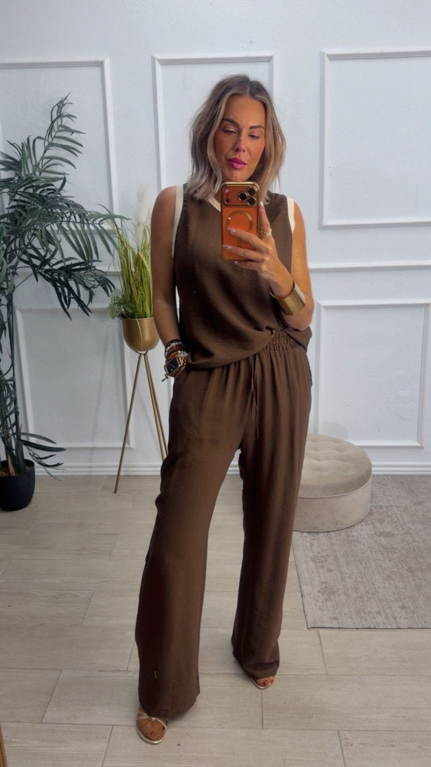 Conjunto formado por blusa y pantalón recto. La blusa tiene el escote redondo con filo en color beige en el cuello y el hueco axilar. El pantalón tiene cinturilla elástica, cordón y bolsillos.