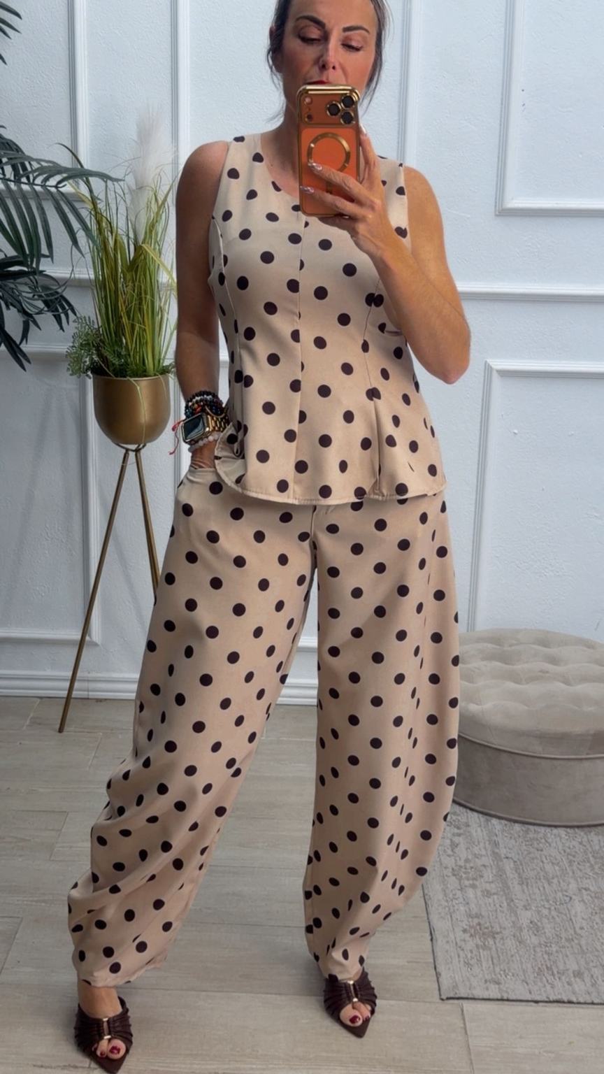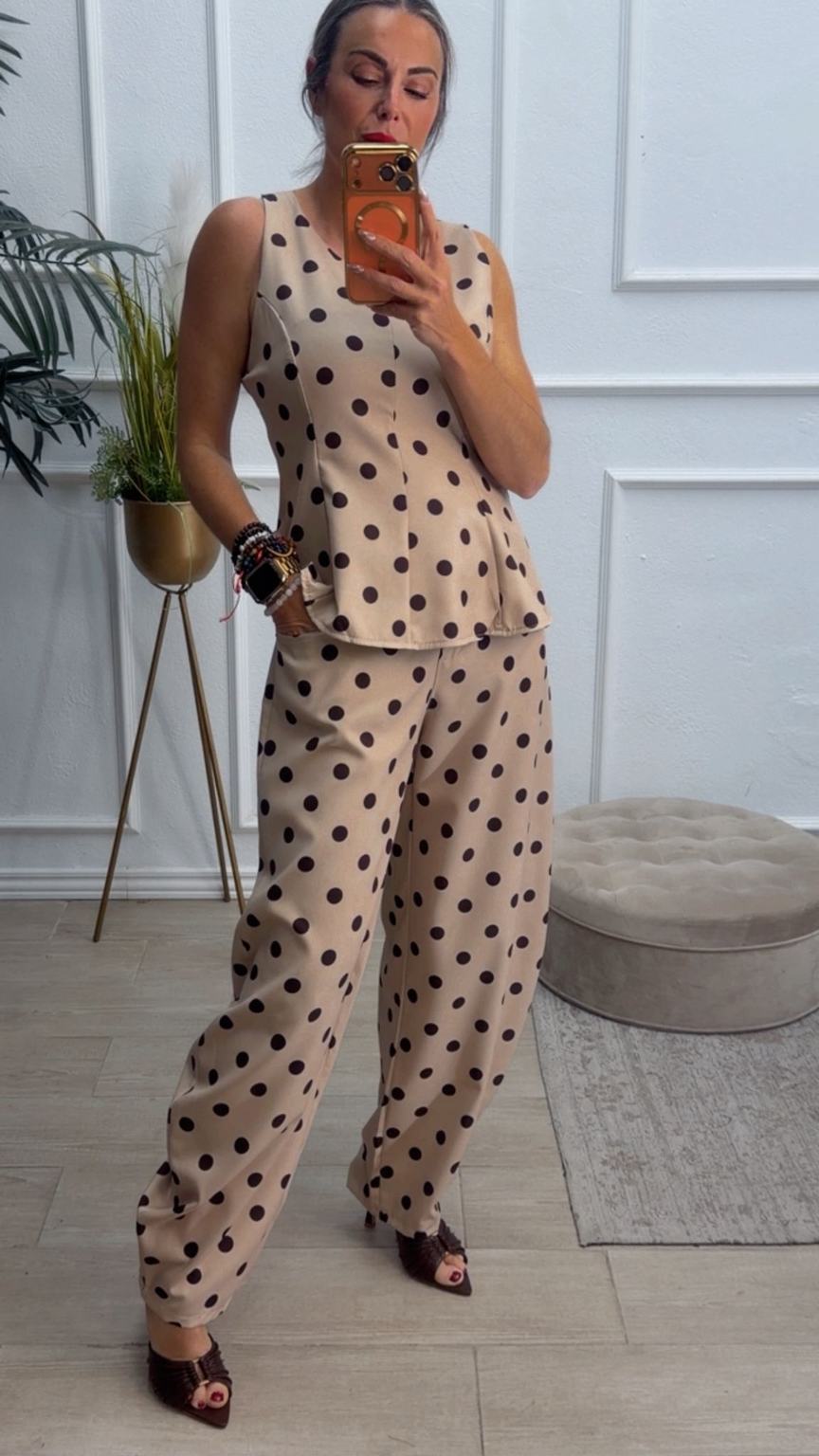 Conjunto beige con lunares marrón chocolate, formado por top sin mangas y pantalón tipo balloum. El top tiene cierre detrás con cremallera y es con vuelo abajo. El pantalón tiene cierre de botón y cremallera, tiene bolsillos y cinturilla con la parte trasera elástica.