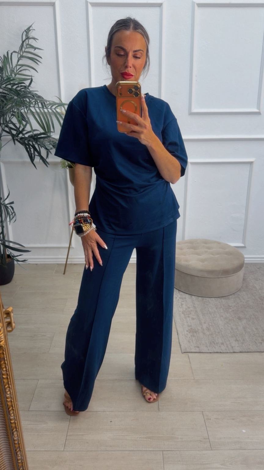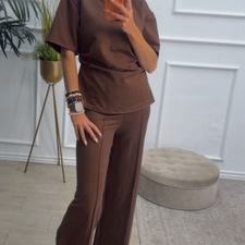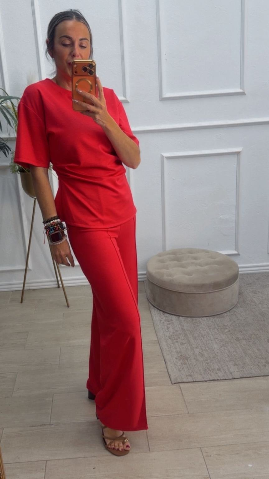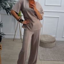 Conjunto de capa de aire con camiseta de mangas cortas y pantalón recto. La camiseta tiene frunces en los lados, abertura pequeña en la espalda y costura de adorno detrás. El pantalón tiene cinturilla elástica con costuras delante de adorno.