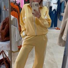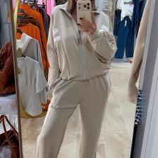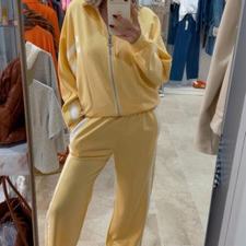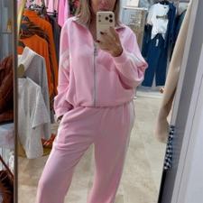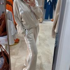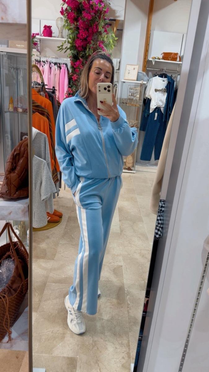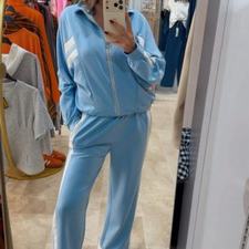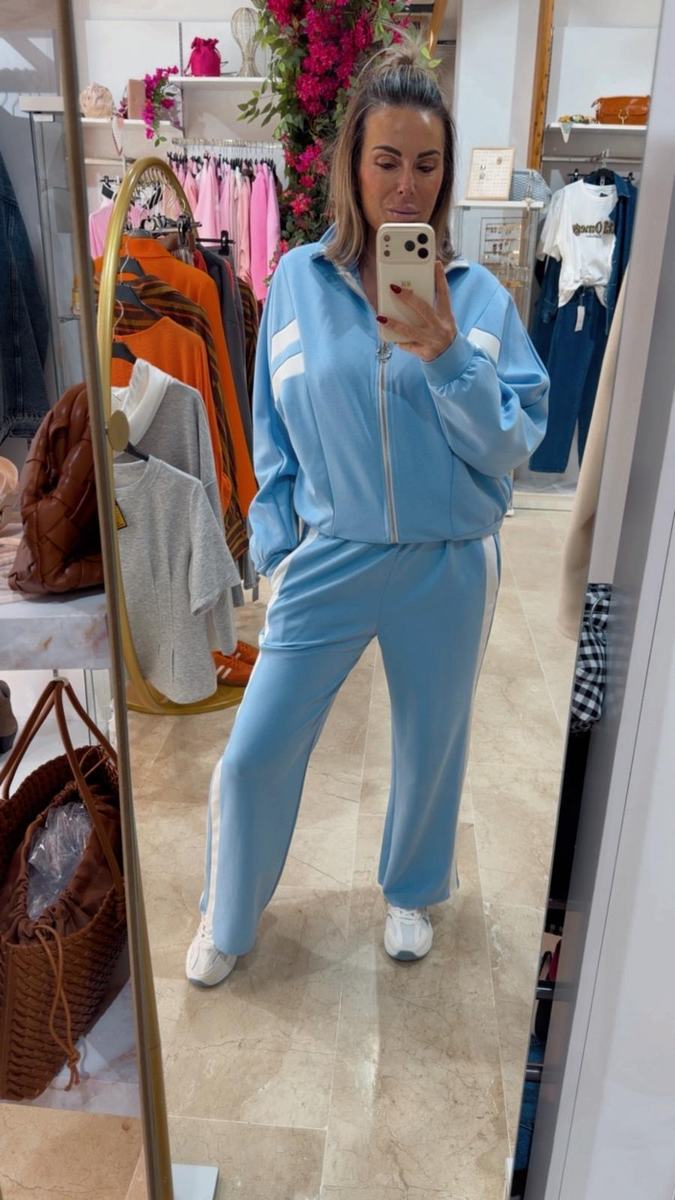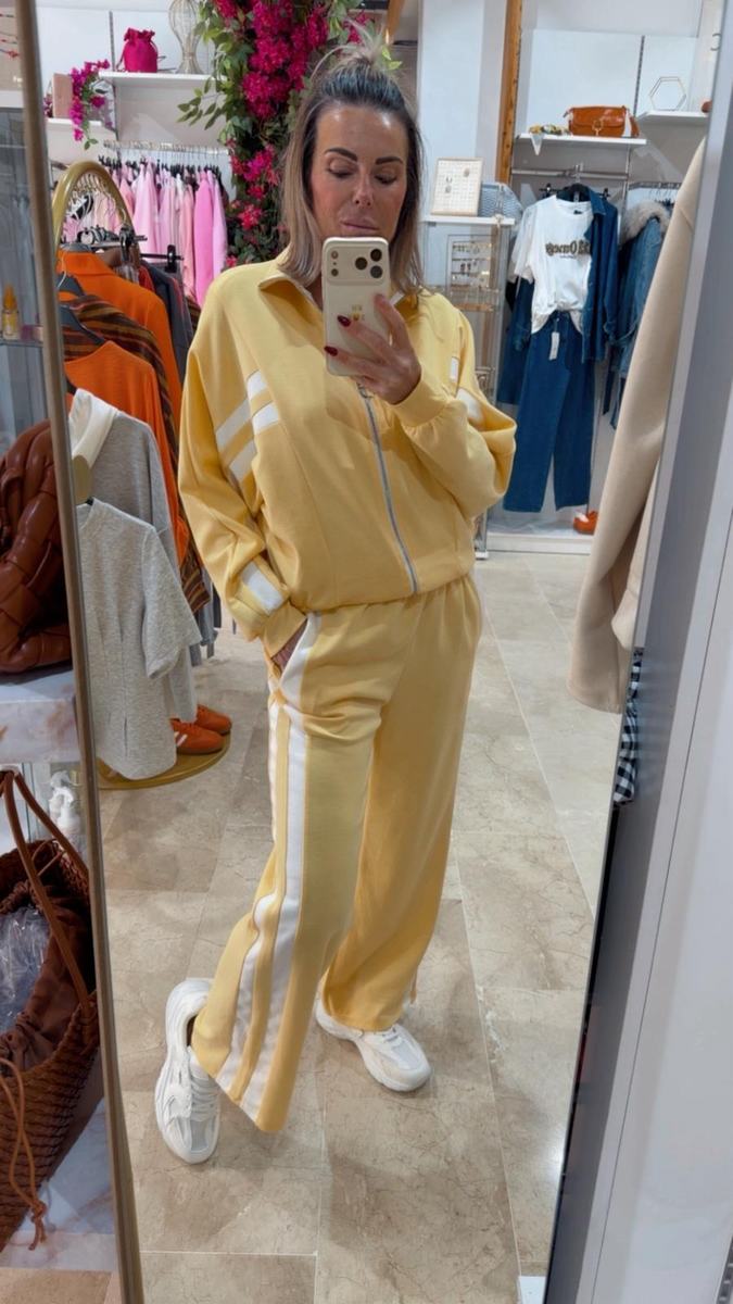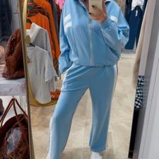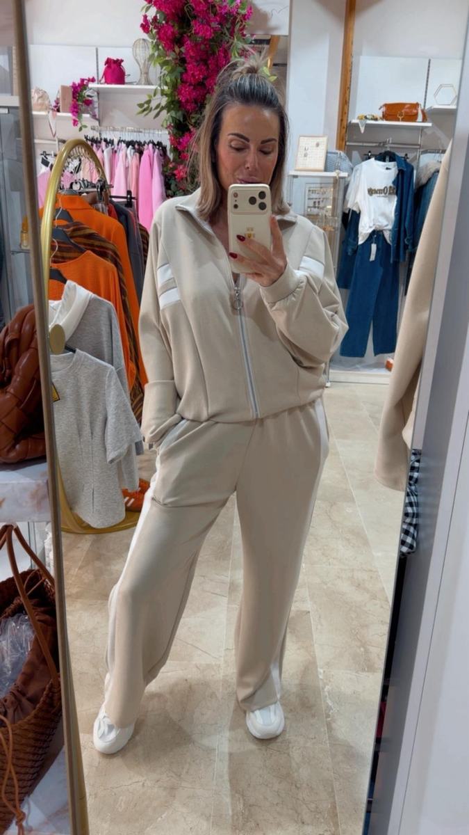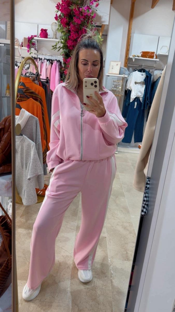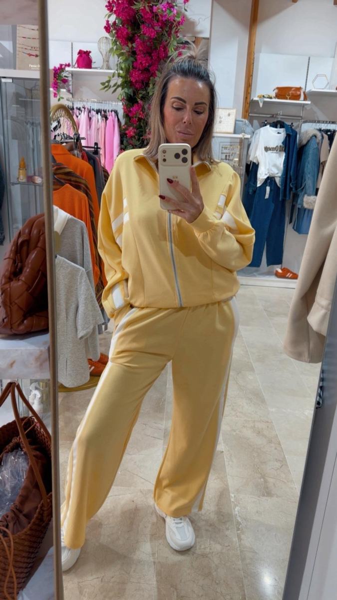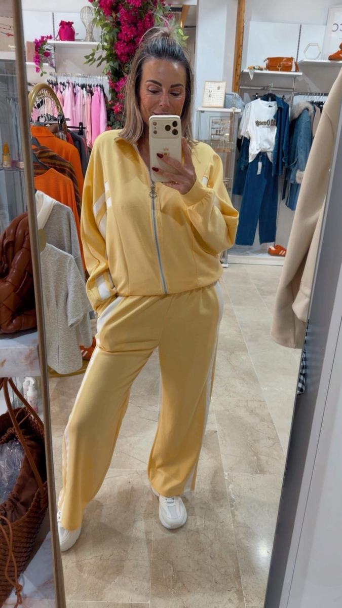 Conjunto deportivo con rayas, formado por sudadera y pantalón de pata recta. La sudadera tiene cierre delante con cremallera. El pantalón tiene cinturilla elástica y bolsillos.