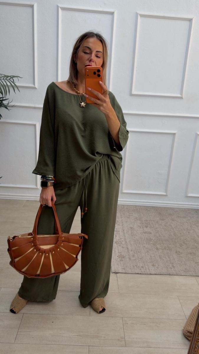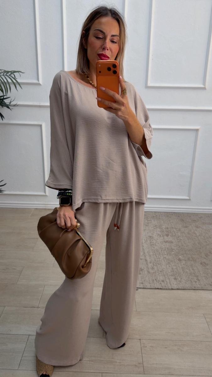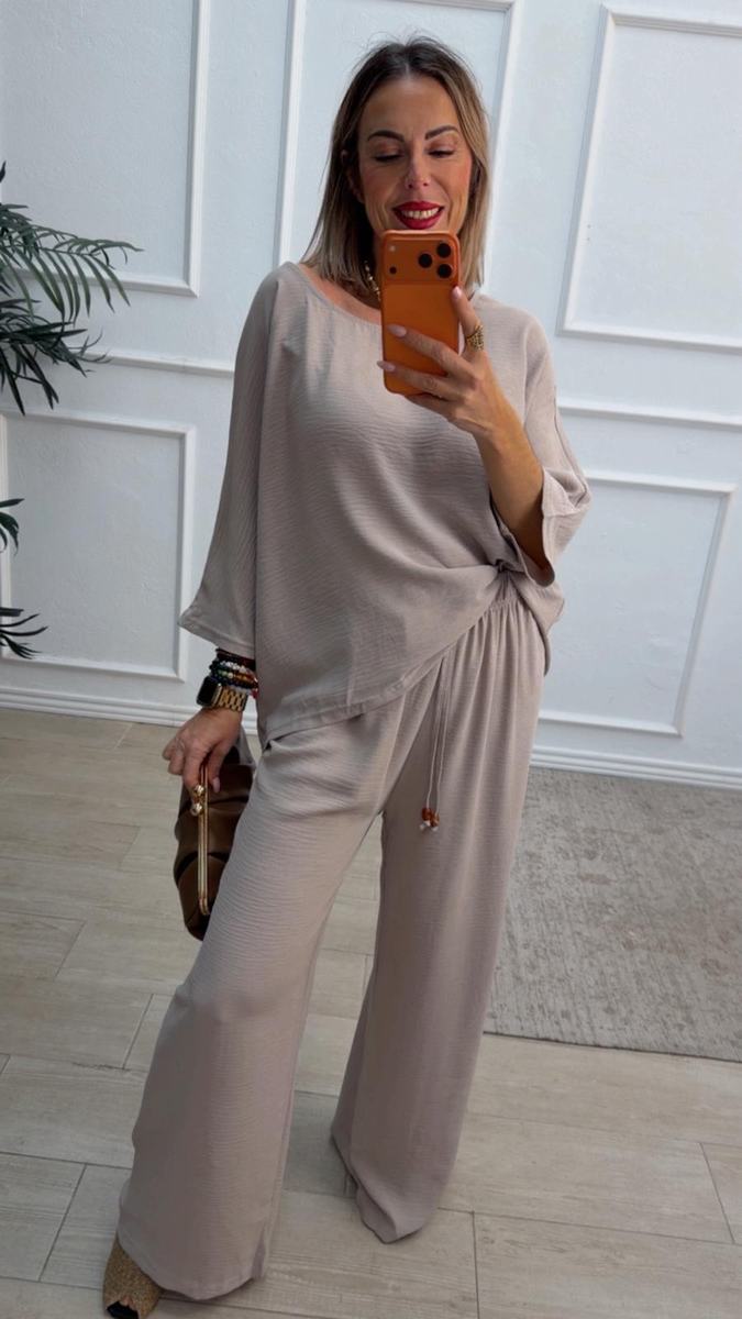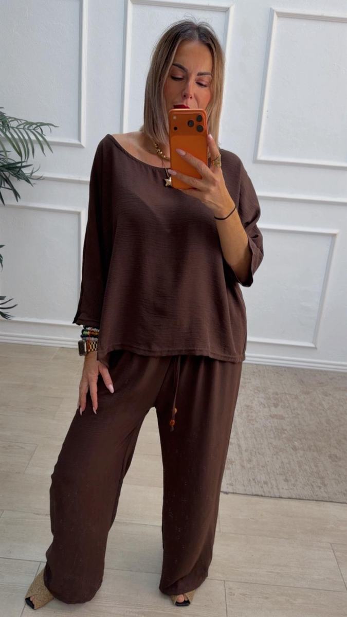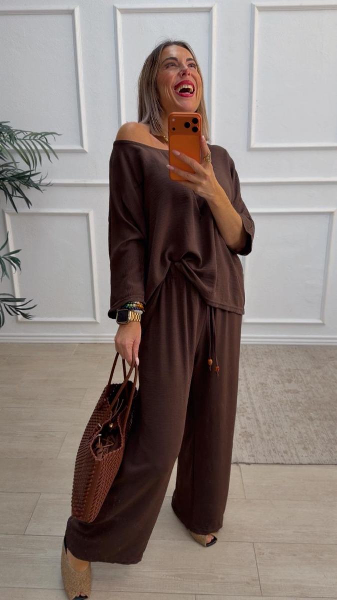 Conjunto formado por blusa y pantalón. La blusa tiene mangas tres cuartos, escote redondo amplio, se puede poner con un hombro fuera. El pantalón es fluído, de pata recta y un poco ancha, con cinturilla elástica. Tiene lazo delante de adorno.