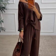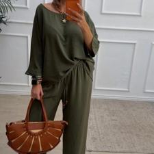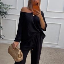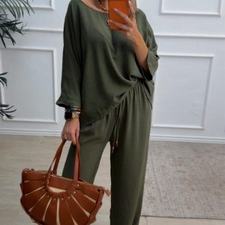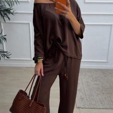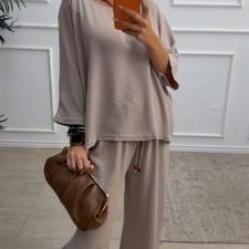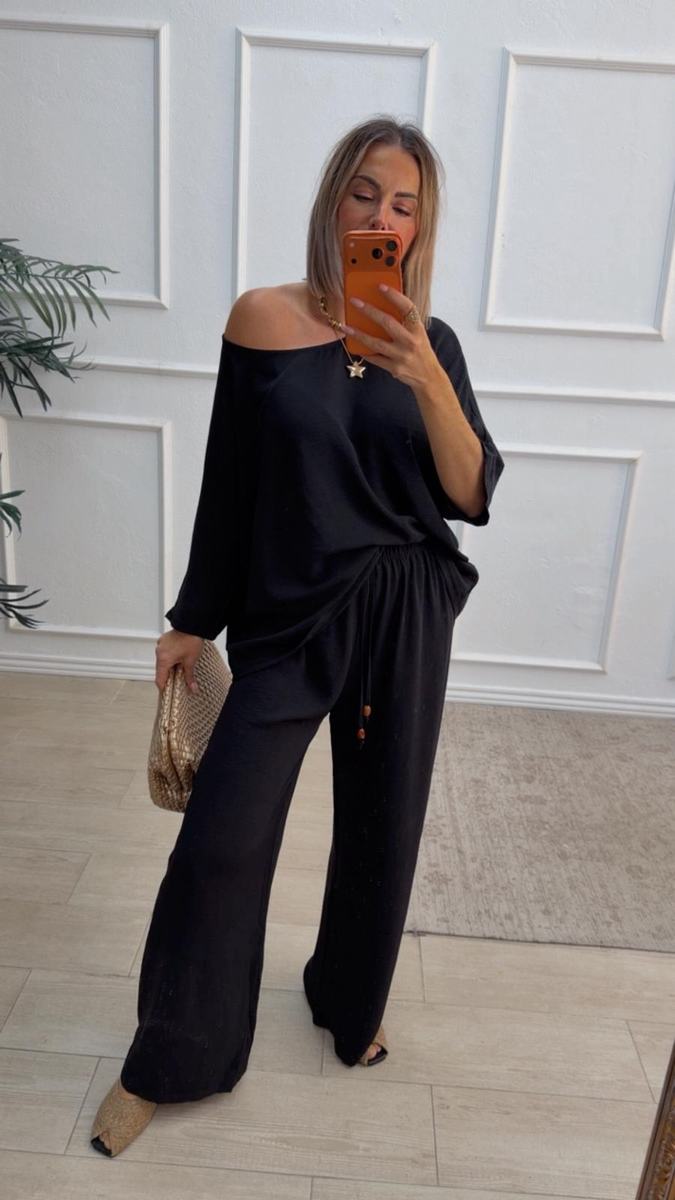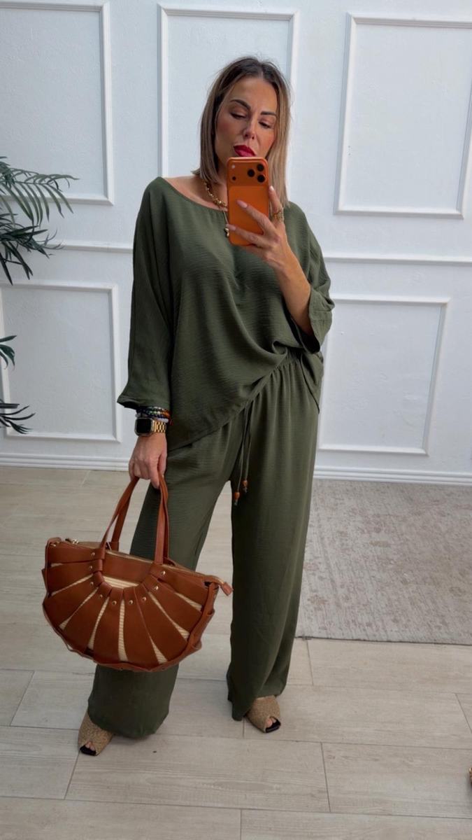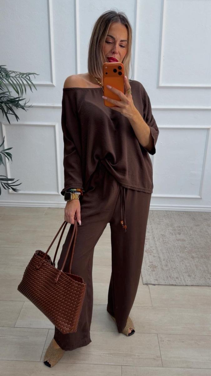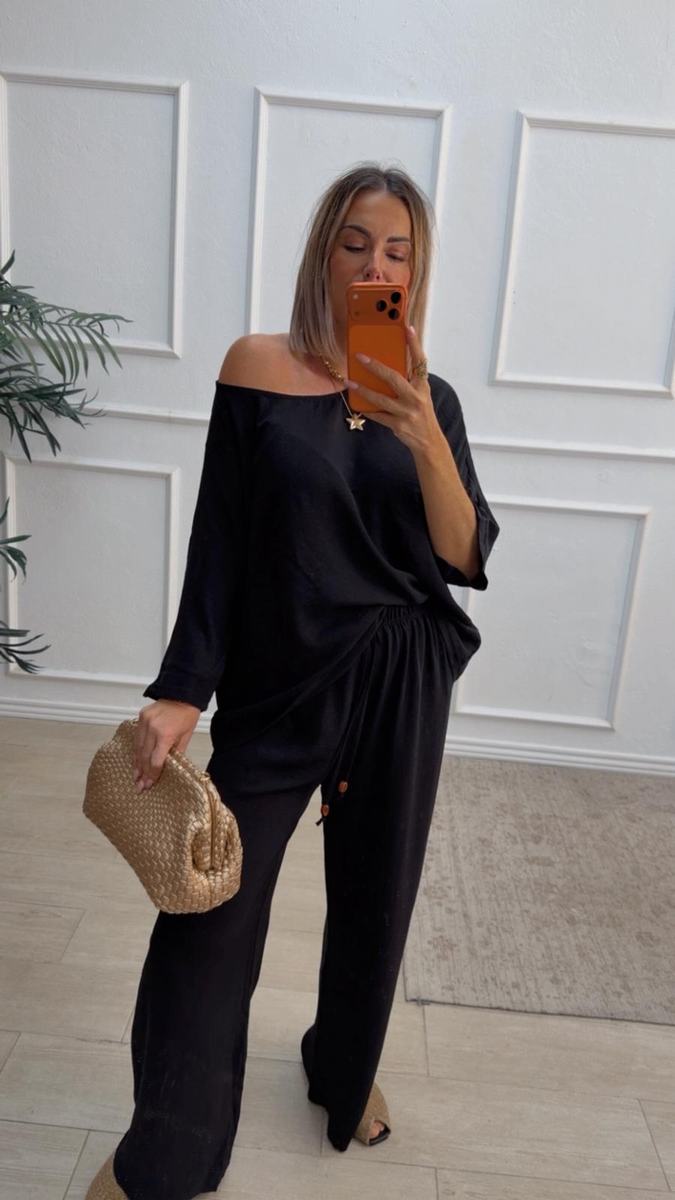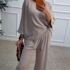 Conjunto formado por blusa y pantalón. La blusa tiene mangas tres cuartos, escote redondo amplio, se puede poner con un hombro fuera. El pantalón es fluído, de pata recta y un poco ancha, con cinturilla elástica. Tiene lazo delante de adorno.