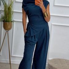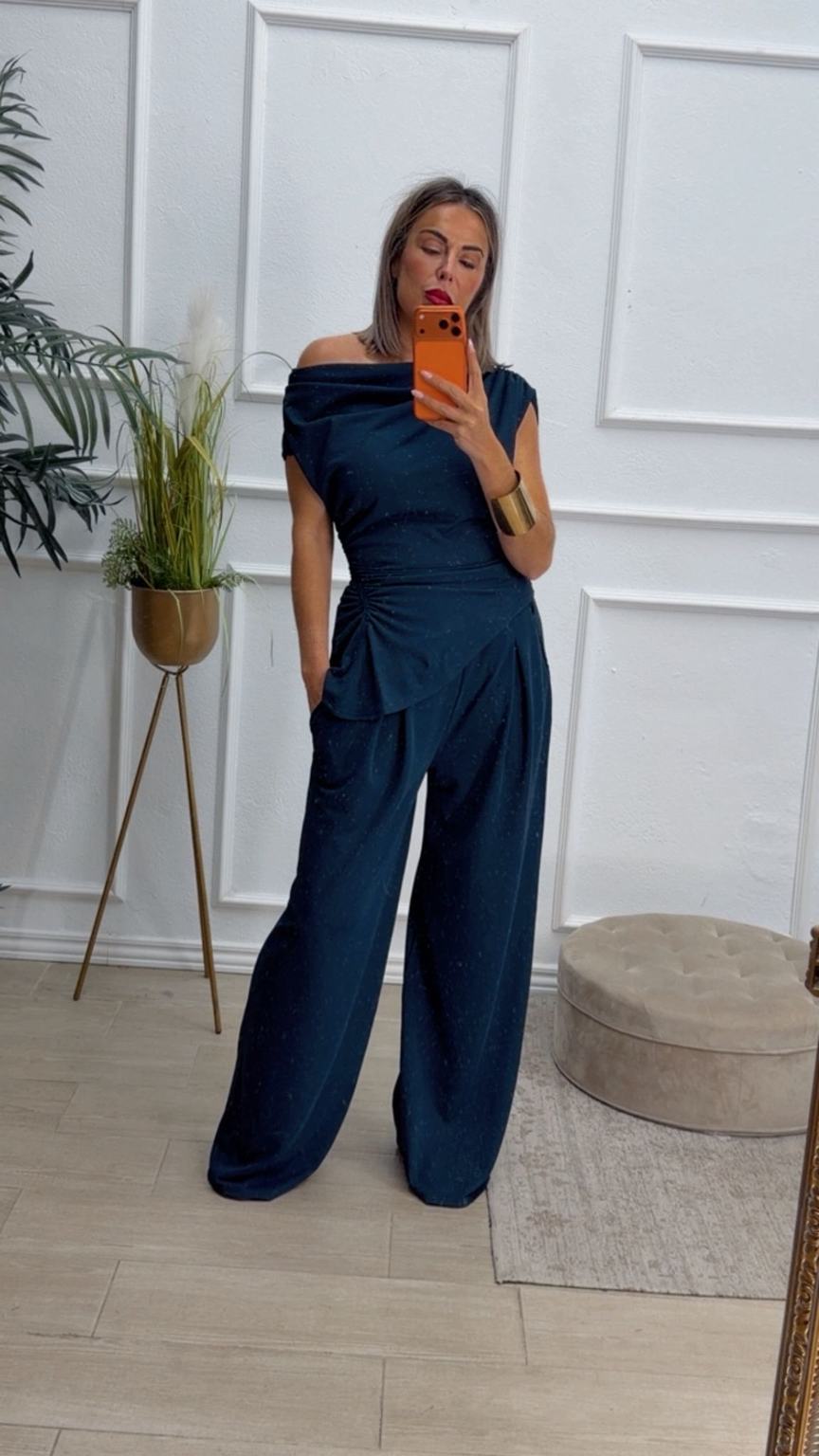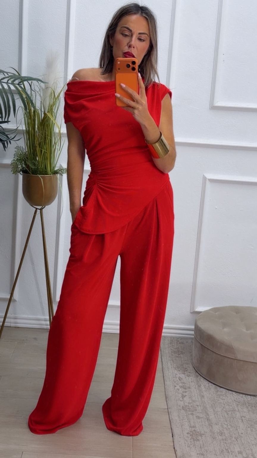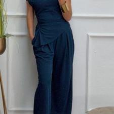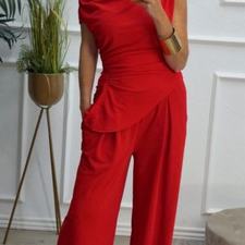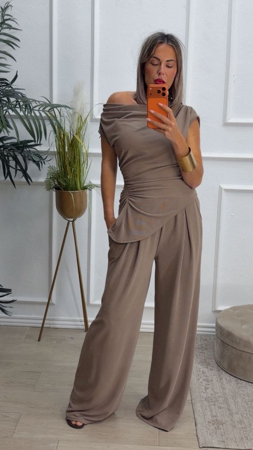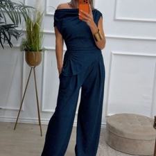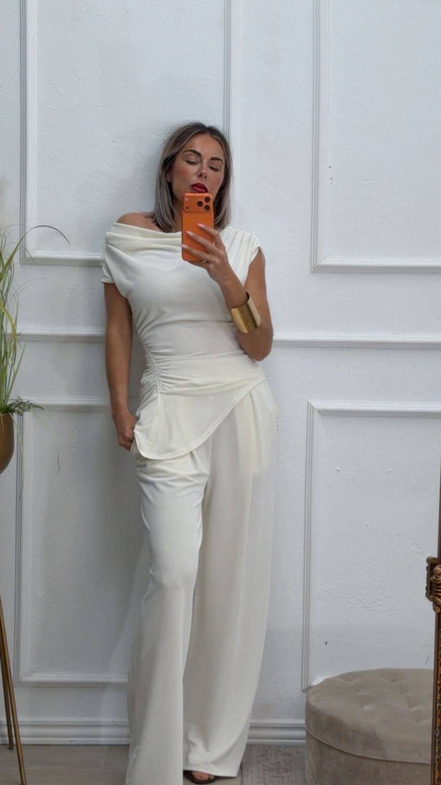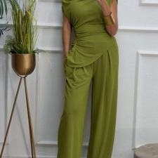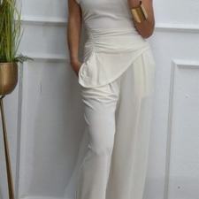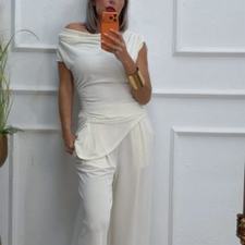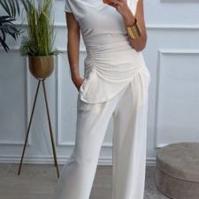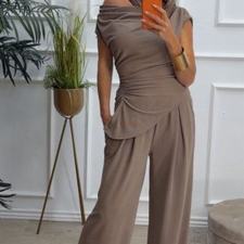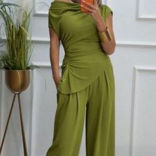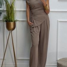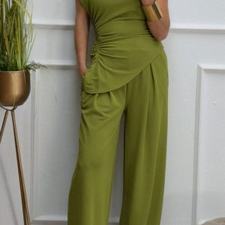 Conjunto formado por top asimétrico y pantalón recto. El top tiene frunces en los lados y se puede poner con un hombro fuera. El pantalón tiene cinturilla elástica.