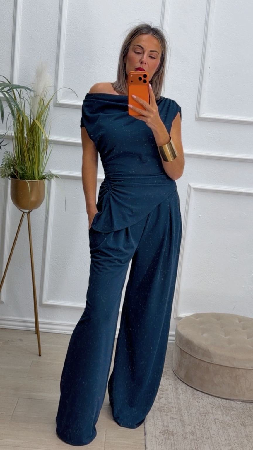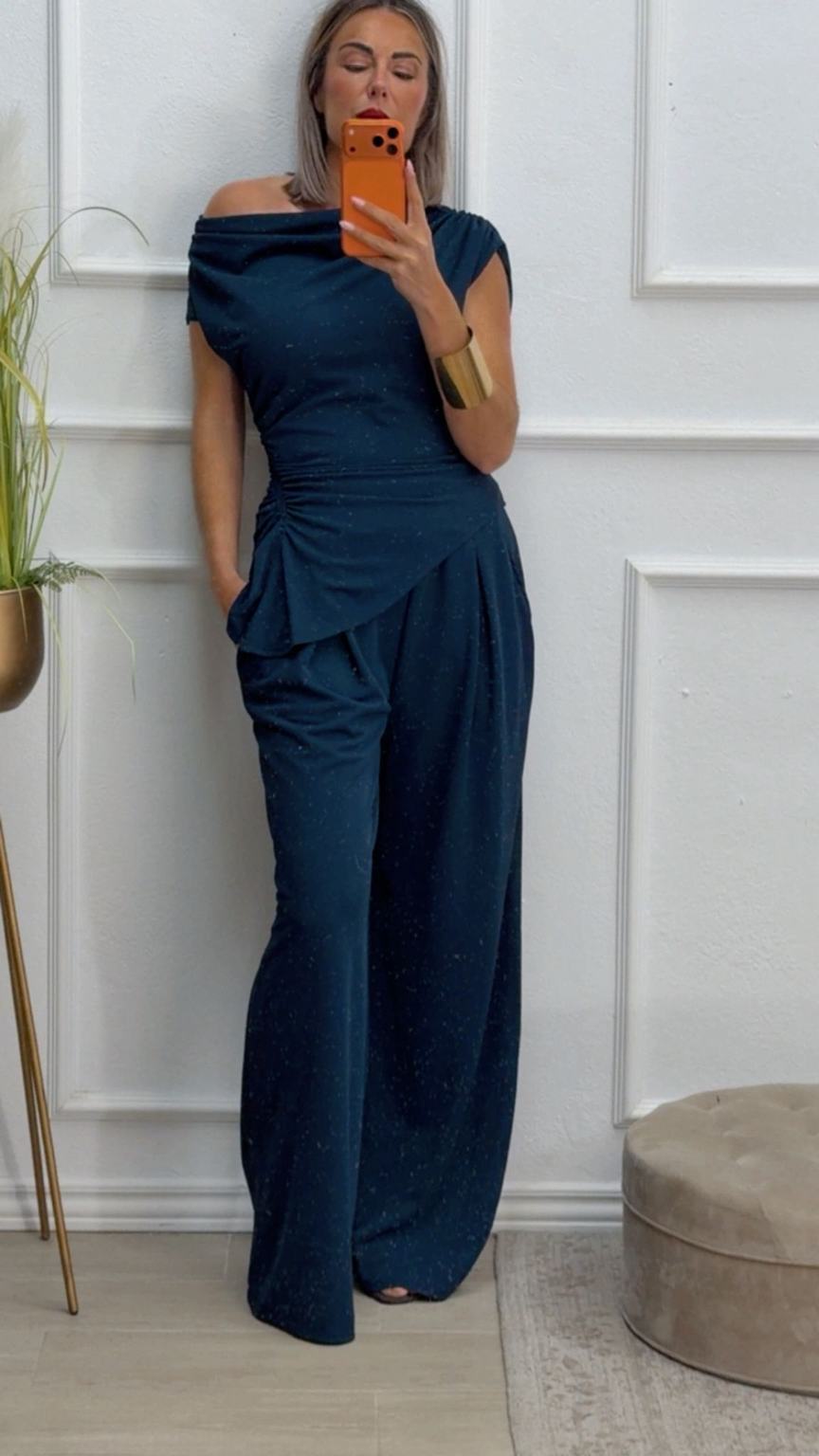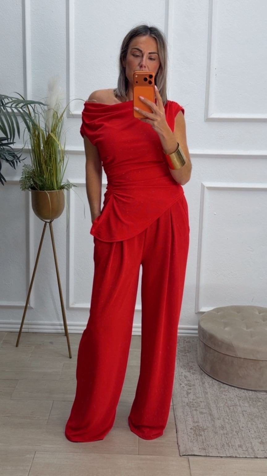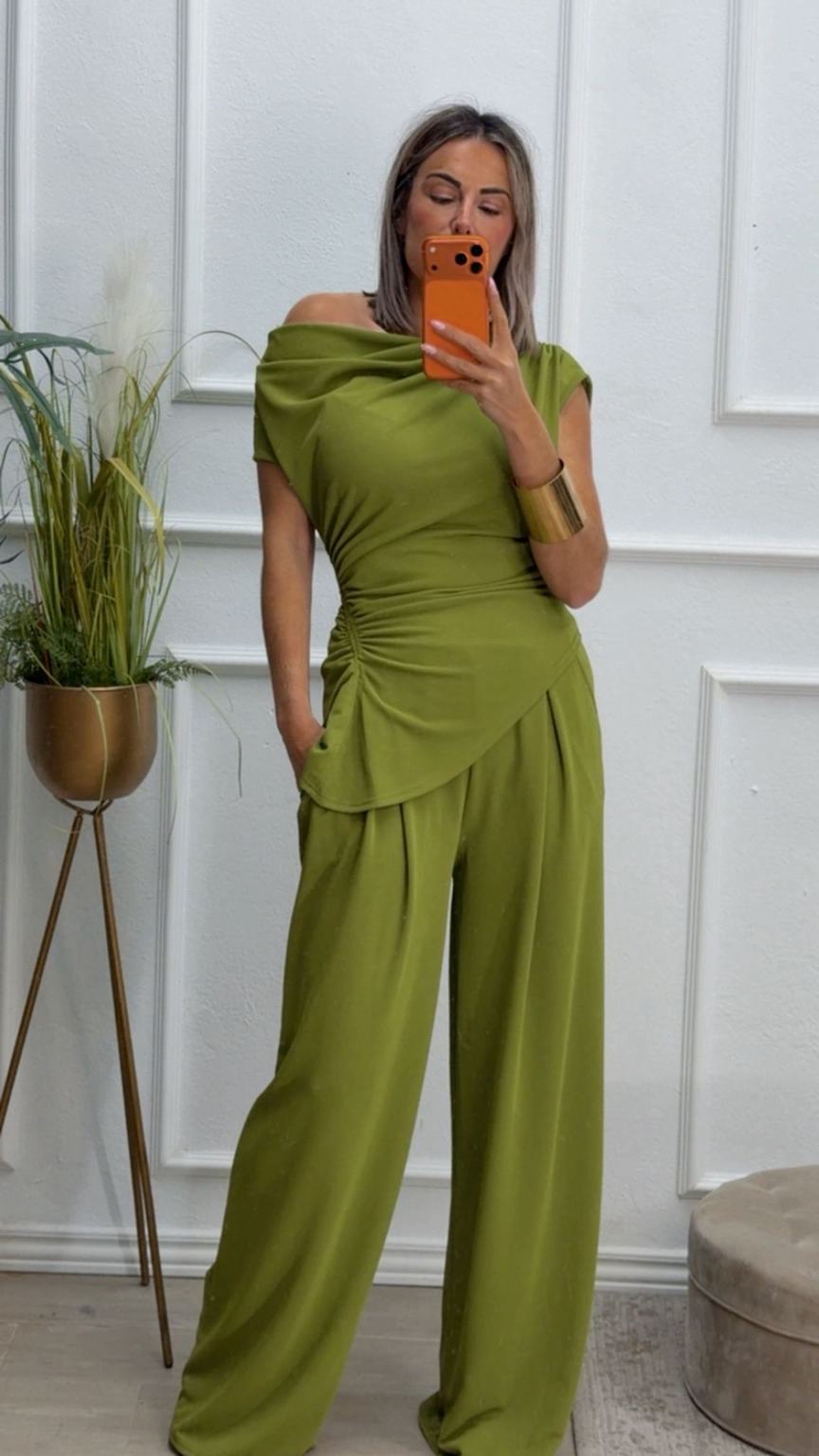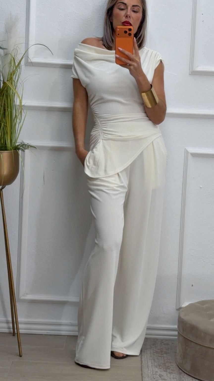 Conjunto formado por top asimétrico y pantalón recto. El top tiene frunces en los lados y se puede poner con un hombro fuera. El pantalón tiene cinturilla elástica.