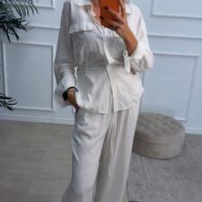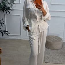 Conjunto formado por camisa y pantalón. La camisa tiene cierre delante con botones, bolsillos en el pecho y cinchas para ajustar a los lados. El pantalón es recto, con cinturilla elástica, lazo delante de adorno y bolsillos.