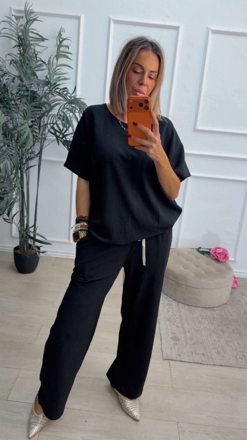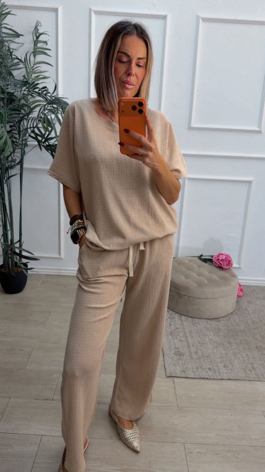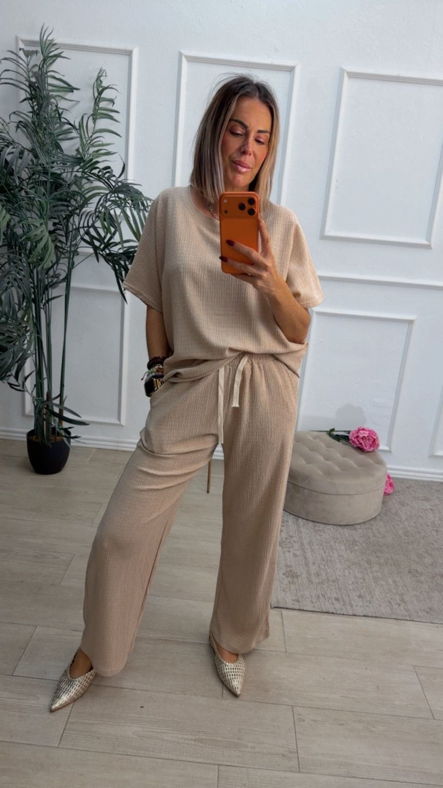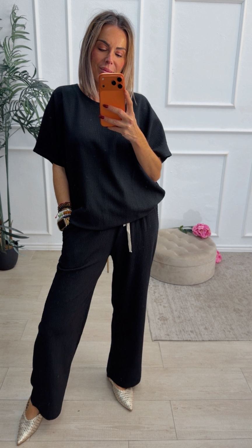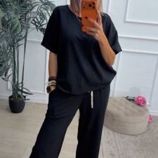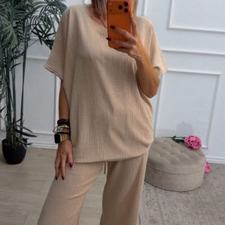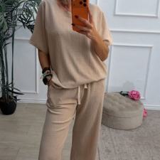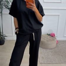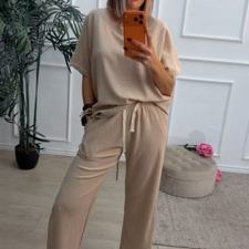 Conjunto formado por camiseta de mangas cortas y pantalón recto. La camiseta tiene el escote redondo. El pantalón tiene cinturilla elástica con cordón para ajustar y bolsillos.