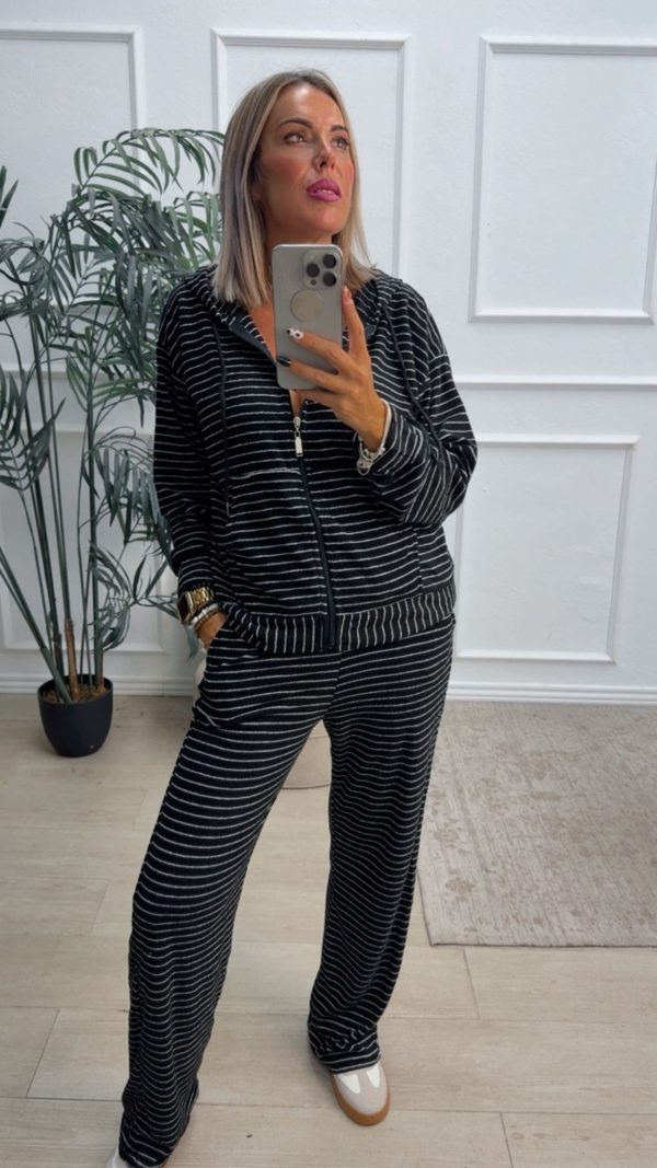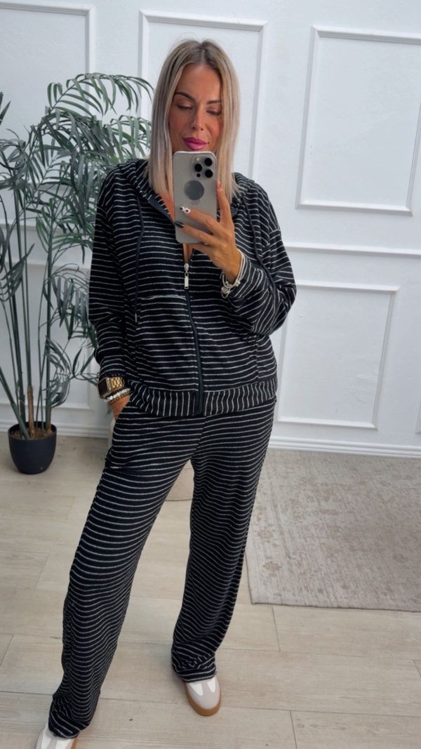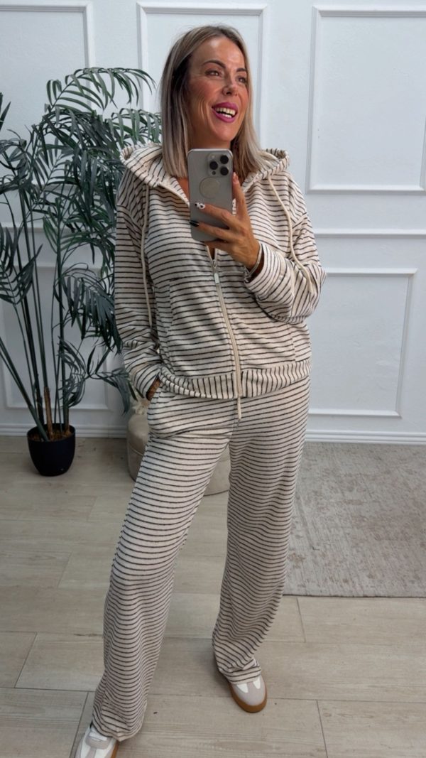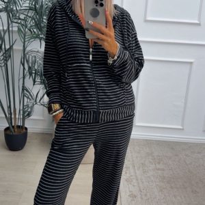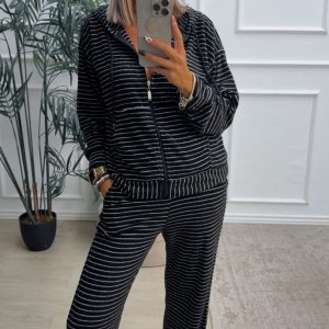 Conjunto deportivo estampado de rayas formado por sudadera y pantalón de pata ancha. La sudadera tiene cierre con cremallera y capucha. El pantalón tiene cinturilla elástica y bolsillos.