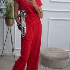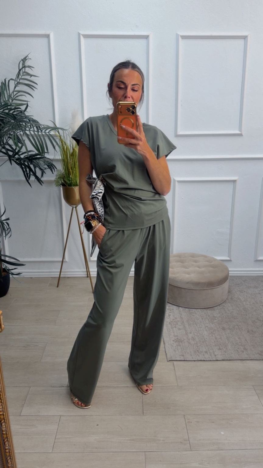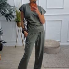 Conjunto con camiseta de mangas cortas y pantalón recto. La camiseta tiene frunces en un lado con detalle de lazo estampado. El pantalón tiene cinturilla elástica y bolsillos.
