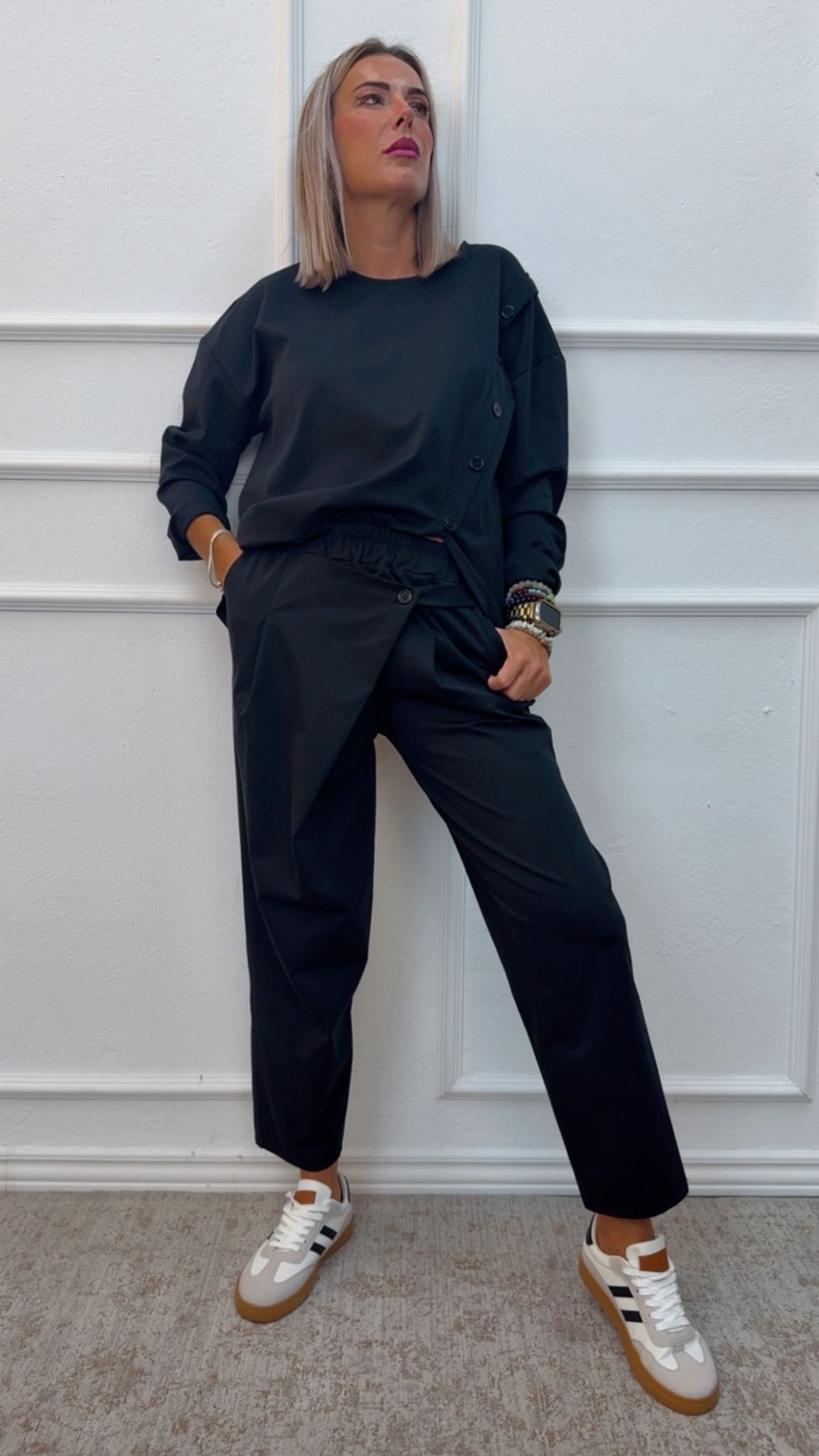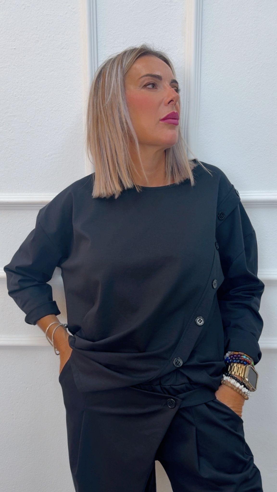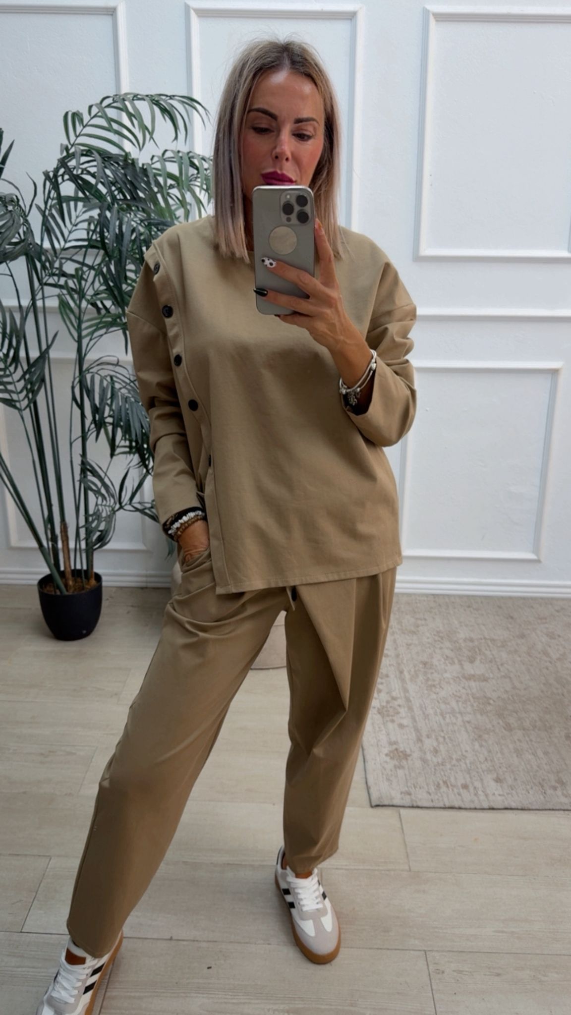 Conjunto formado por camiseta de mangas largas, y pantalón largo. La camiseta tiene escote redondo, y tiene delante en el lateral botones de adorno y abertura delante en el lado. El pantalón es de tipo balloun, tiene cinturilla elástica y delante tiene tira de adorno con un botón ajustable.