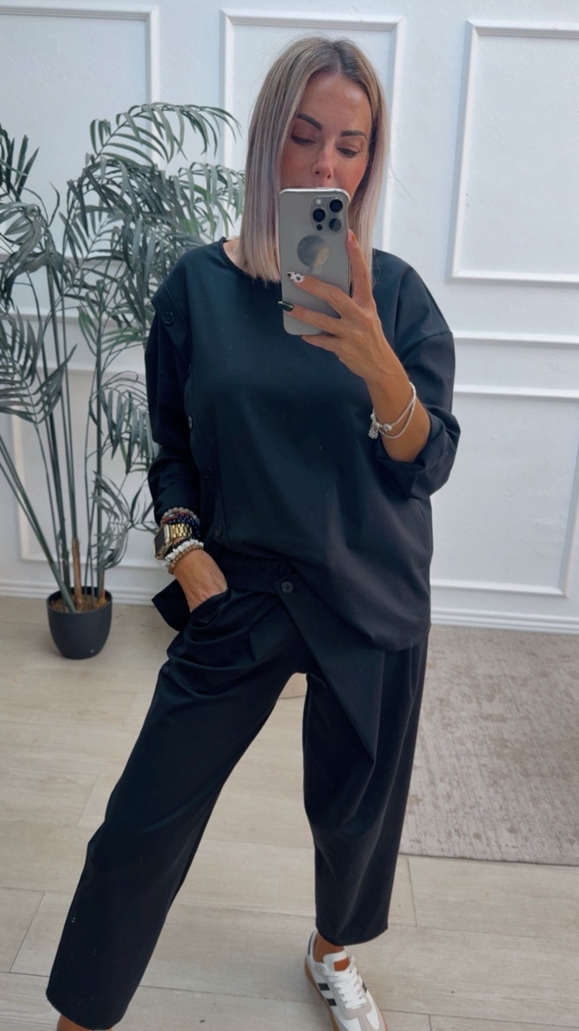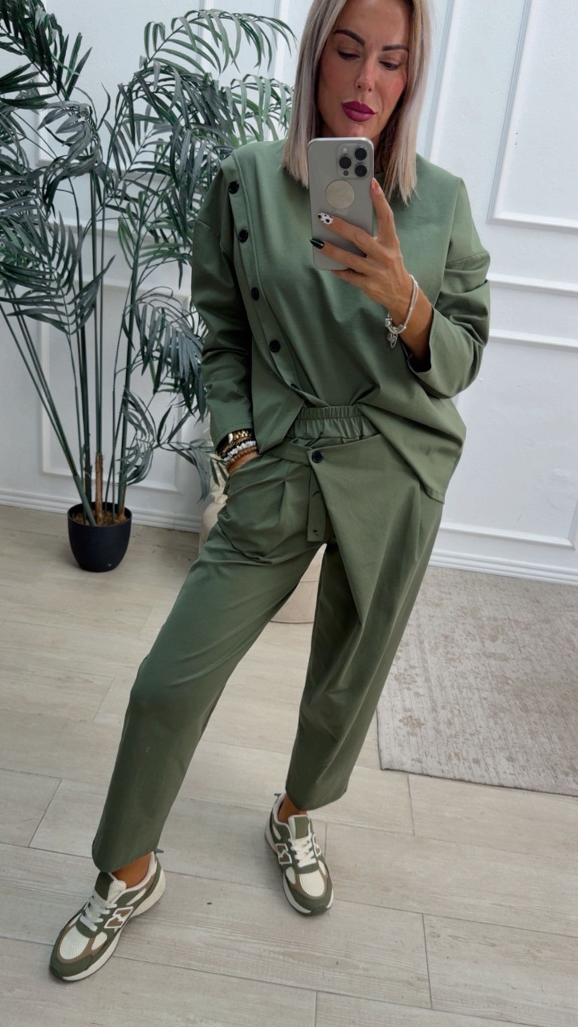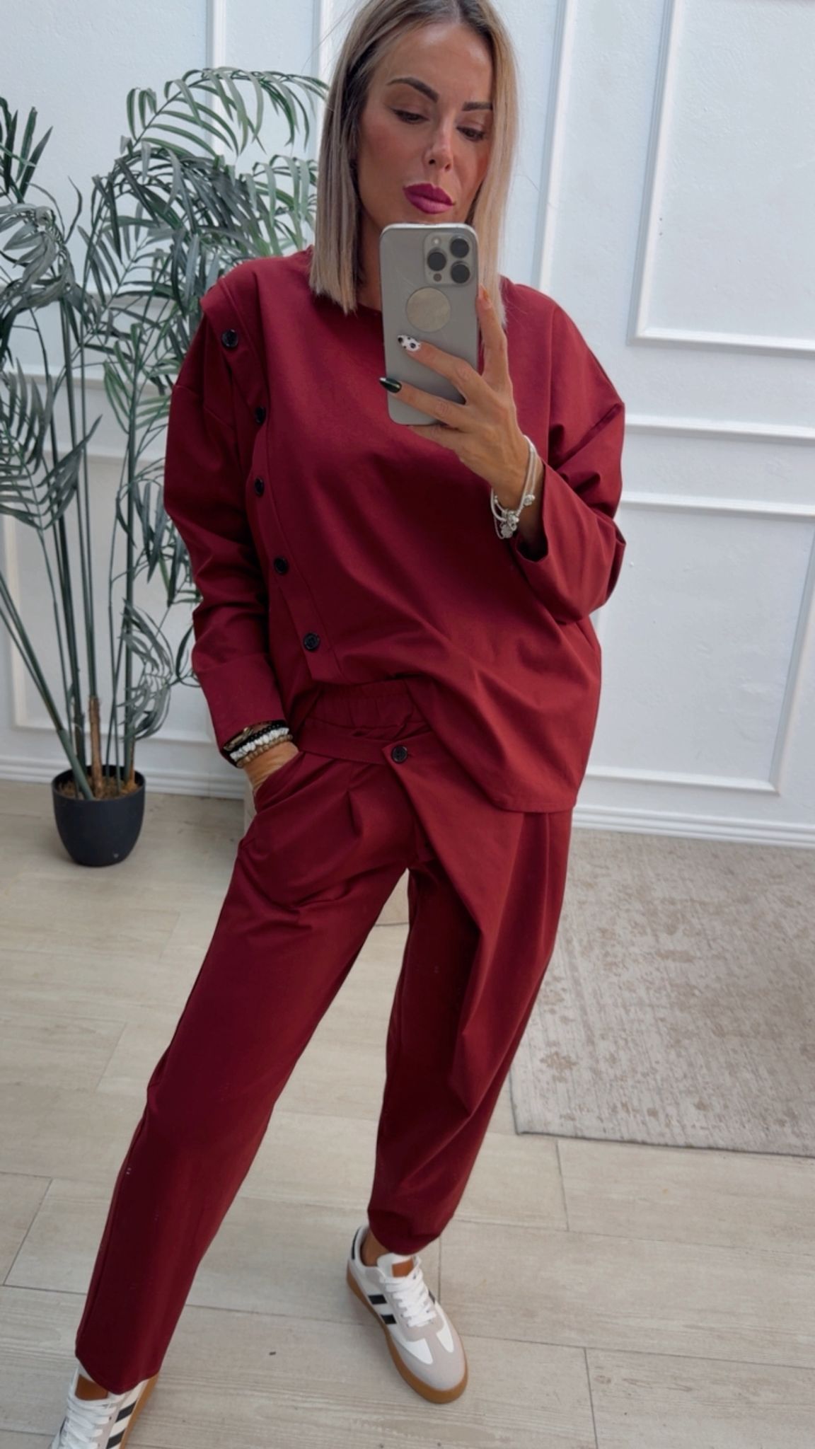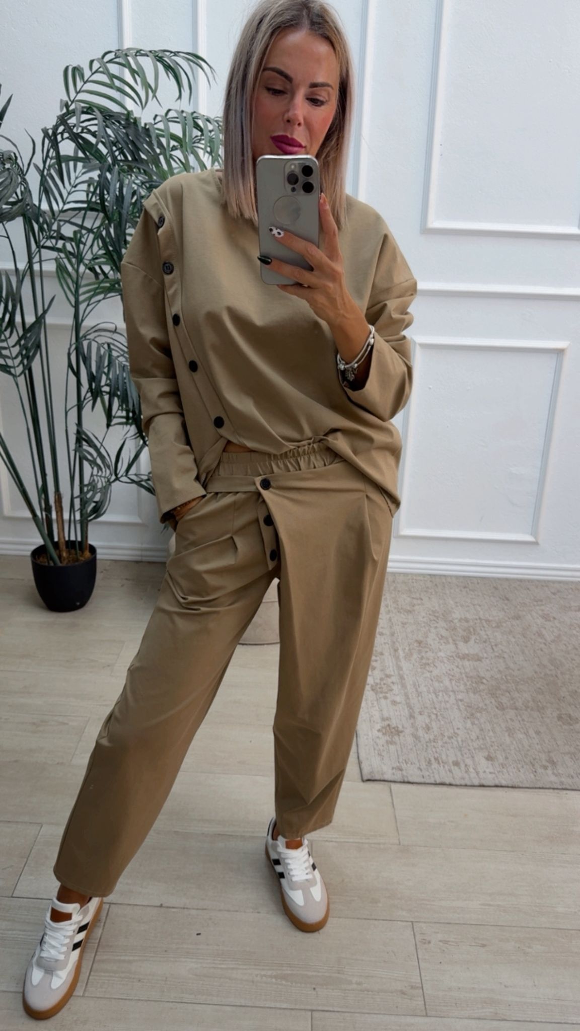Conjunto formado por camiseta de mangas largas, y pantalón largo. La camiseta tiene escote redondo, y tiene delante en el lateral botones de adorno y abertura delante en el lado. El pantalón es de tipo balloun, tiene cinturilla elástica y delante tiene tira de adorno con un botón ajustable.