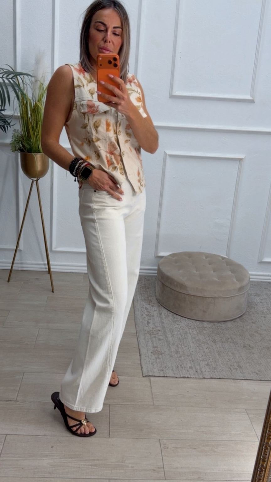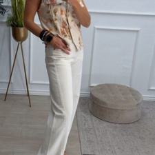 Pantalón vaquero tipo balloum, de color blanco roto. Tiene cierre de botón y cremallera.
