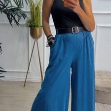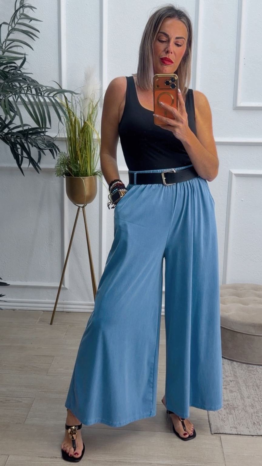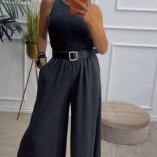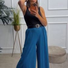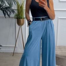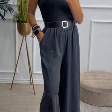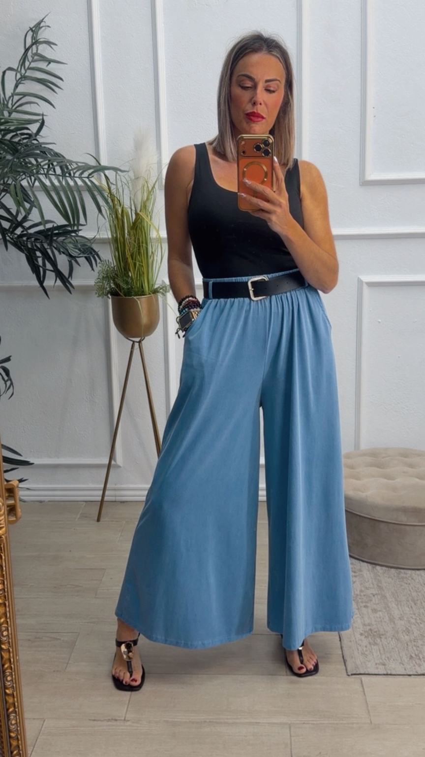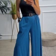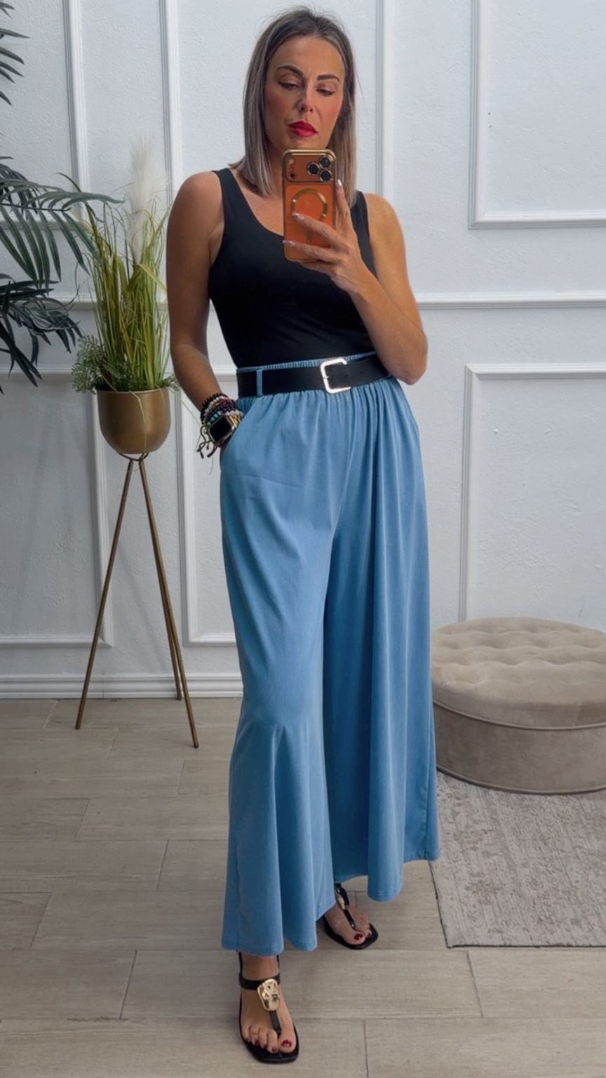 Pantalón de pata ancha con cinturilla elástica, tiene bolsillos e incluye cinturón.