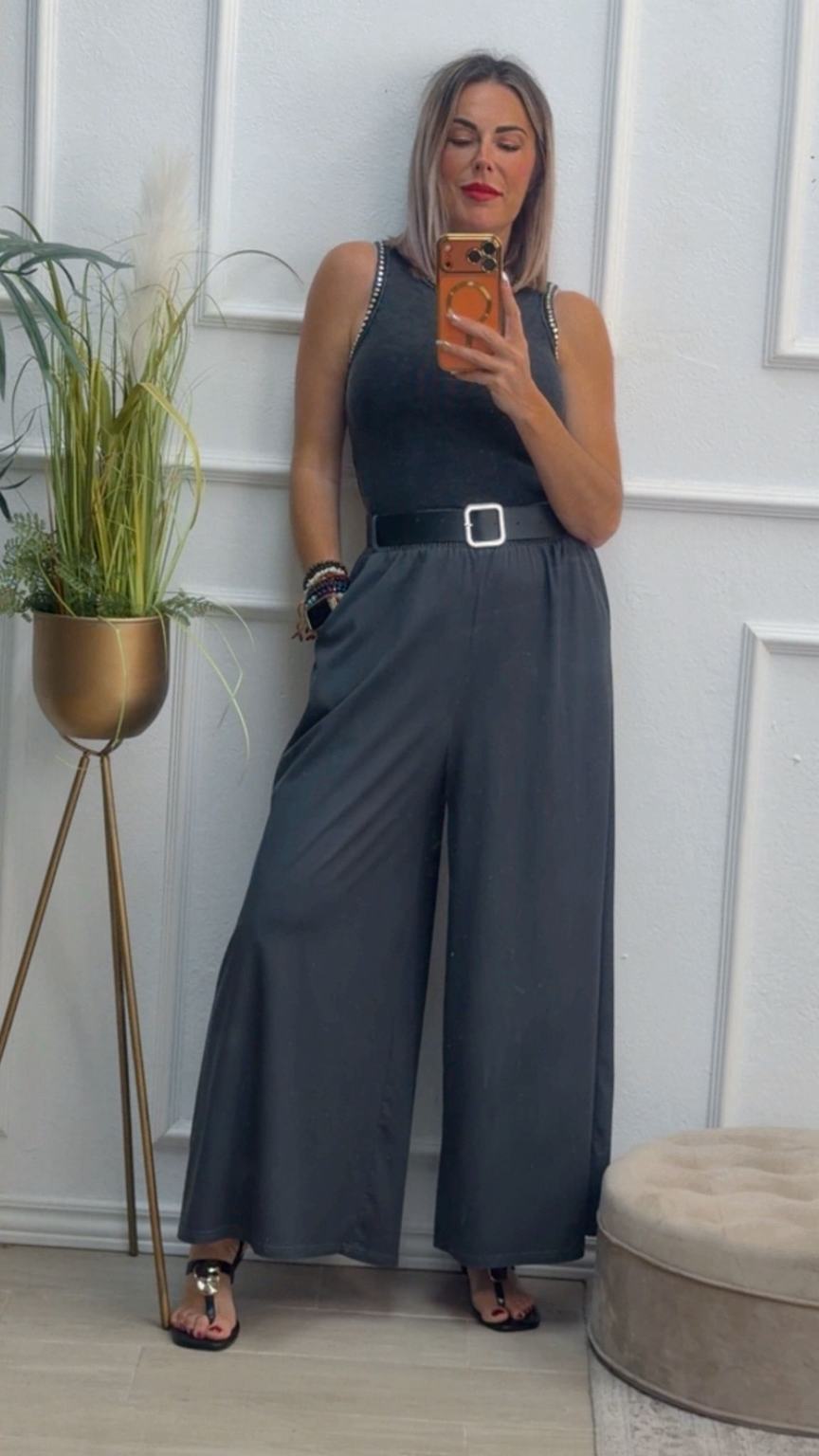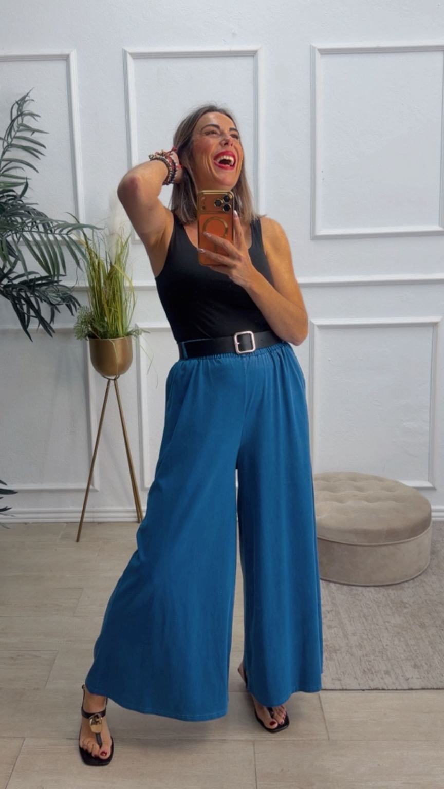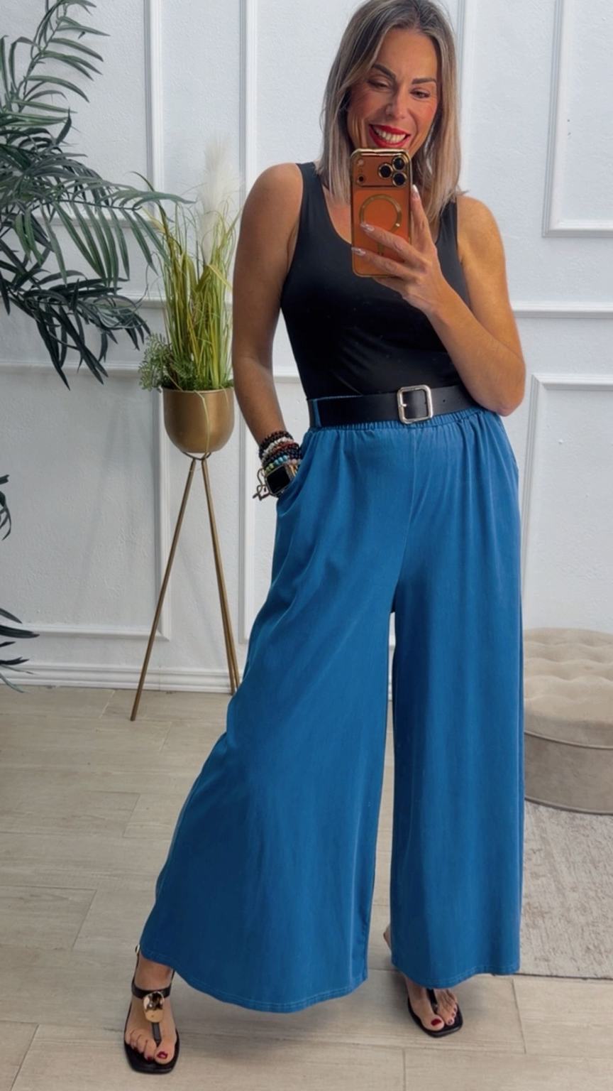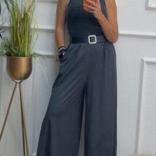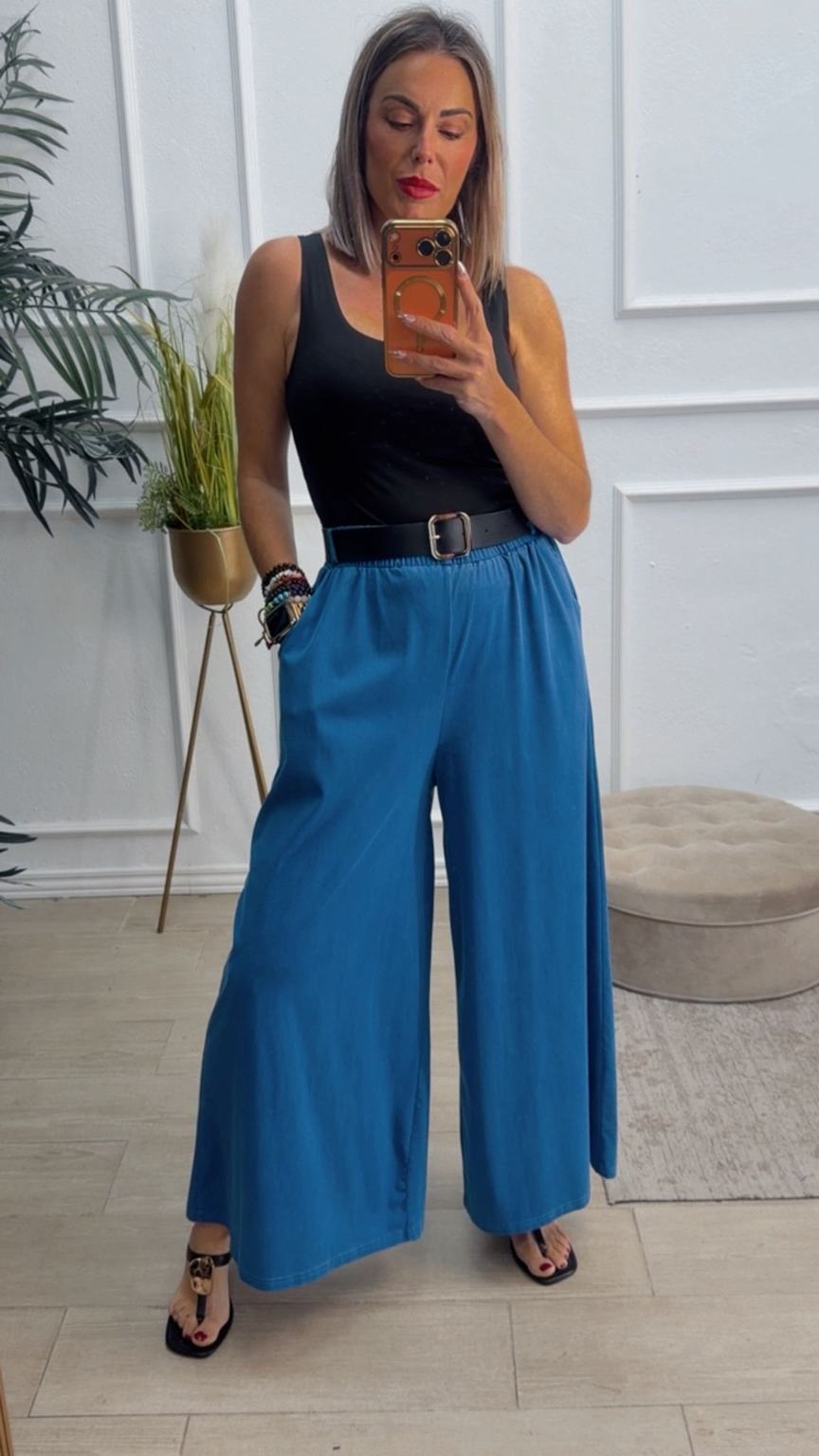 Pantalón de pata ancha con cinturilla elástica, tiene bolsillos e incluye cinturón.