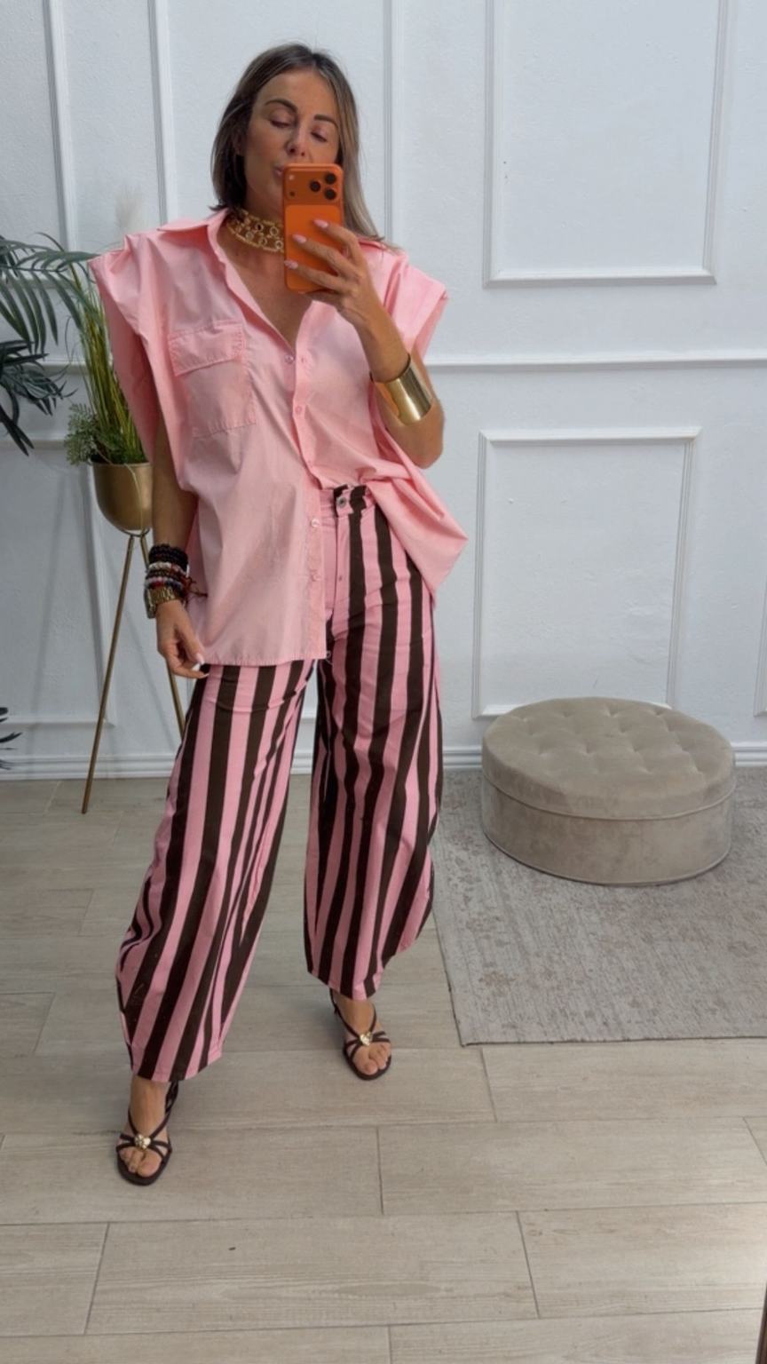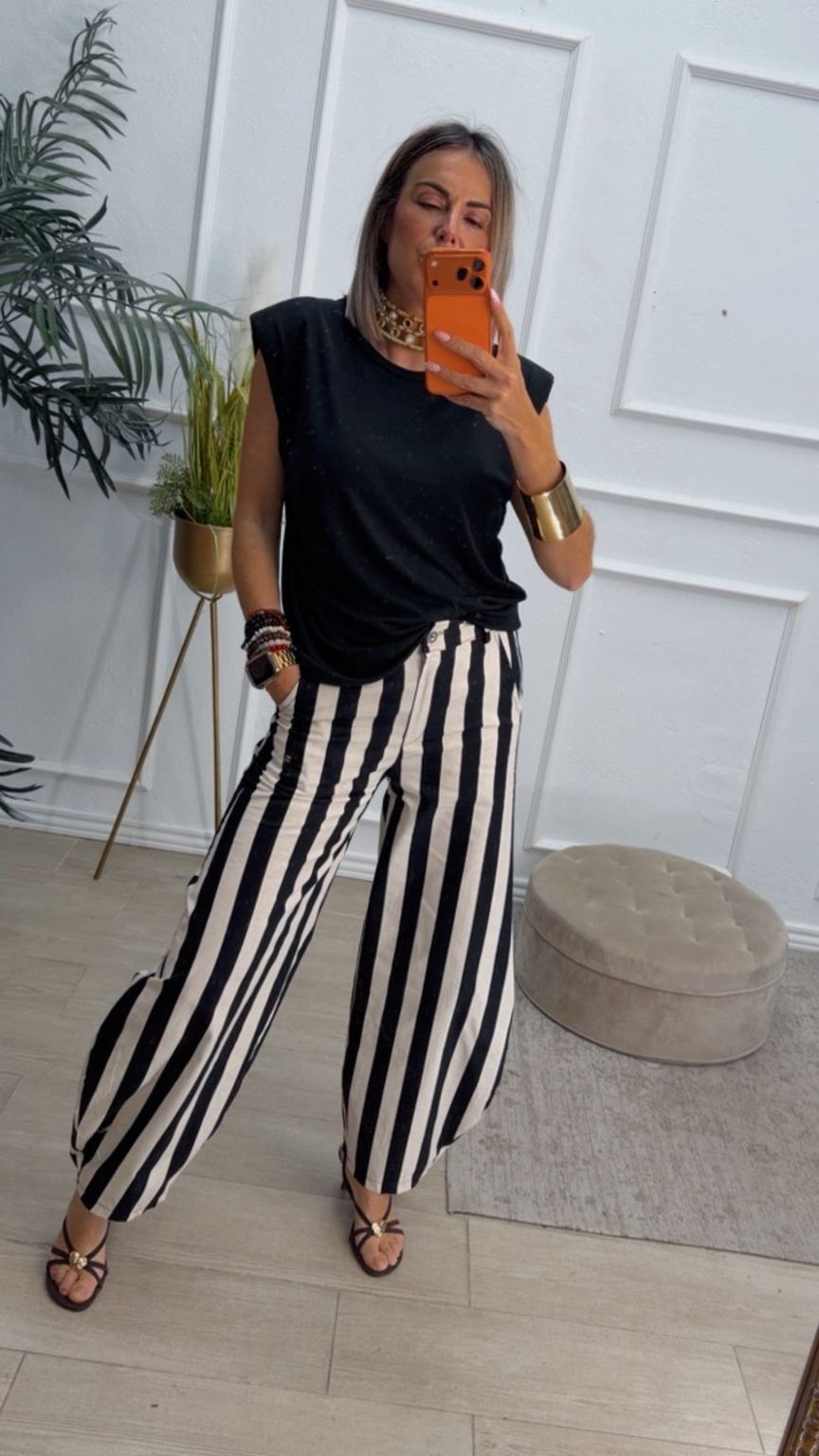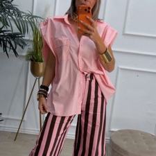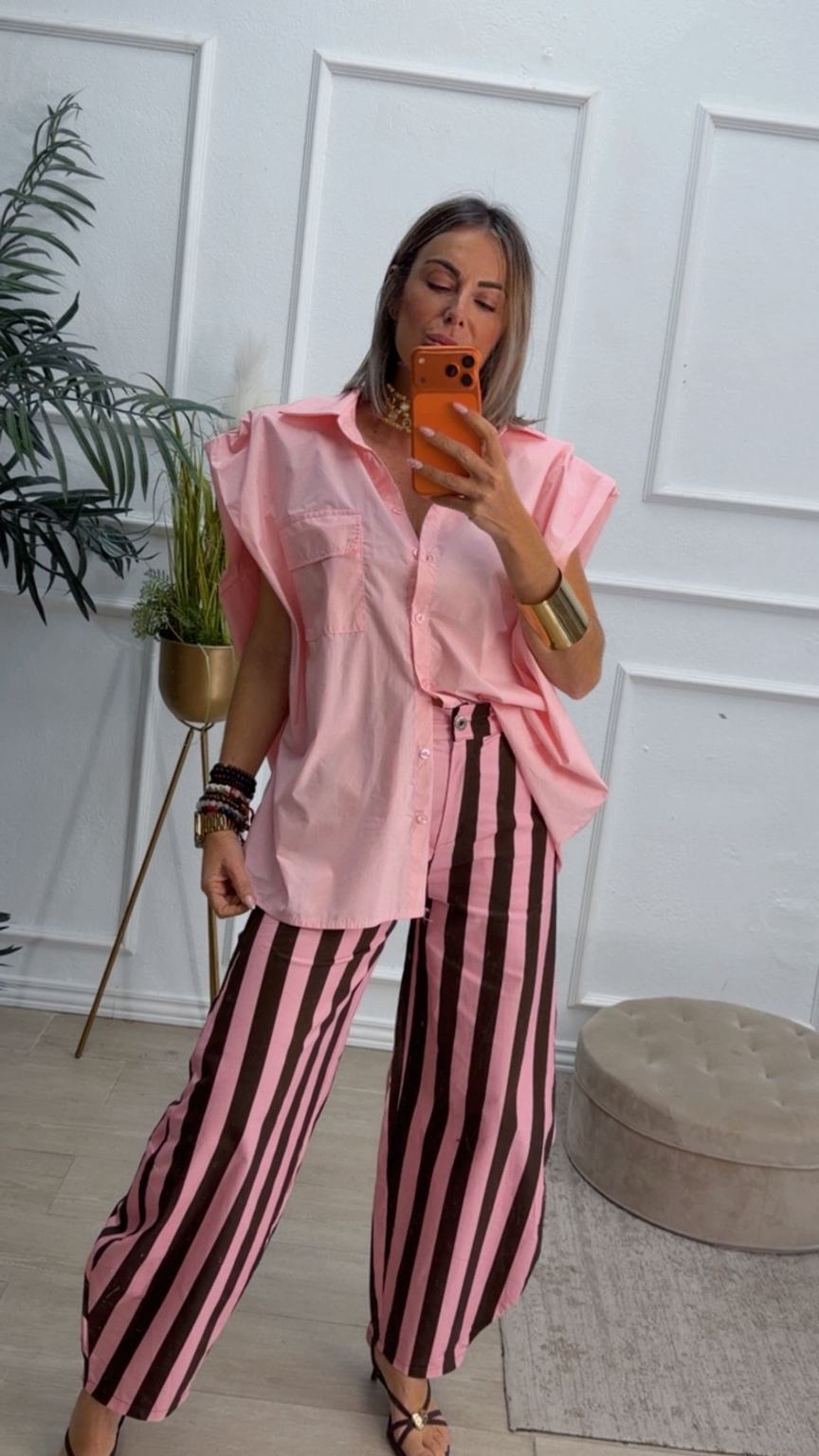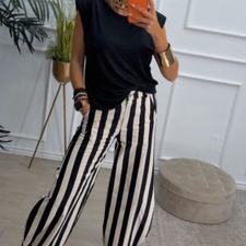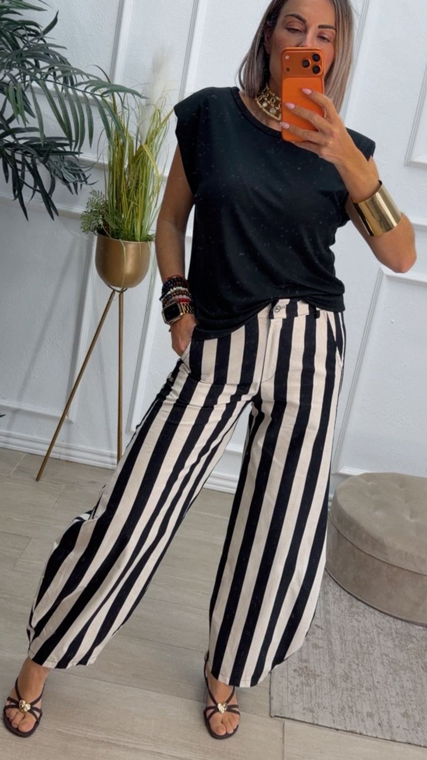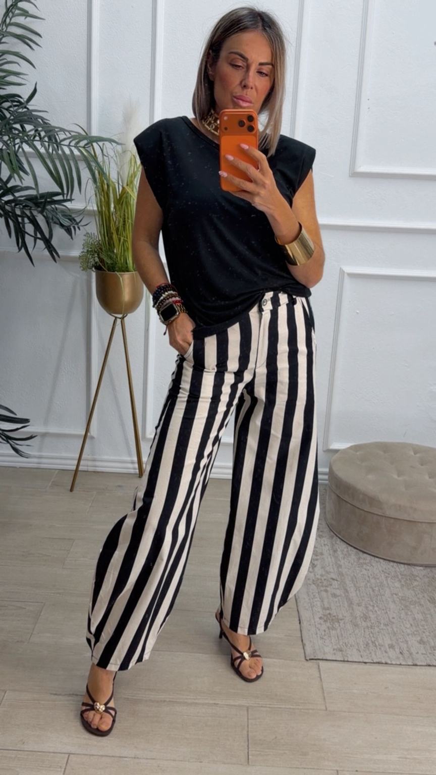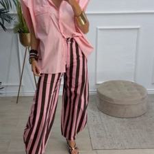 Pantalón balloum de rayas, cinturilla con la parte de atrás elástica y cierre delante con botón y cremallera. Tiene bolsillos.