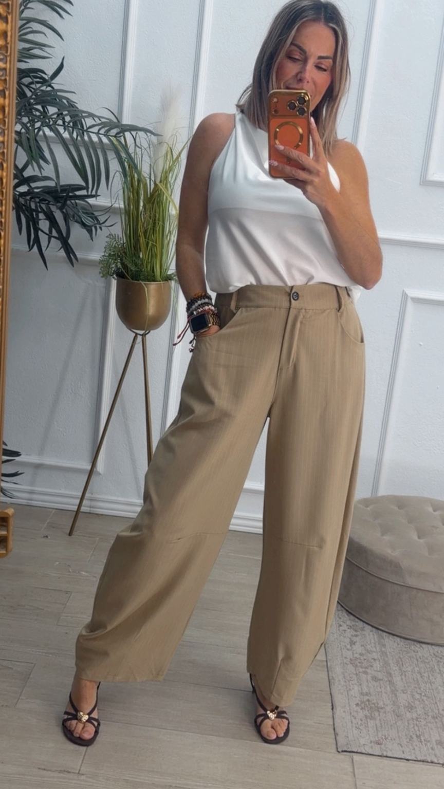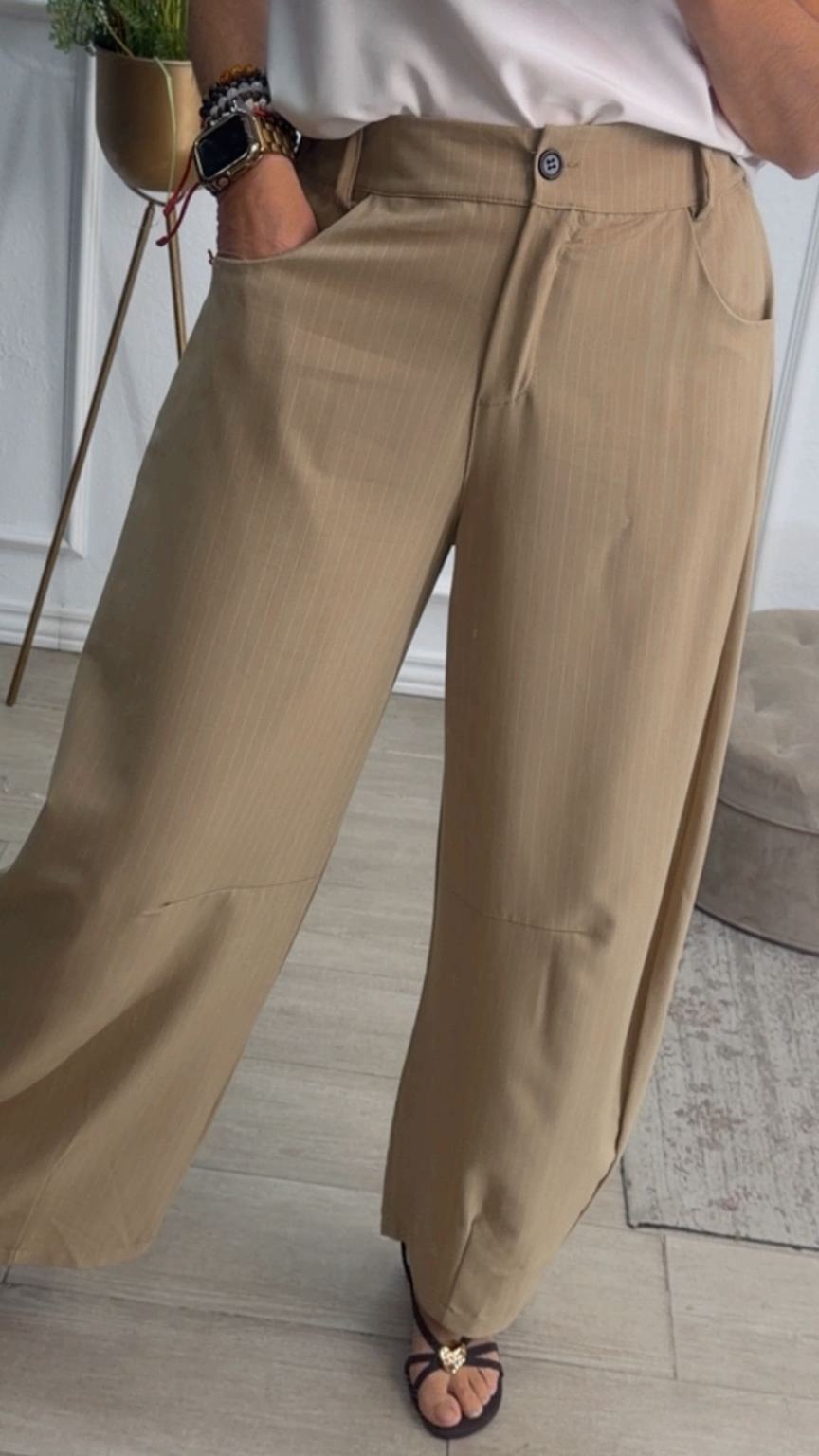 Pantalón tipo balloum de rayas, color beige. Tiene la parte de atrás de la cinturilla elástica, con cierre de botón y cremallera. Tiene bolsillos.