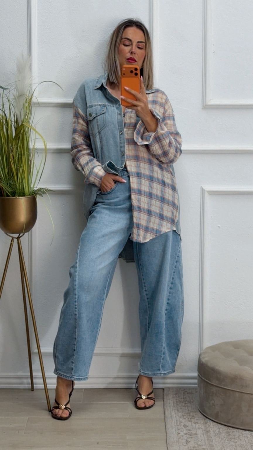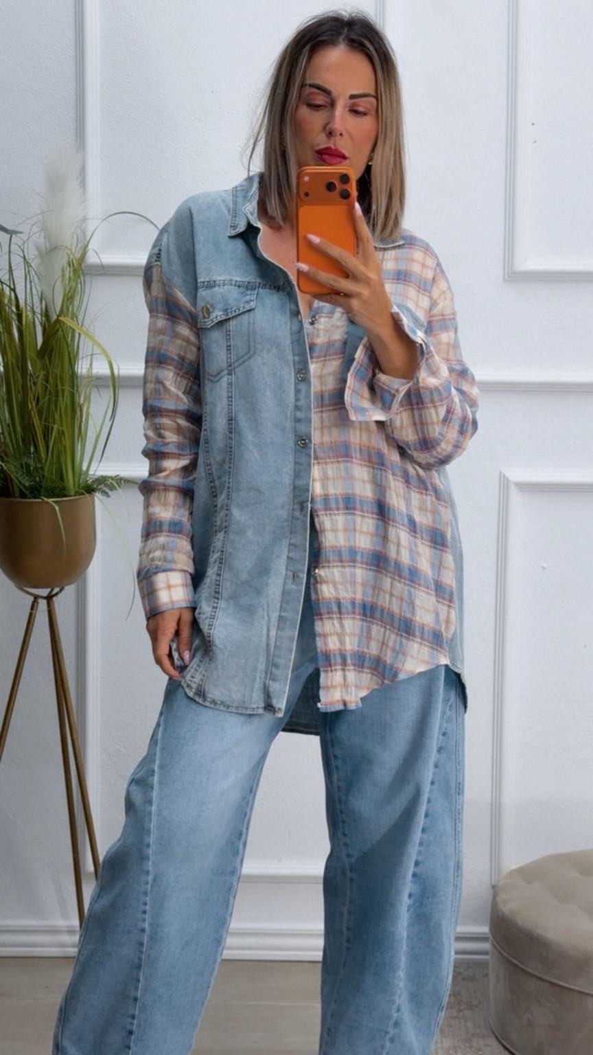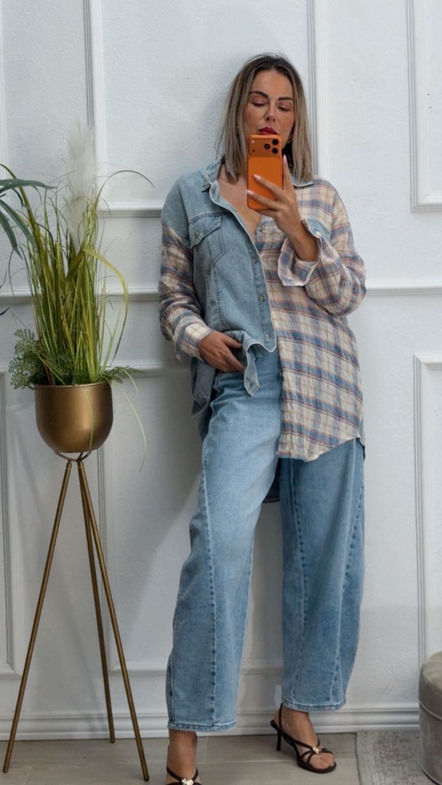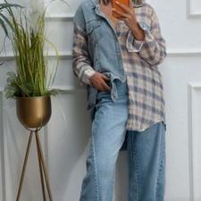 Sobrecamisa vaquera y de cuadros, tiene cierre de botones delante. Un poco más larga por detrás que por delante.