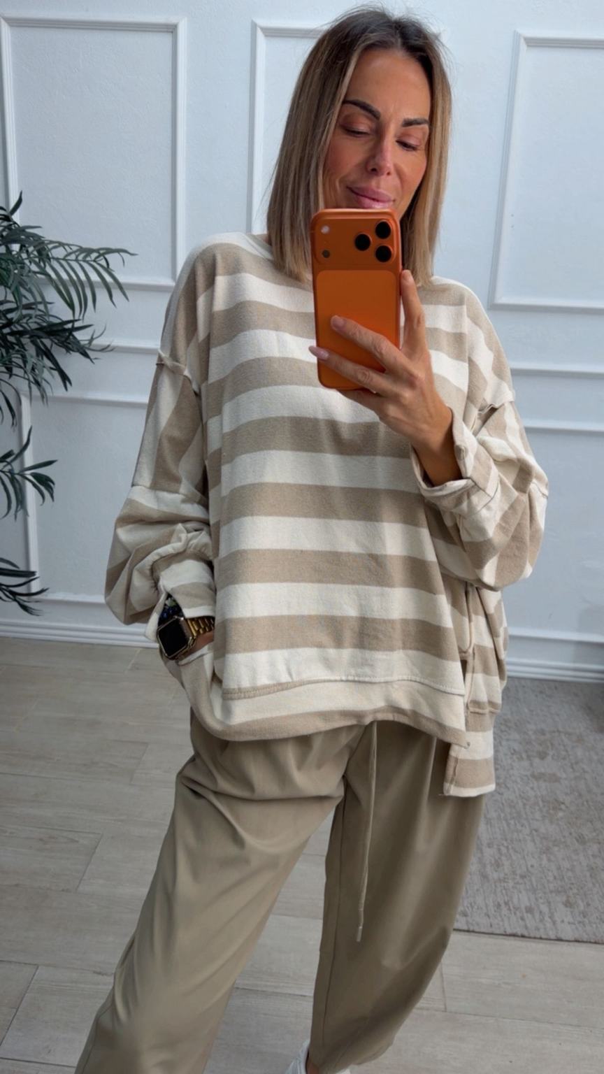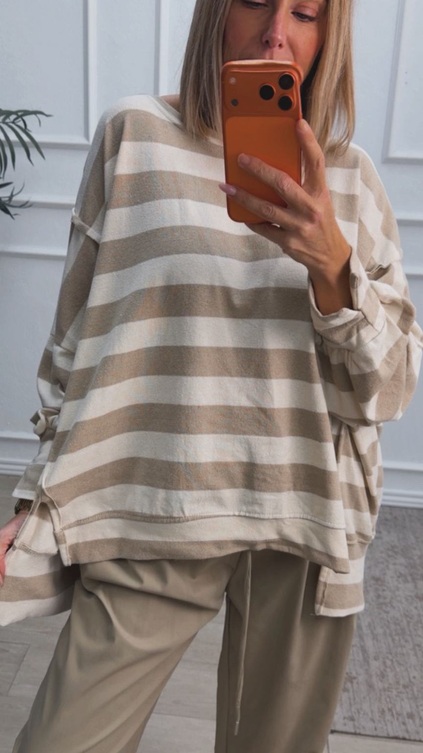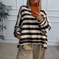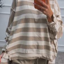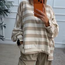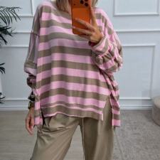 Sudadera oversize de rayas, con escote redondo. Tiene costuras laterales de adorno y aberturas. Disponibles en tono rosa (rosa con beige), marrón chocolate (marrón chocolate con beige) y beige (beige clarito con beige más oscuro).