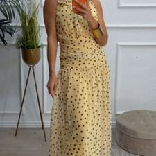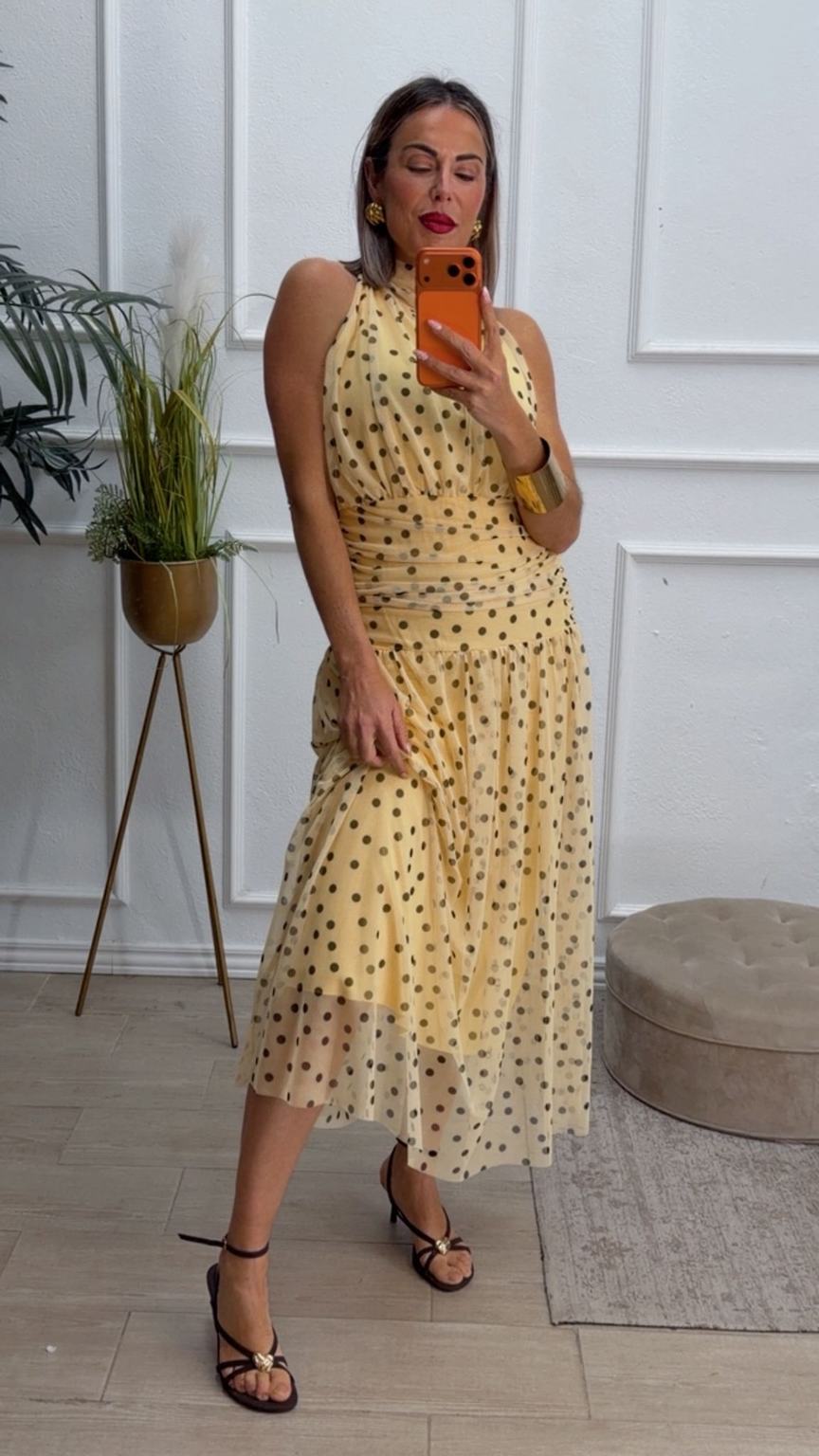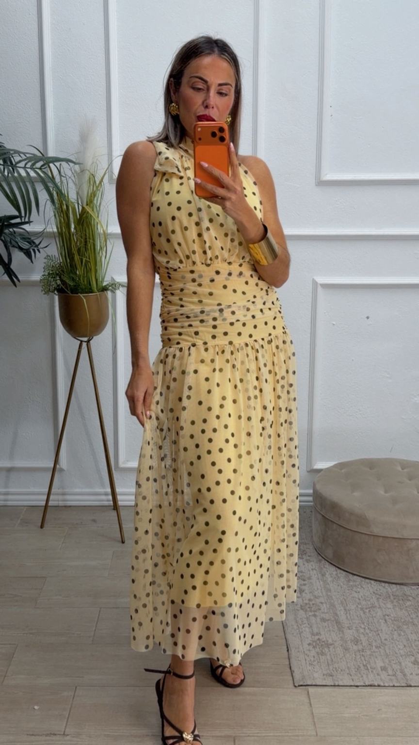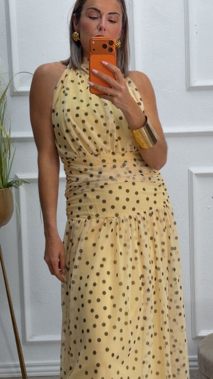 Vestido largo de lunares en color amarillo pastel y lunares marrón chocolate, sin mangas y ajustado en la cintura.