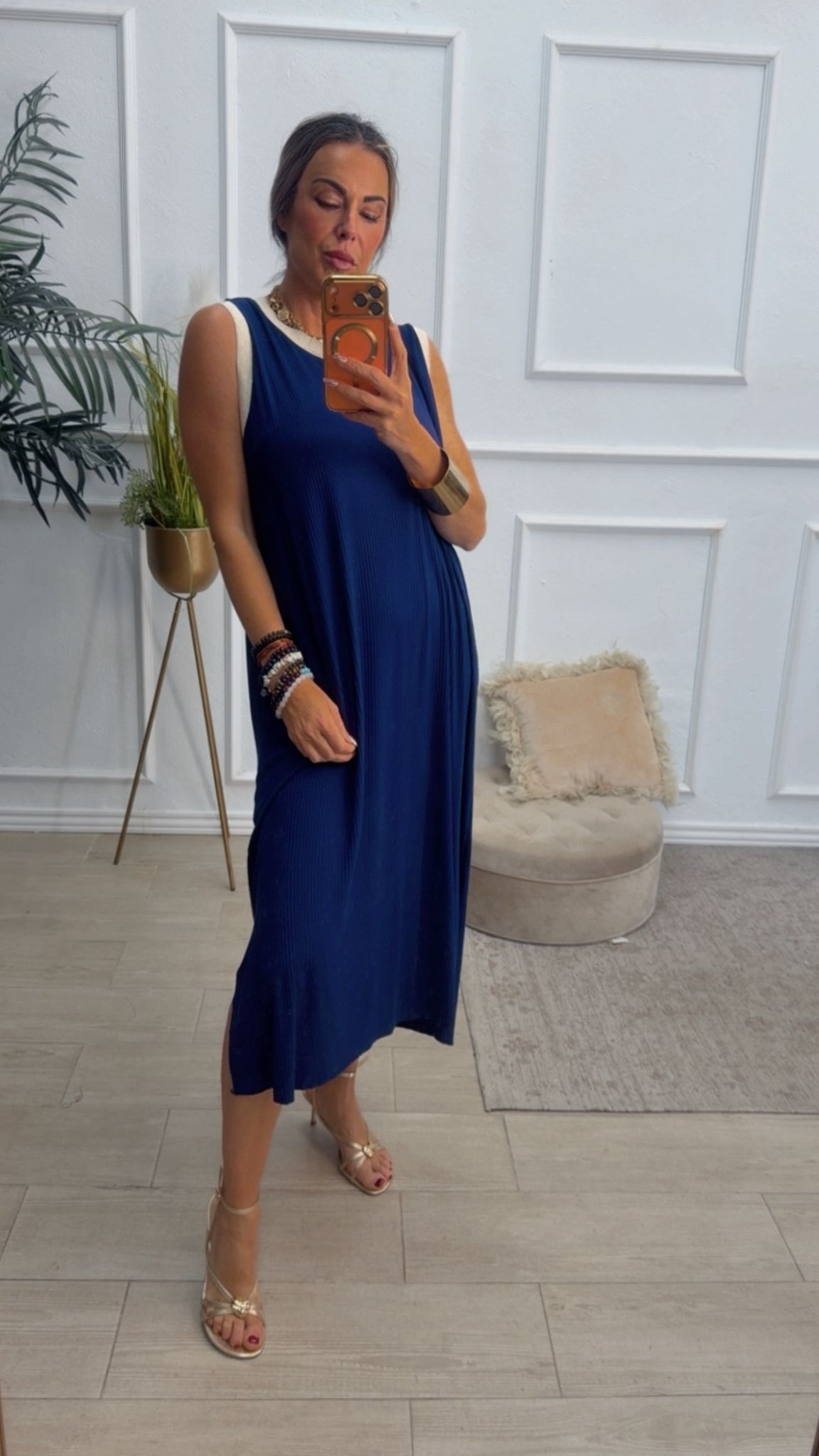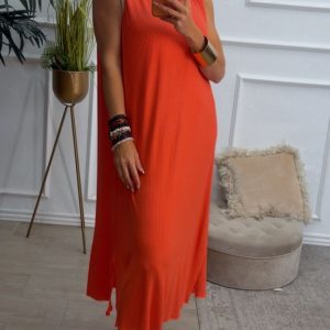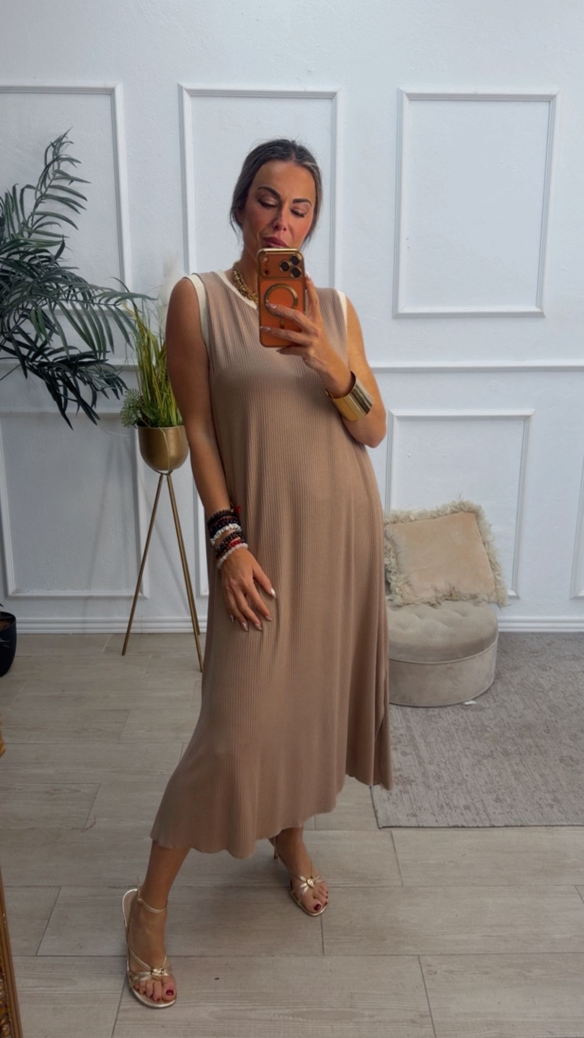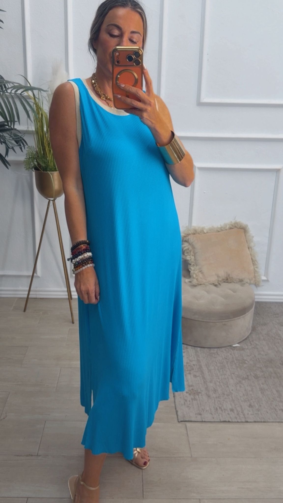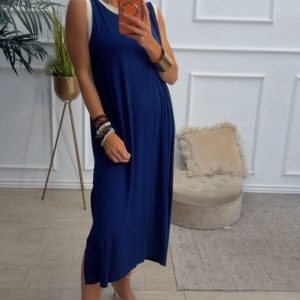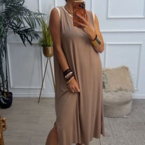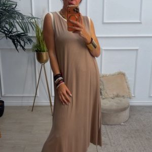 Vestido largo sin mangas, con escote redondo, tiene filito en color beige doradito en el escote y las mangas. Tiene dos aberturas laterales.