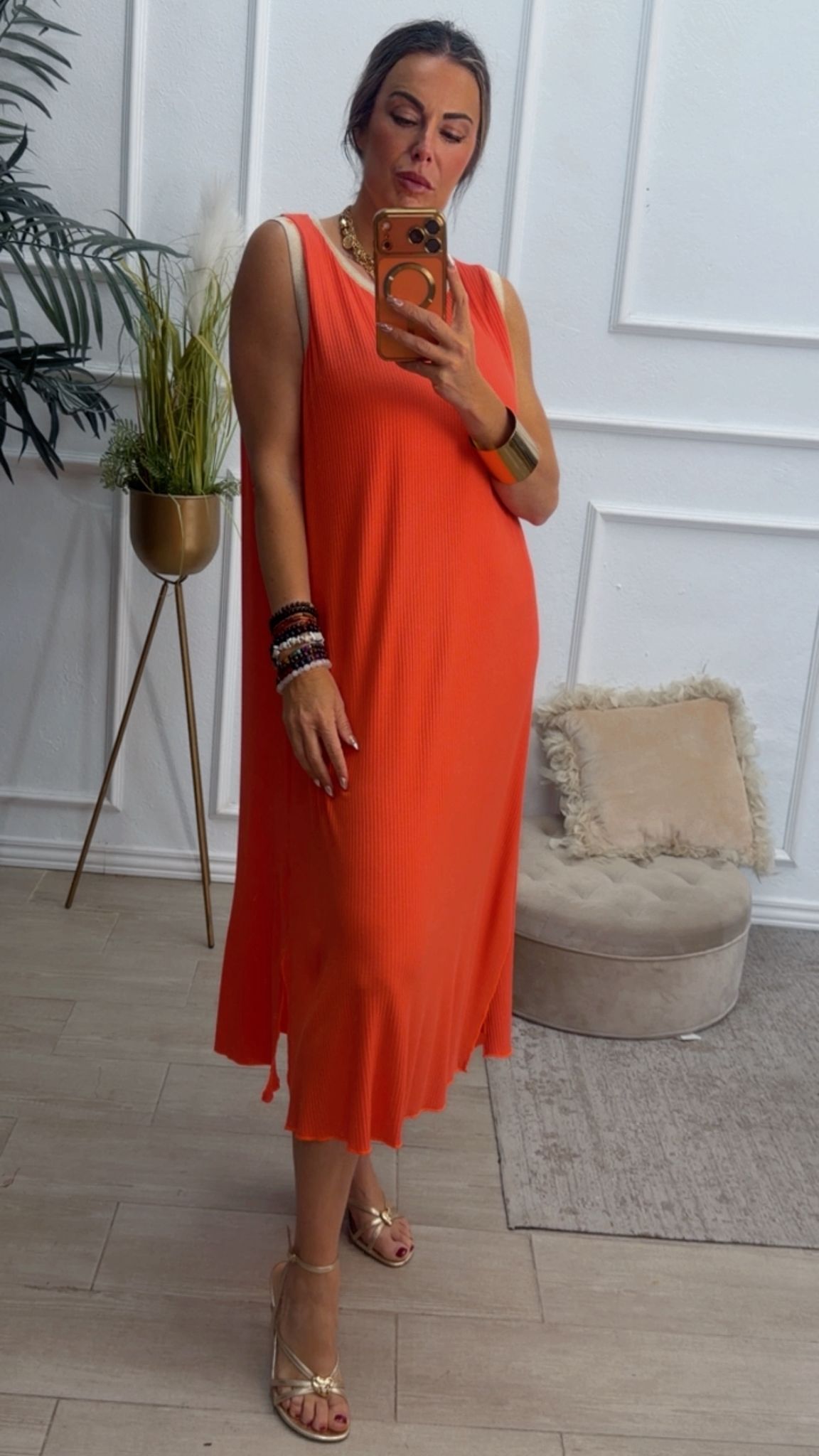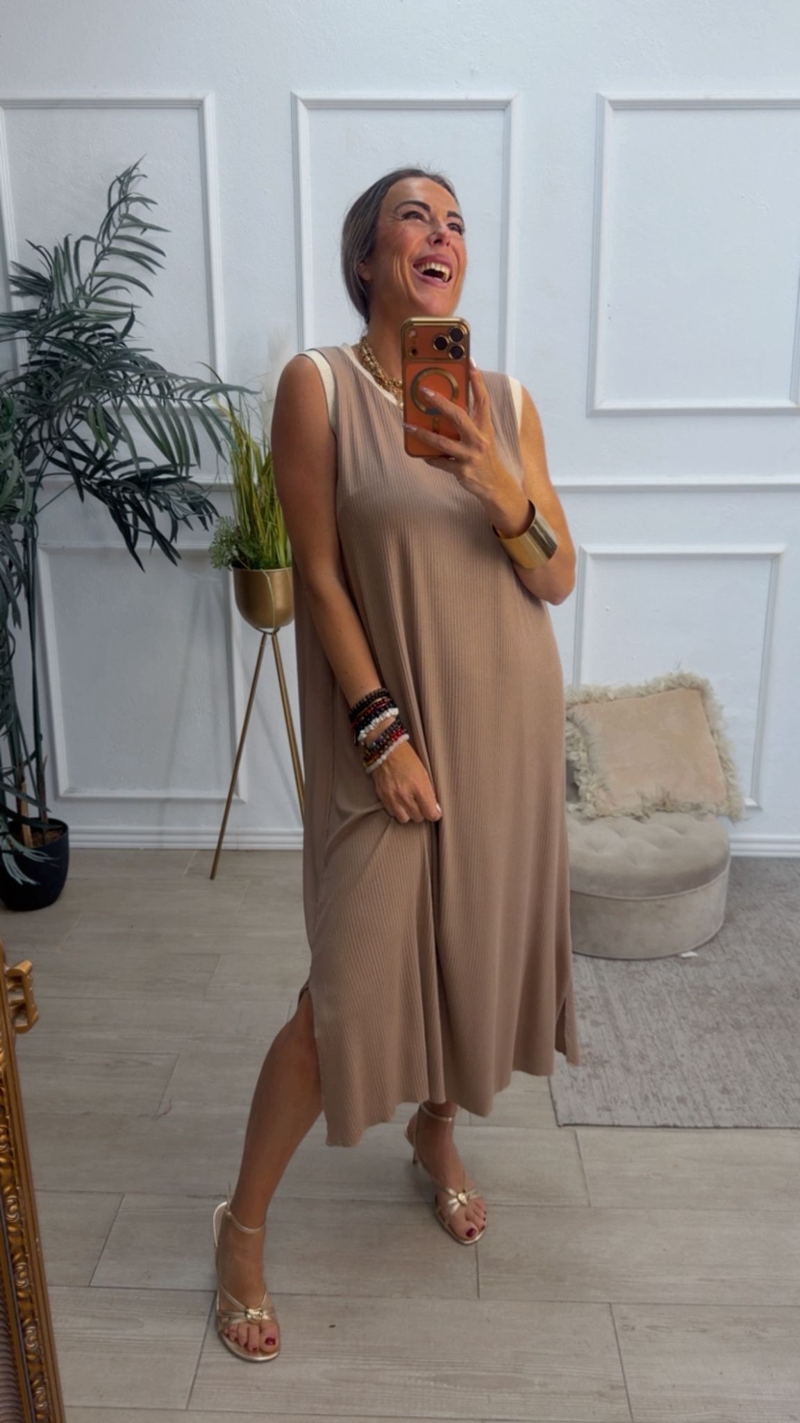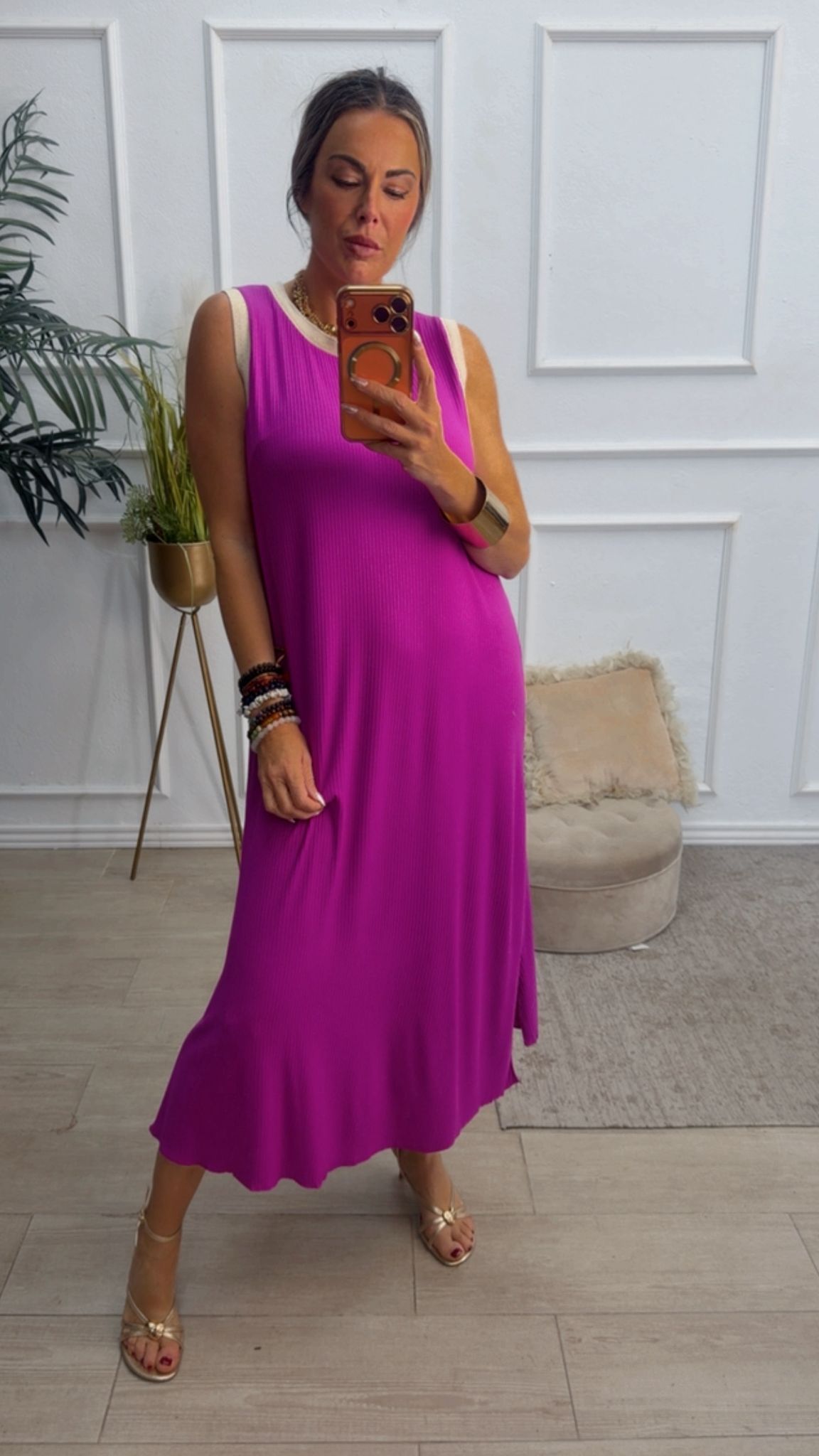 Vestido largo sin mangas, con escote redondo, tiene filito en color beige doradito en el escote y las mangas. Tiene dos aberturas laterales.